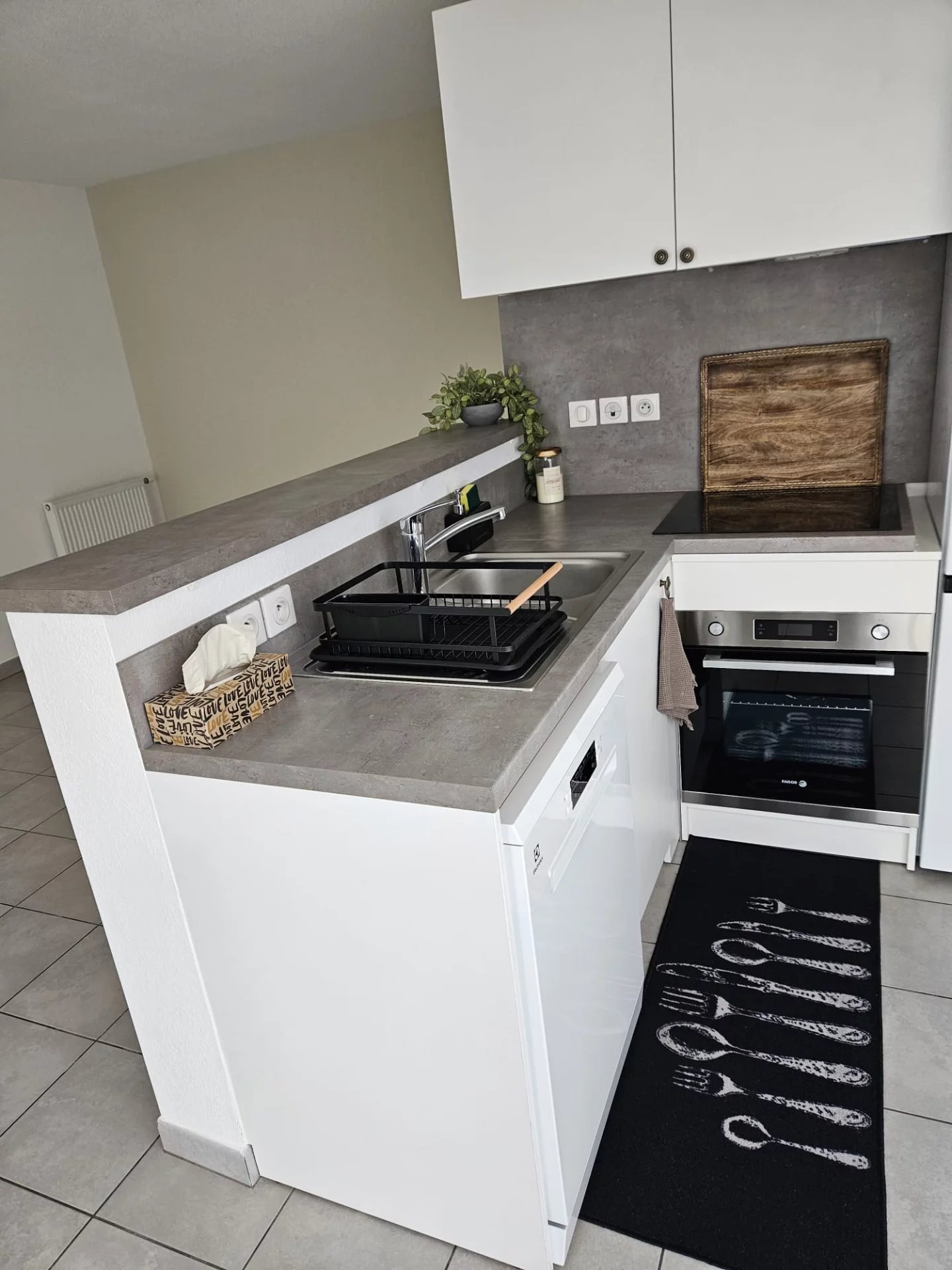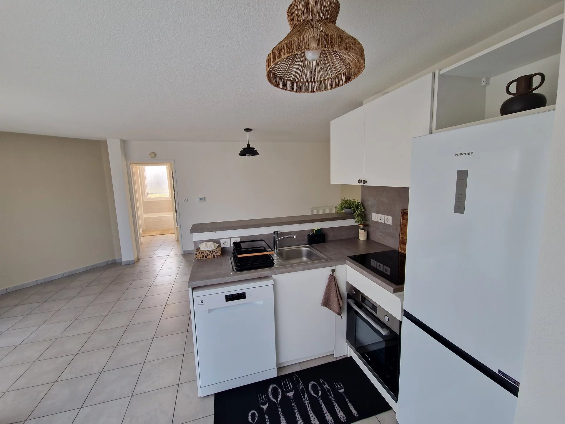 L’appartement se compose d’une entrée avec WC indépendant, d’une belle pièce de vie lumineuse ouvrant sur un balcon à la vue dégagée, et d’une cuisine moderne entièrement équipée (plaques induction, hotte, réfrigérateur/congélateur, lave-vaisselle), parfaitement adaptée à un rythme professionnel soutenu.