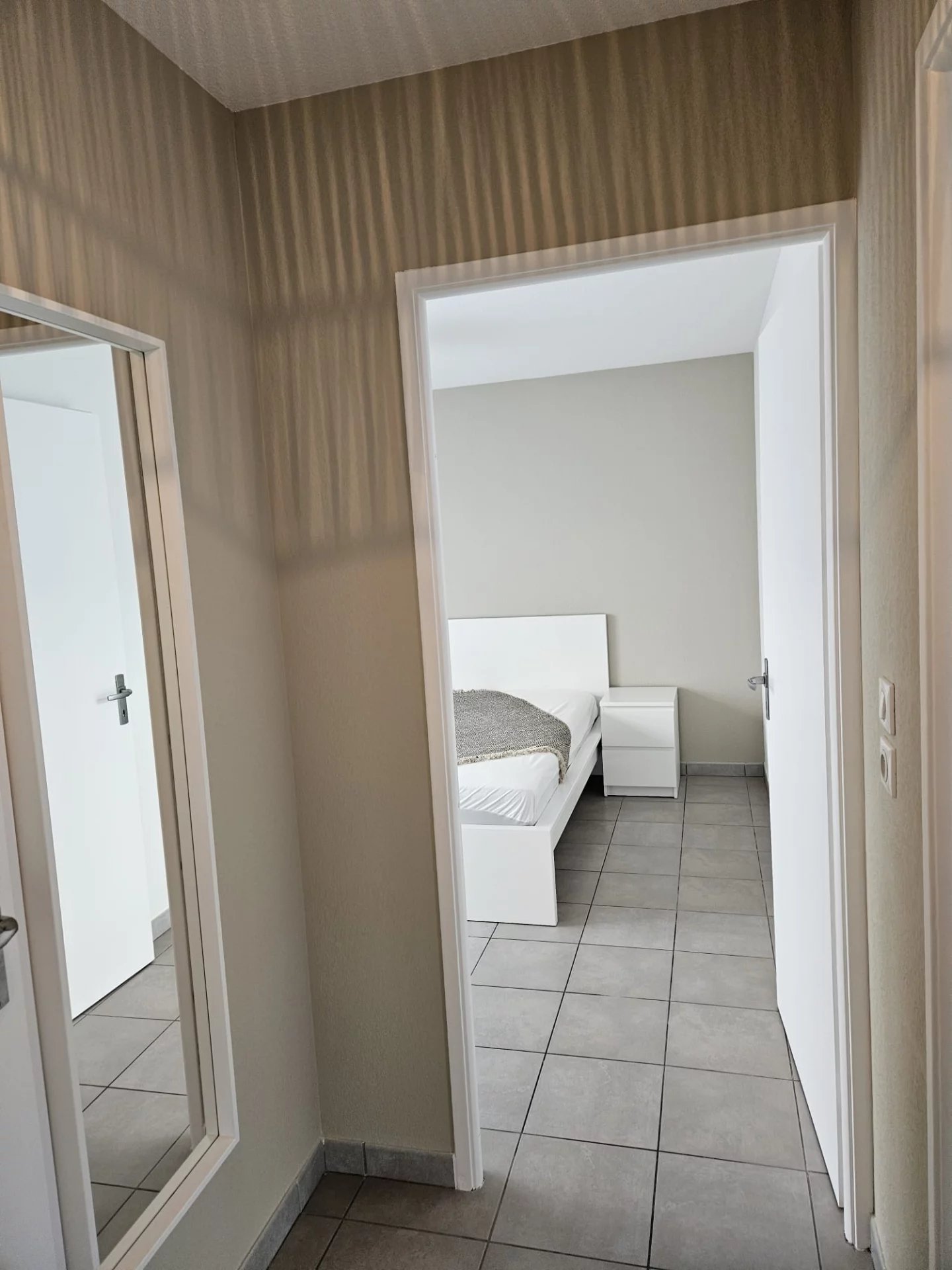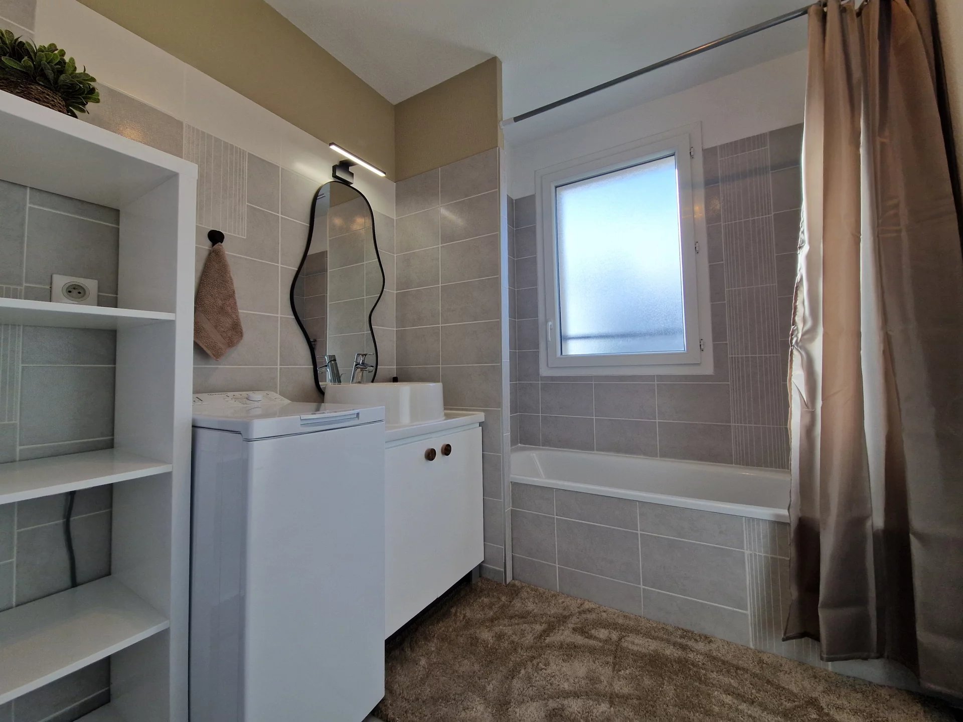 Le coin nuit, bien séparé, propose deux chambres avec rangements intégrés, ainsi qu’une salle de bains contemporaine, lumineuse et équipée d’un lave-linge.