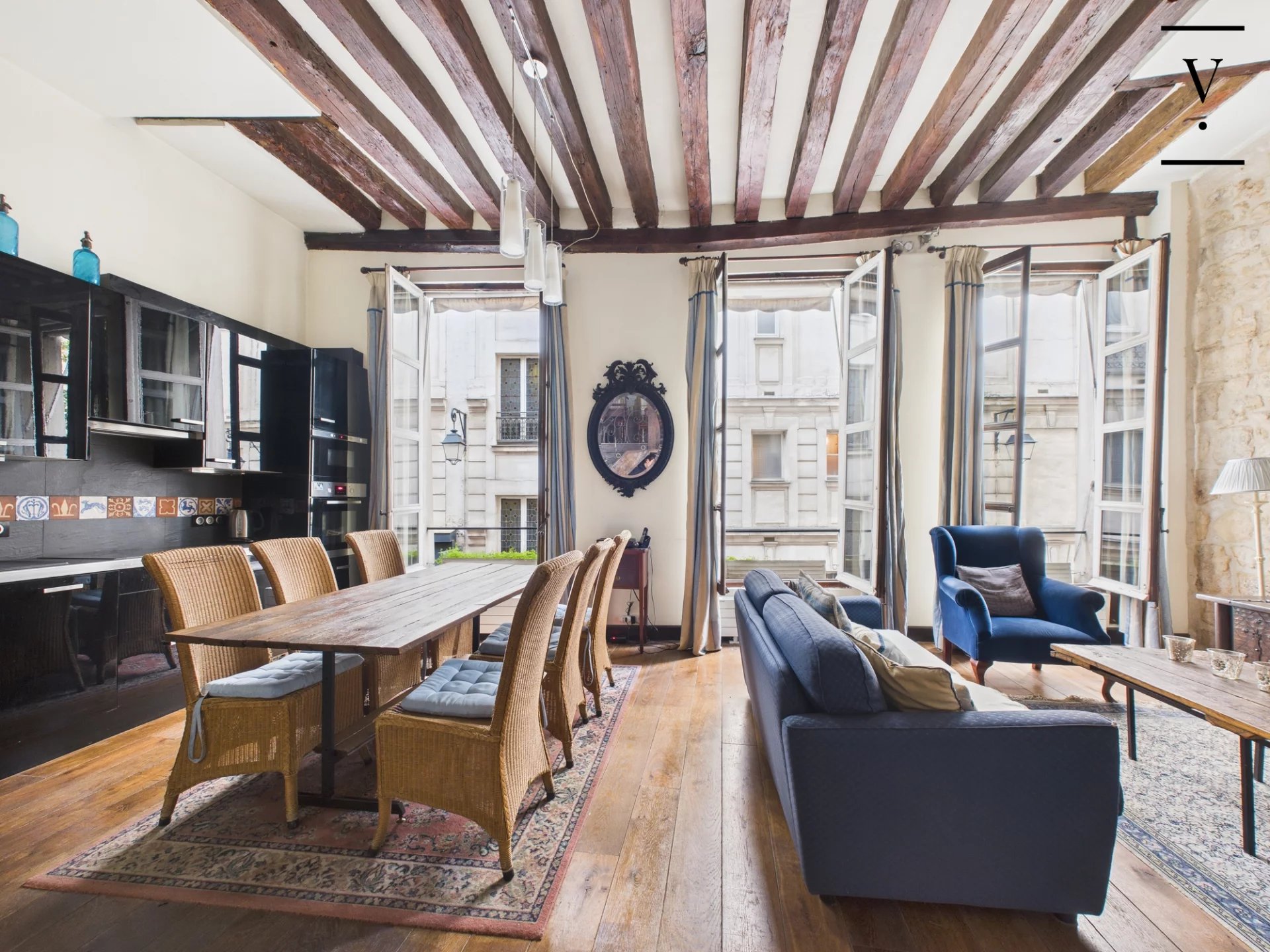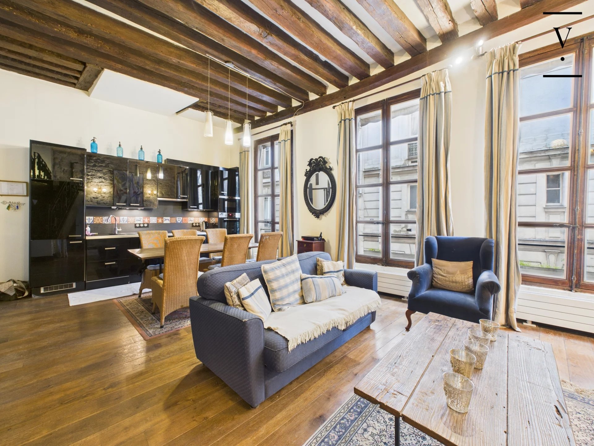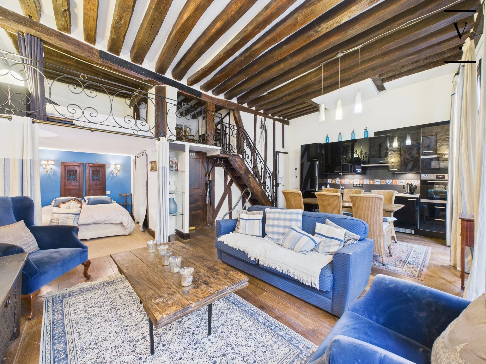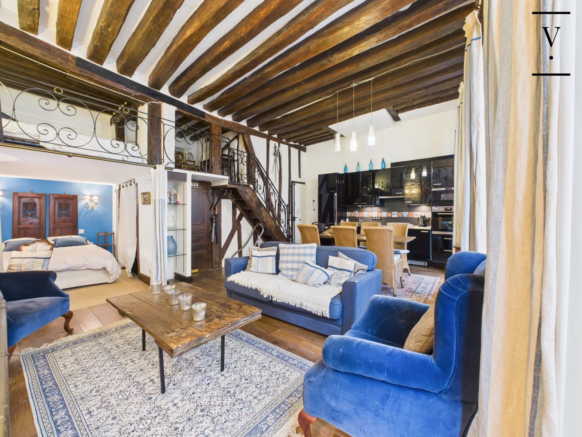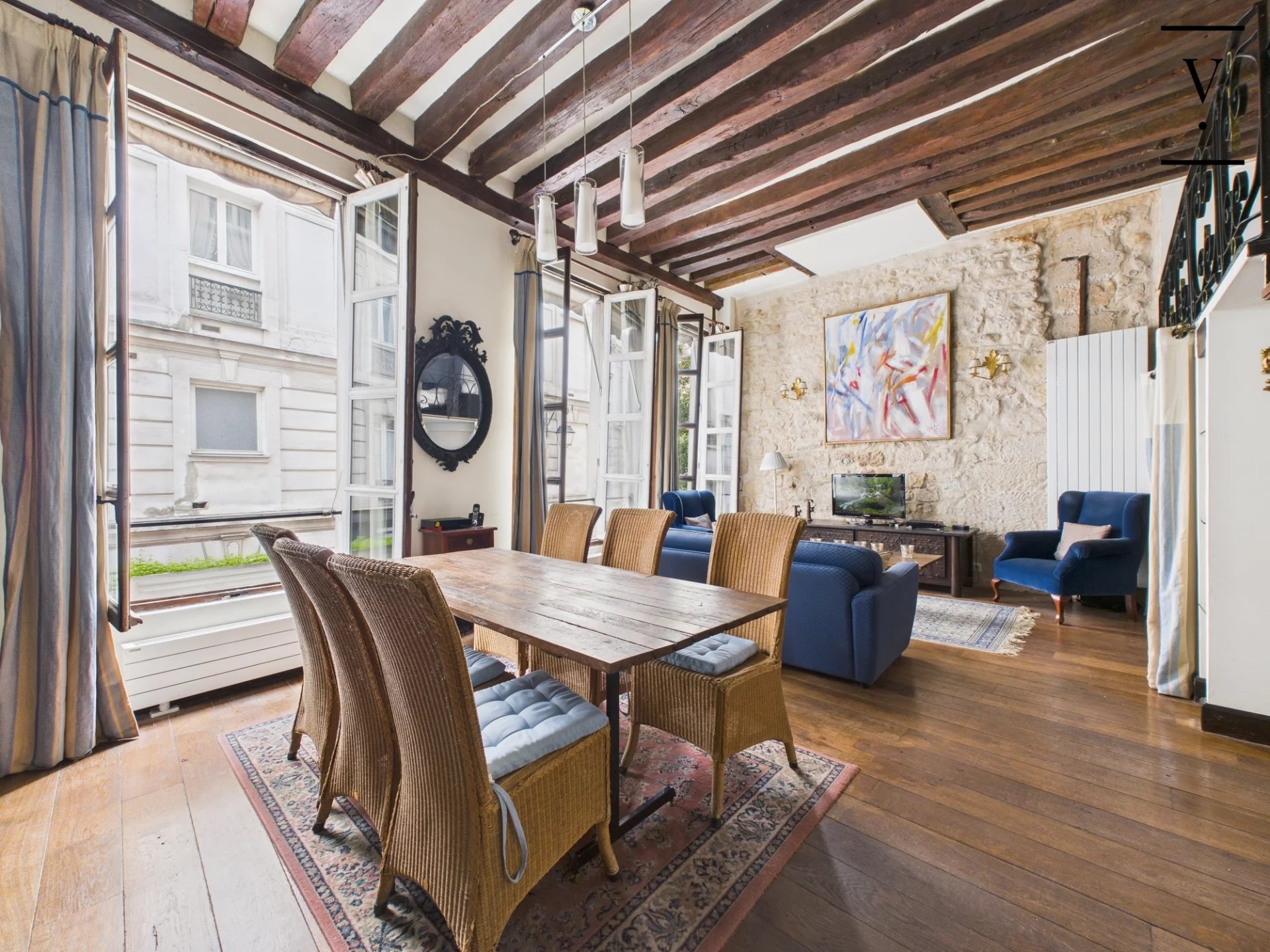 Rue des Trois Portes dans le quartier de la Sorbonne, à deux pas des quais de Seine et de Notre-Dame de Paris, un loft de charme de 50m², poutres, cheminée, pierres apparentes. Situé à l'étage noble, il se compose d'un séjour/salle à manger lumineux avec ses trois grandes fenêtres sur rue, exposition ouest, belle hauteur sous plafond de 3.5 m, cuisine ouverte aménagée et équipée, deux chambres en alcôve, l'une au premier niveau, l'autre sur la mezzanine de 14 m², salle d'eau avec toilettes. Une chambre de service de 6.60m² située à l'étage au-dessus complète ce bien. Loi Carrez 41 m², 14 m² de mezzanine, une chambre de service au 2nd étage de 6.60 m². Toiture neuve, cage d'escalier à rénover.