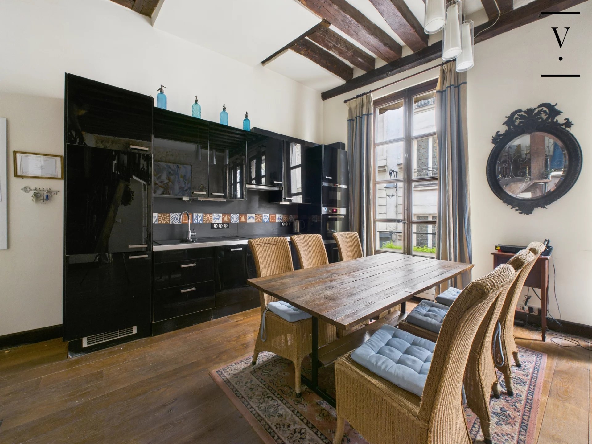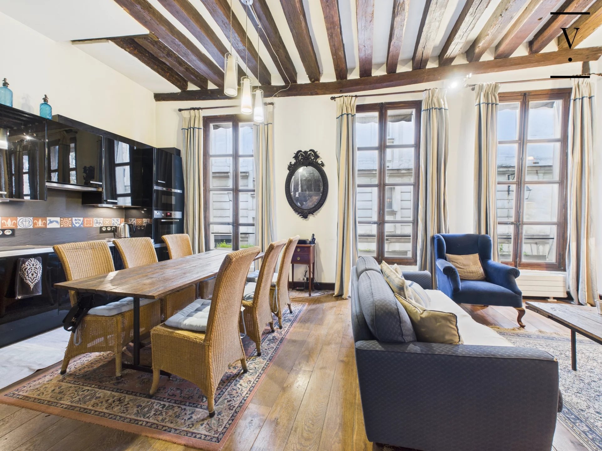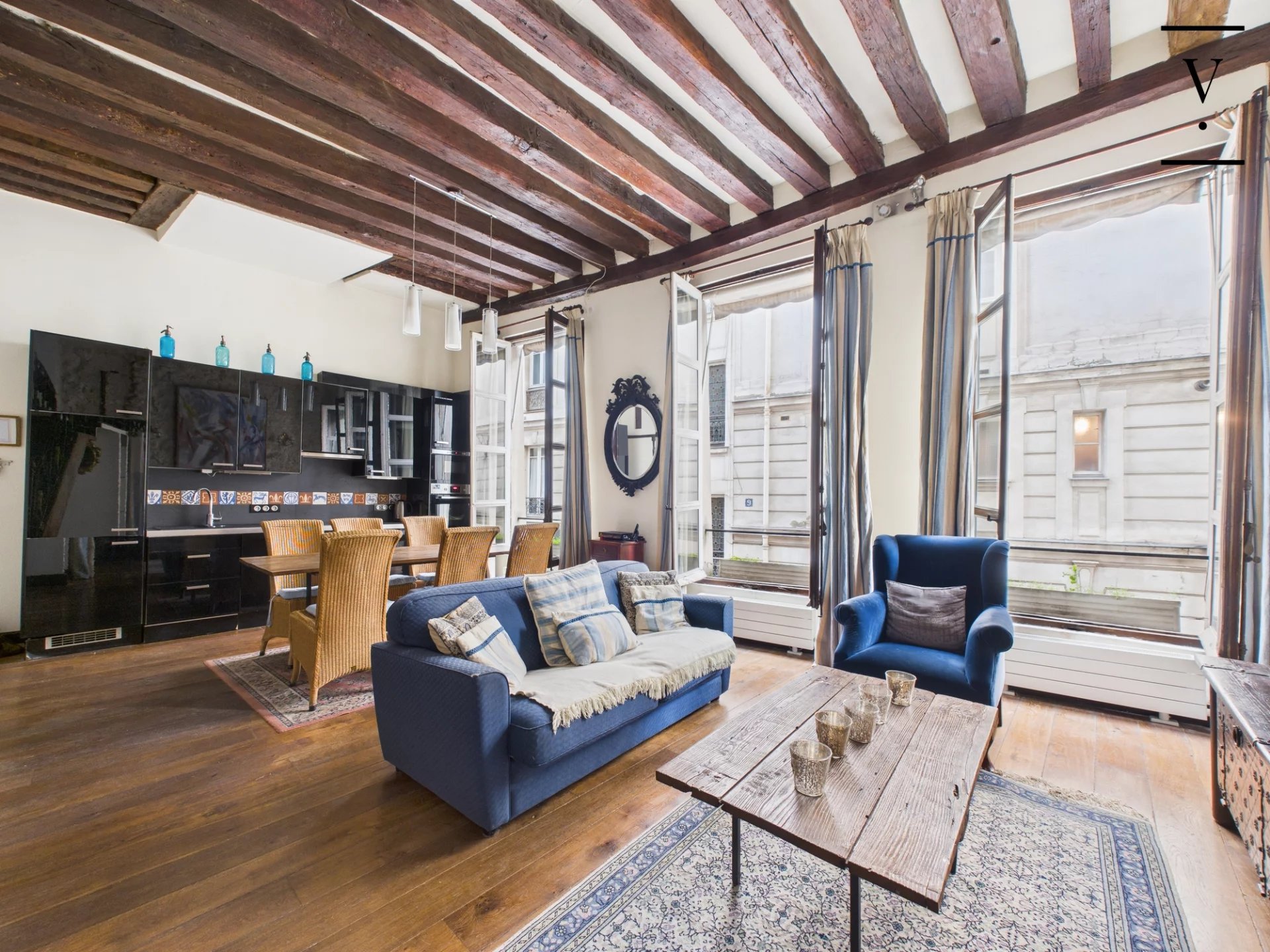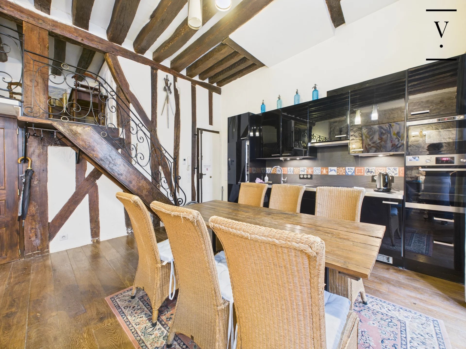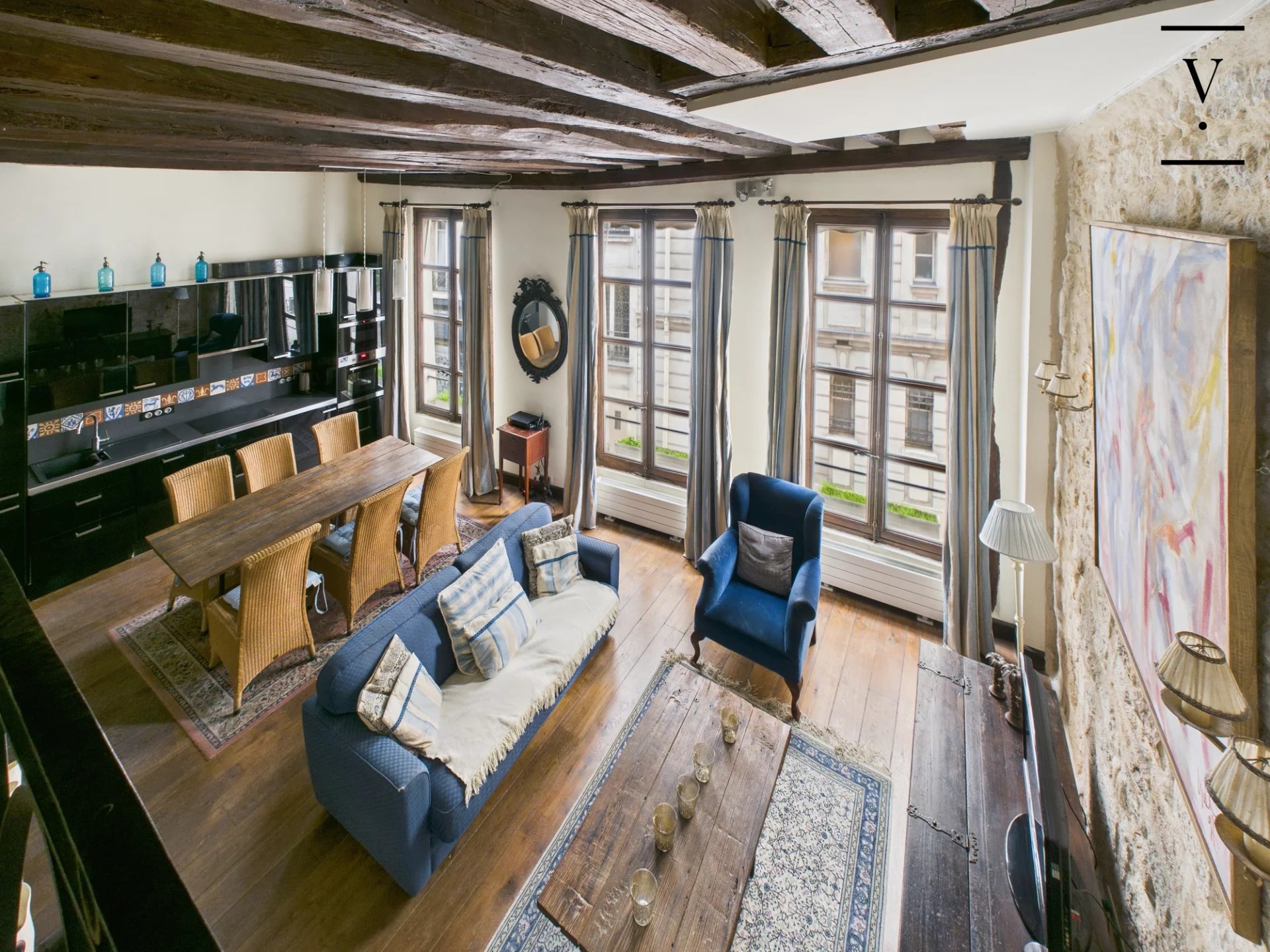 Rue des Trois Portes dans le quartier de la Sorbonne, à deux pas des quais de Seine et de Notre-Dame de Paris, un loft de charme de 50m², poutres, cheminée, pierres apparentes. Situé à l'étage noble, il se compose d'un séjour/salle à manger lumineux avec ses trois grandes fenêtres sur rue, exposition ouest, belle hauteur sous plafond de 3.5 m, cuisine ouverte aménagée et équipée, deux chambres en alcôve, l'une au premier niveau, l'autre sur la mezzanine de 14 m², salle d'eau avec toilettes. Une chambre de service de 6.60m² située à l'étage au-dessus complète ce bien. Loi Carrez 41 m², 14 m² de mezzanine, une chambre de service au 2nd étage de 6.60 m². Toiture neuve, cage d'escalier à rénover.