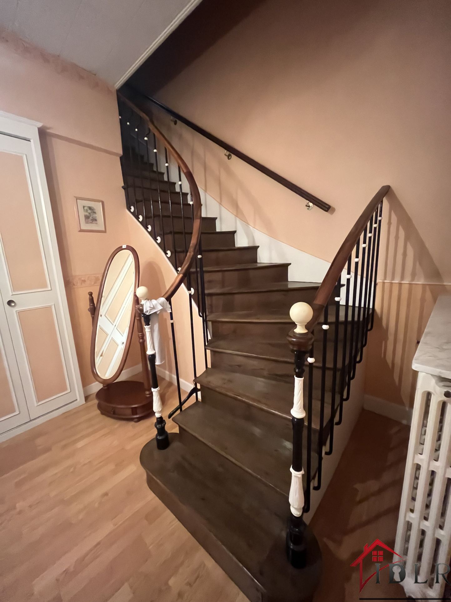 Un escalier en chêne, qui participe au charme général du bien, mène à l'étage où se trouvent deux chambres lumineuses ainsi qu'une salle de bains avec toilette, offrant un espace nuit paisible et bien séparé des pièces de vie.