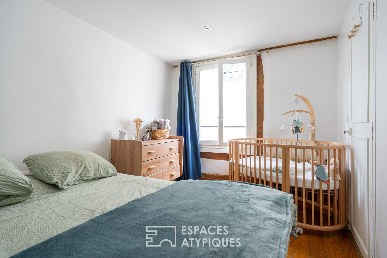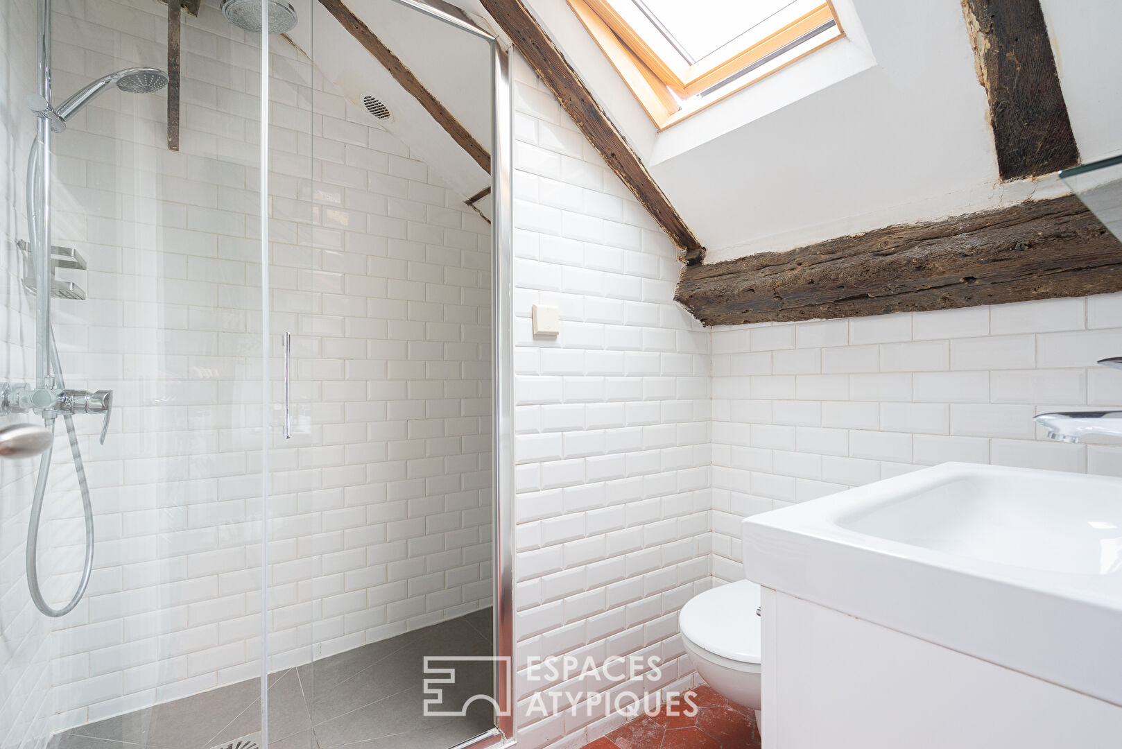 Situé au coeur du Haut-Marais, cet appartement de 46,63 m² Carrez (60 m² au sol) se trouve au cinquième et dernier étage d'un immeuble ancien bien entretenu. Avec ses poutres apparentes, son parquet en bois massif et ses tomettes d'origine, il offre tout le charme architectural typique du Marais. La lumière traversante et le calme absolu apportent une qualité de vie rare dans le quartier. L'entrée mène à une première pièce comprenant une cuisine semi-ouverte, équipée et optimisée avec un espace buanderie et de nombreux rangements sur mesure. L'ensemble est baigné de lumière grâce à un grand ouvrant de toit exposé plein sud. Le séjour de 25 m² s'étend derrière une verrière atelier qui dialogue élégamment avec les matériaux anciens. Une grande bibliothèque sur mesure structure l'espace et apporte une touche contemporaine parfaitement intégrée. Côté nuit, une chambre de 11,42m2 prend place au fond de l'appartement, entièrement au calme sur cour. Une salle d'eau avec WC complète l'ensemble. Ce bien rare, idéalement situé à deux pas de la rue de Bretagne, du Marché des Enfants Rouges, du Square du Temple et de nombreuses adresses prisées du Marais, bénéficie de tous les atouts du quartier : commerces de bouche, cafés, restaurants et vie culturelle. Les stations Temple et République, toutes proches, facilitent l'accès à l'ensemble de Paris. Bien soumis au statut de la copropriété. Métro : Temple, République. CLASSE ENERGIE : G/ CLASSE CLIMAT : G. Montant moyen estimé des dépenses annuelles d'énergie pour un usage standard, indexées aux années 2021, 2022, 2023 : entre 1940 euros et 2680 euros (abonnement compris). Les informations sur les risques auxquels ce bien est exposé sont disponibles sur le site Géorisques : https://www.georisques.gouv.fr. Contact : Magaly 06 63 16 83 32 RSAC : 908 772 452 PARIS Copropriété de 22 lots - dont 20 lots habitation. (Pas de procédure en cours). Charges annuelles : 1268 euros. Magaly Leygnac (EI) Agent Commercial - Numéro RSAC : 908 772 452 - Paris.