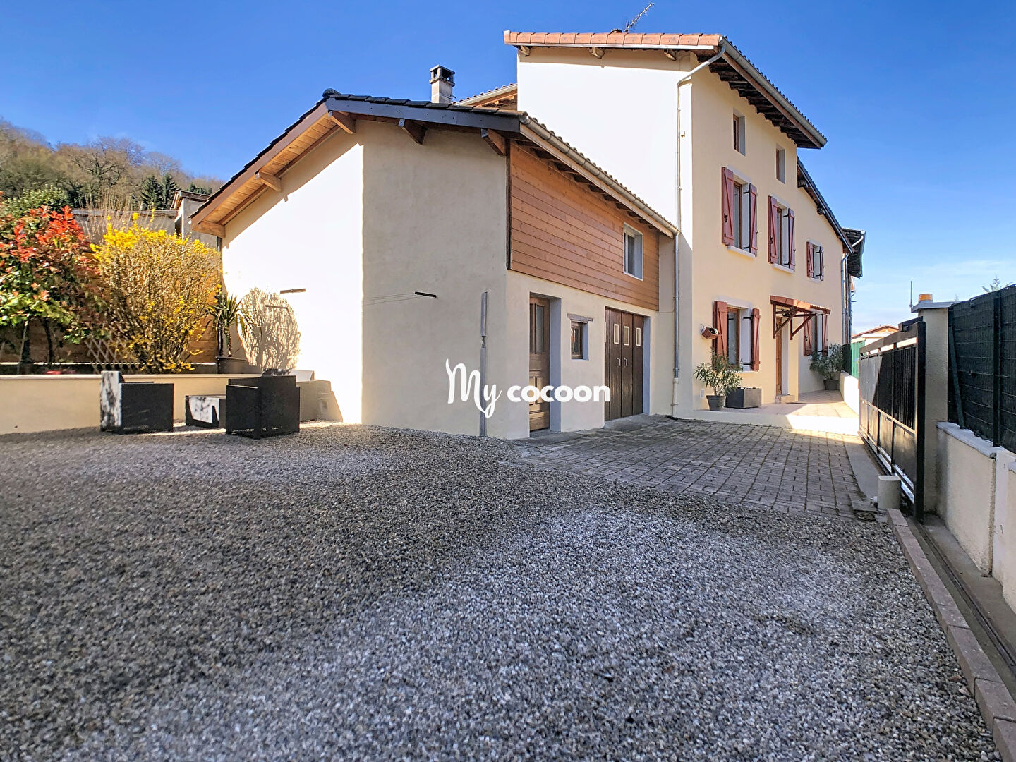 My Cocoon l'agence aux honoraires fixes 2% vous présente en exclusivité: Sur la commune de Château-Gaillard, aux Ravinelles, à 5mn de l'entrée d'autoroute et à 40 min de Lyon, dans un lotissement, au calme, venez découvrir cette maison de 2014 mitoyenne d'un côté T5 sur sa parcelle de 349 m². D'une superficie de 104 m² environ, elle se compose au rez-de-chaussée d'une entrée avec placard de rangement suivie d'une pièce de vie avec salon - séjour permettant l'accès au jardin