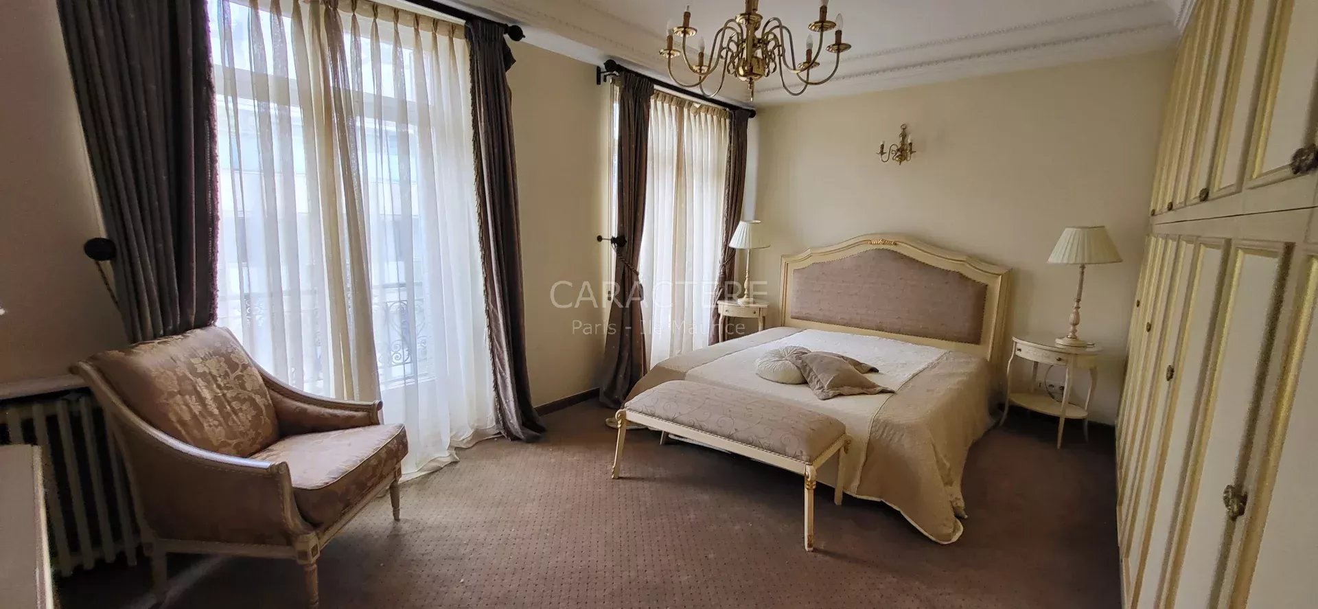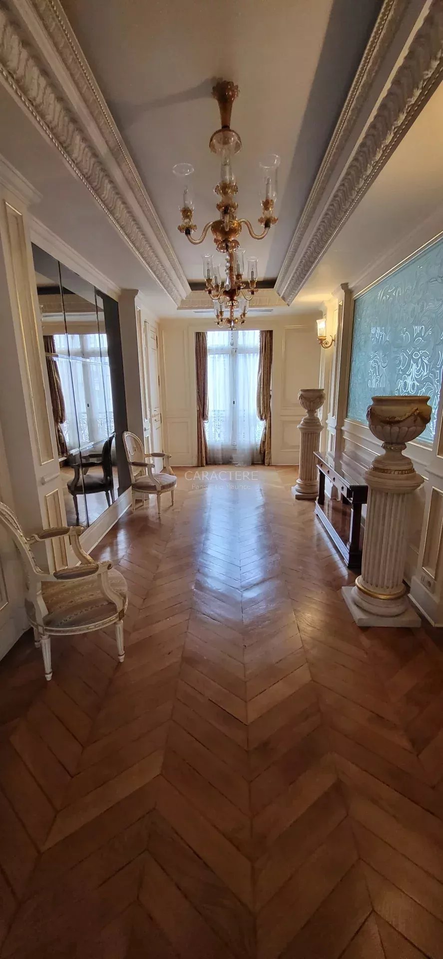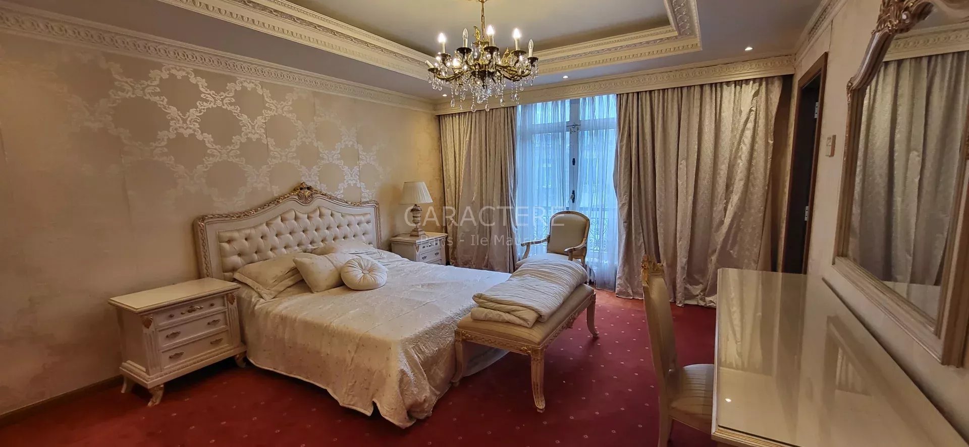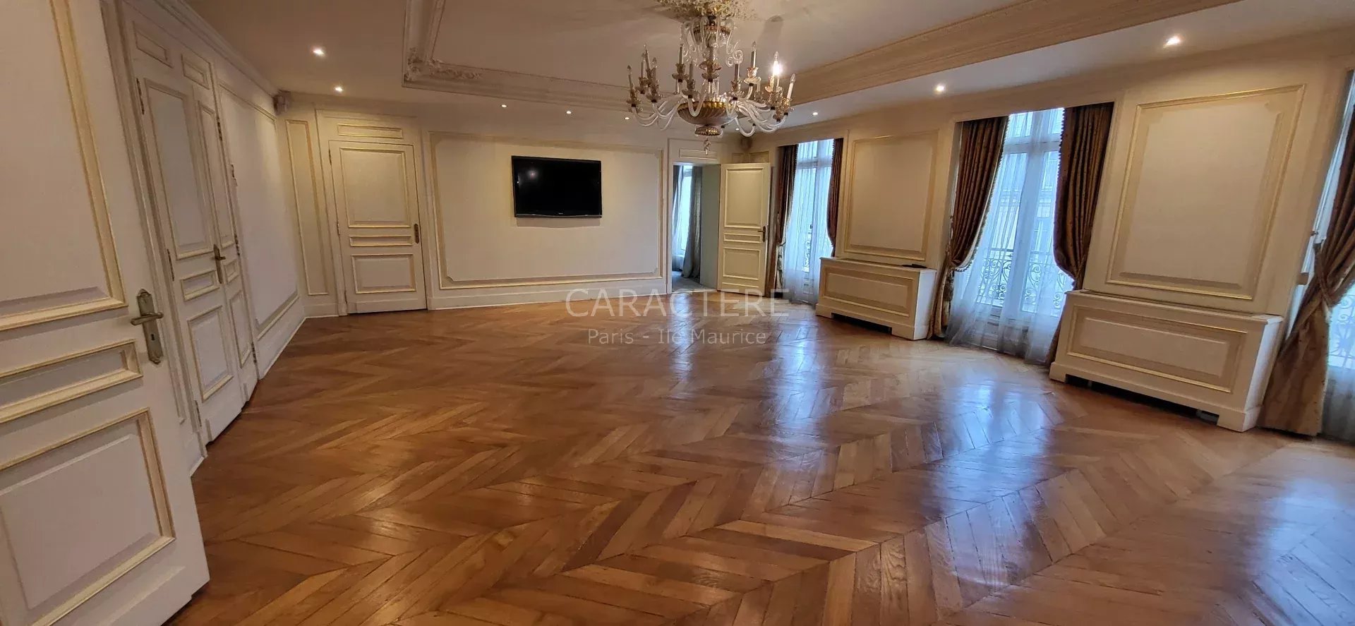 Dans immeuble en pierre de taille avec gardien, bel appartement semi meublé, idéalement situé rue Galilée dans le 8ème arrondissement à proximité des stations George V (ligne 1), Kléber (ligne 6) et Charles de Gaulle - Etoile (ligne 1, 2 et 6, RER A). D'une surface de 346.55 m², au 4ème étage avec ascenseur, il offre une belle entrée, un séjour et une salle à manger spacieux, une cuisine séparée entièrement équipée (réfrigérateur-congélateur, four, micro-ondes, plaques de cuisson), 8 chambres avec salle de bain et w-c, buanderie, w-c invité. Charme de l'ancien : parquet, moulures, cheminées et belle hauteur sous-plafond. Chauffage collectif, eau chaude individuelle et climatisation.