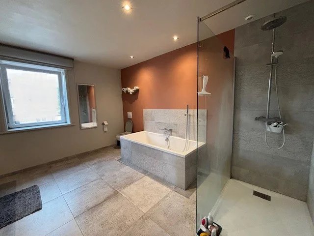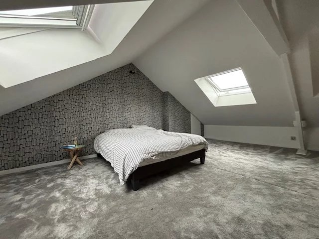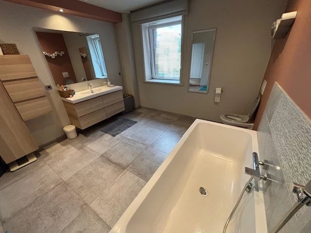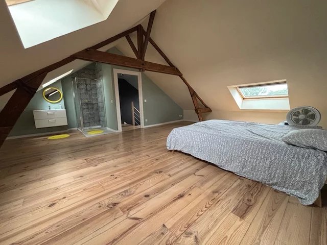 A l'étage un grand palier servant de bureau et dressing dessert deux chambres, une salle de bain, un grenier et deux escaliers permettant de rejoindre chacun une chambre dont une avec vasque et douche.