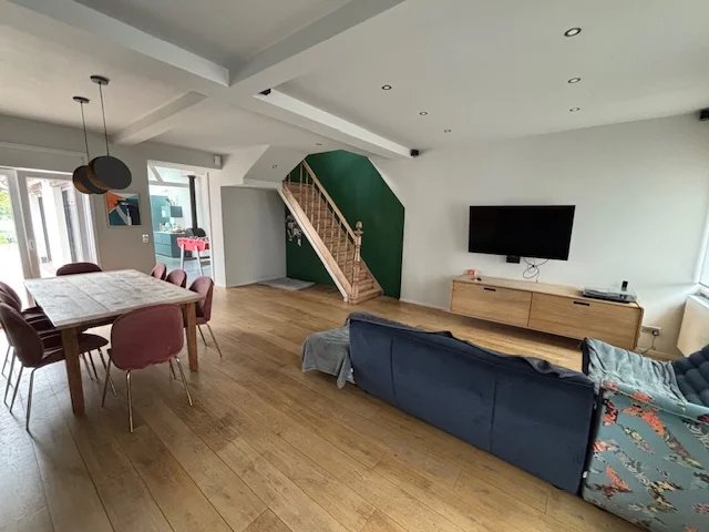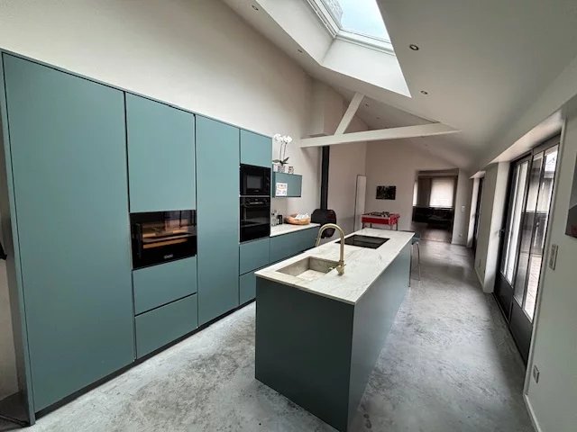 Elle est composée au rez-de-chaussée d'une entrée avec toilettes, un large salon et une magnifique cuisine équipée de plus de 40m² avec un espace repas, un poêle à bois et baignée de lumière grâce à ses baies vitrées et lucarnes de toit.