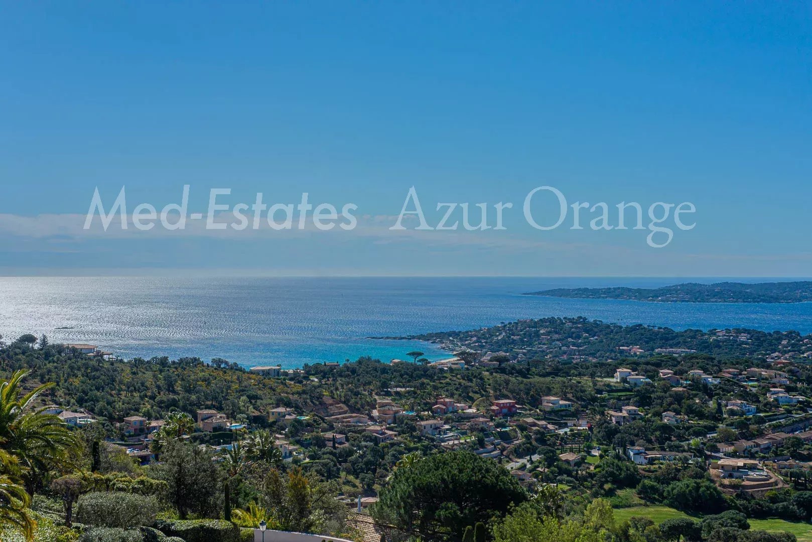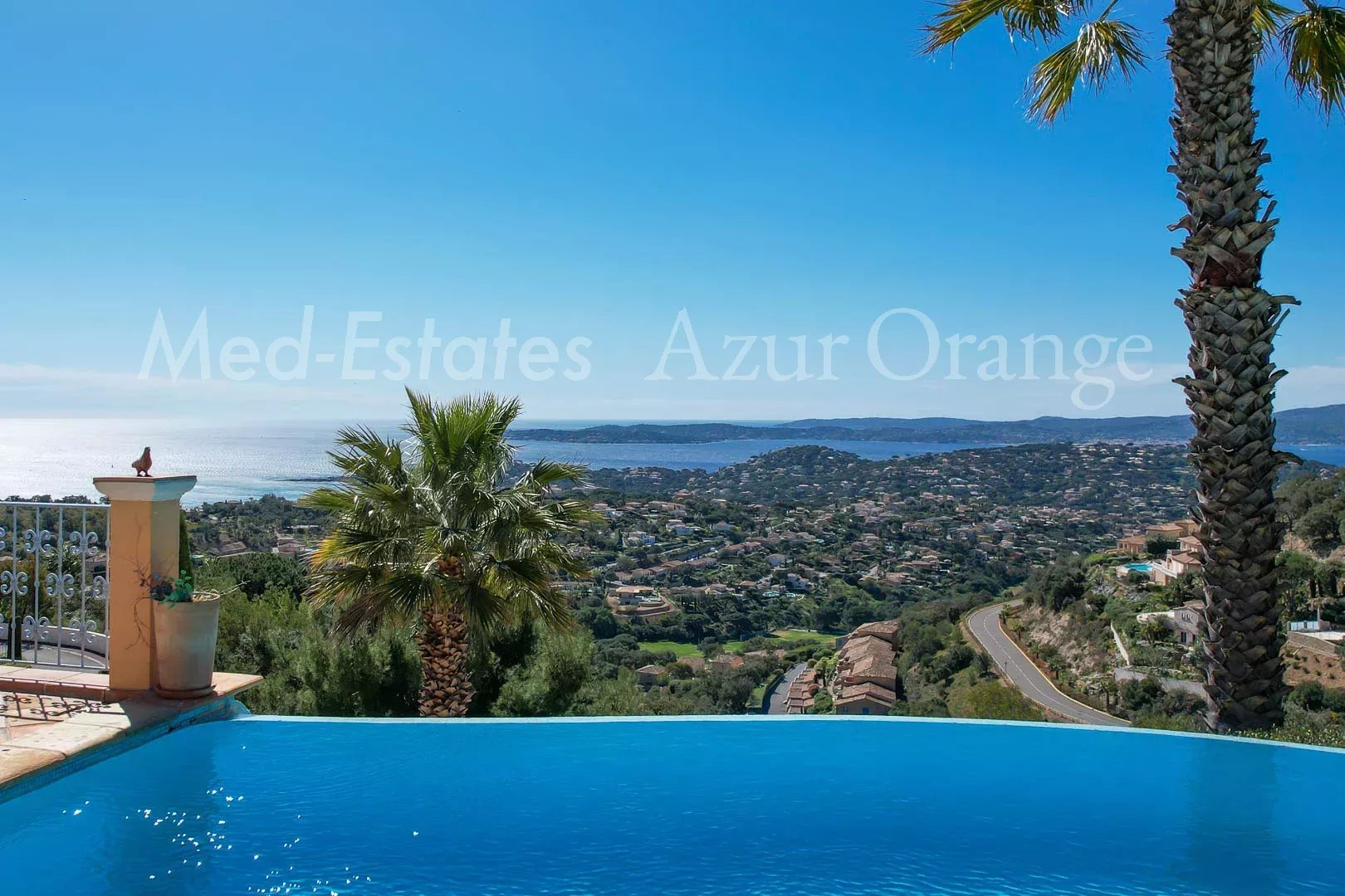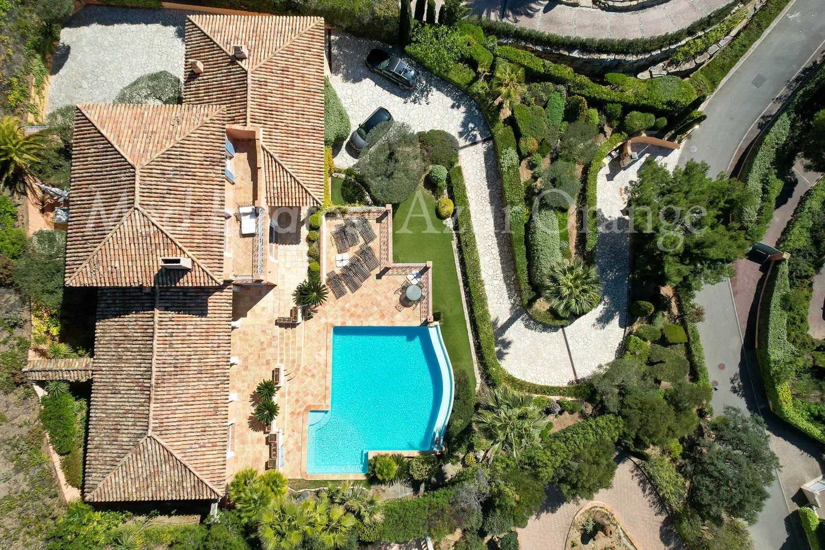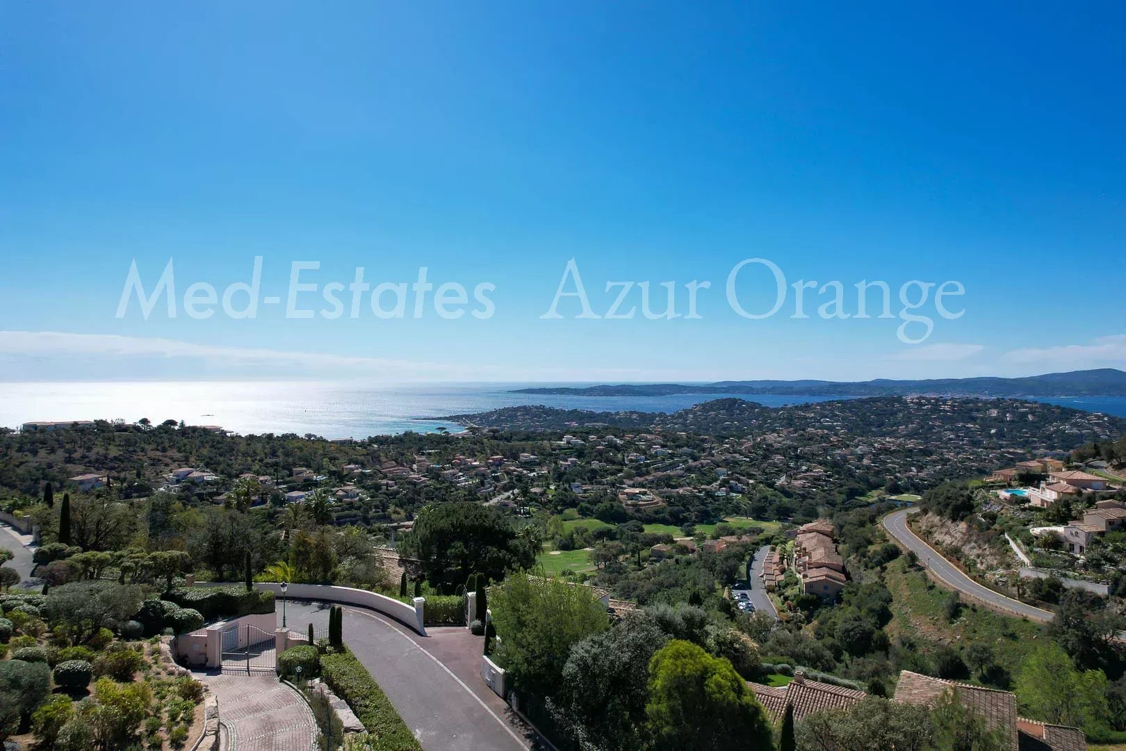 SAINTE-MAXIME | VILLA DE PRESTIGE DANS UN DOMAINE SECURISE AVEC SUPERBE VUE MERVilla de prestige avec une surface habitable de plus de 350 m² et 6 chambres, sur un terrain de +/- 2000 m² avec piscine chauffée à débordement. La villa (construite en 1993) est très bien entretenue et offre des espaces agréables avec tout le confort (a.o. alarme intérieure et extérieure, volets et portails électriques, climatisation réversible dans chaque chambre, chauffage au gaz, etc.) La villa est située dans un élégant domaine privé et sécurisé, sur le golf de Sainte-Maxime - vous y bénéficierez d'une tranquillité totale et de vues panoramiques sur la mer et la baie de Saint-Tropez. LA VILLA Entrée ; grand séjour de plus de 45 m² donnant sur les terrasses couvertes ; salle à manger avec cheminée ; belle cuisine ouverte avec vue sur la mer avec cellier. WC invités. Première chambre côté piscine avec vue sur la mer ; salle de bain, salle de douche, WC.A l'étage : suite parentale avec salon, salle de bains/douche, WC et grande terrasse avec vue sur la mer et tout le golfe de Saint-Tropez. Au rez-de-chaussée : 3 chambres en suite avec terrasses privées surplombant la mer ; un home cinéma central de plus de 30 m², un SPA (salle de hammam-balnéothérapie) ; une buanderie, une cave à vin, de nombreux espaces de rangement. 6ème chambre en suite pour le personnel. L'ESPACE EXTERIEUR Une piscine à débordement chauffée (au sel) de 8 m x 7 m ; un local technique. Garage et plusieurs places de parking ; un jardin paysagé et sécurisé avec arrosage automatique et arbres typiques (oliviers centenaires, palmiers).Belle et spacieuse villa dans un domaine privé sécurisé avec vue panoramique sur la mer !
