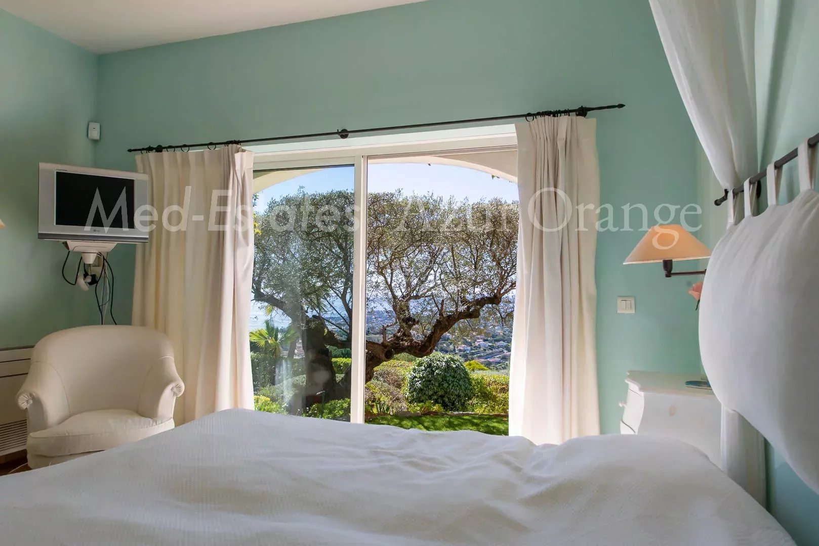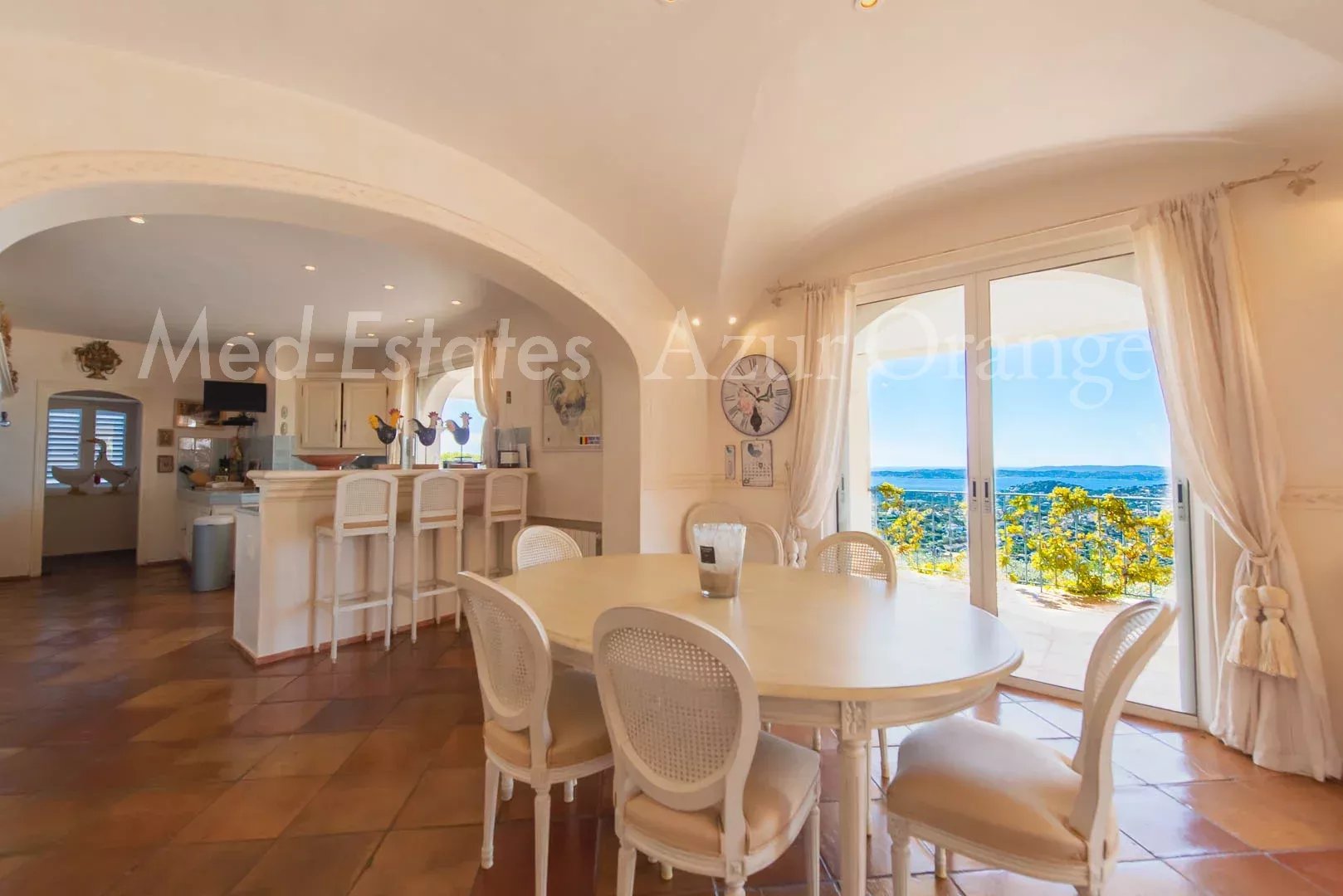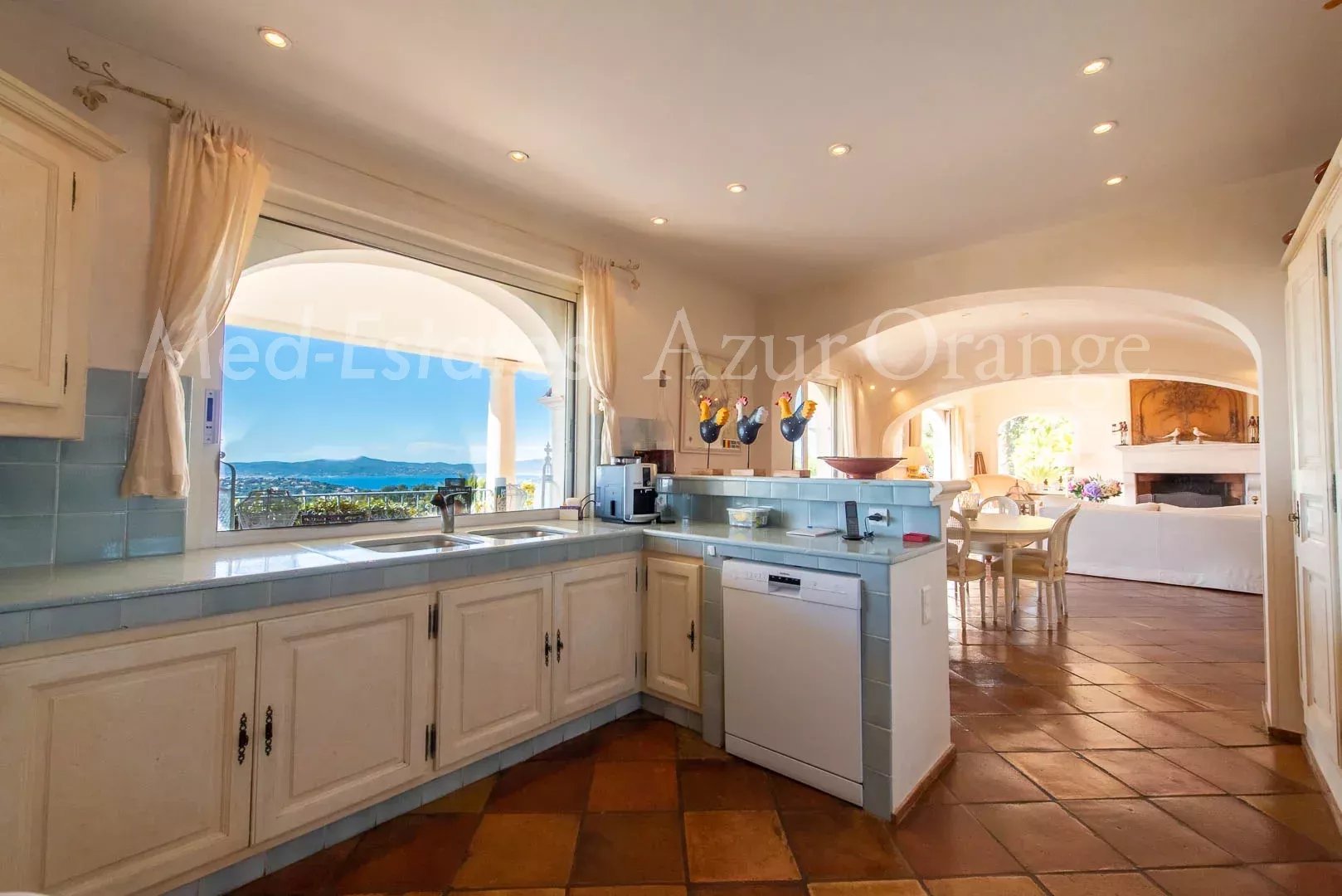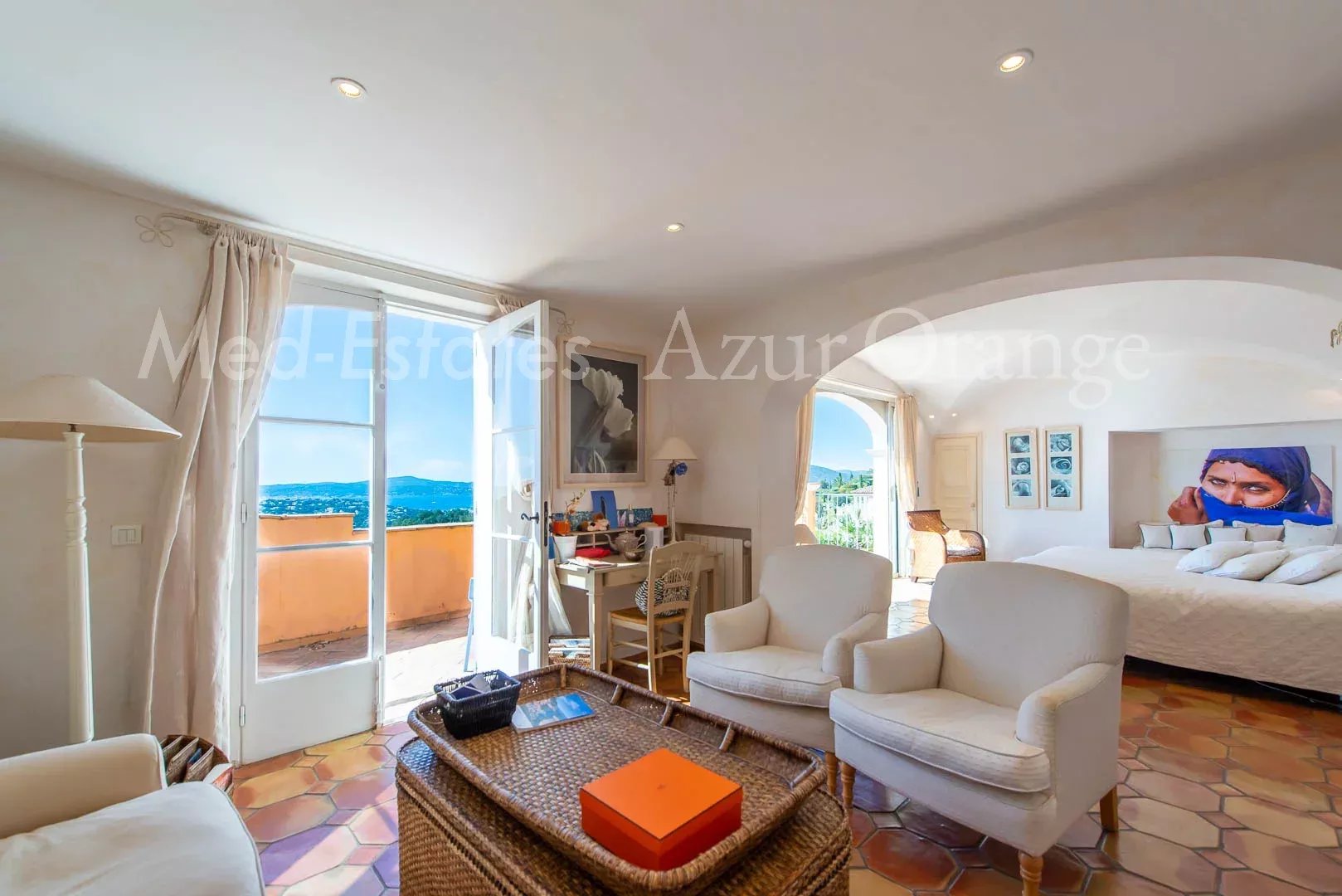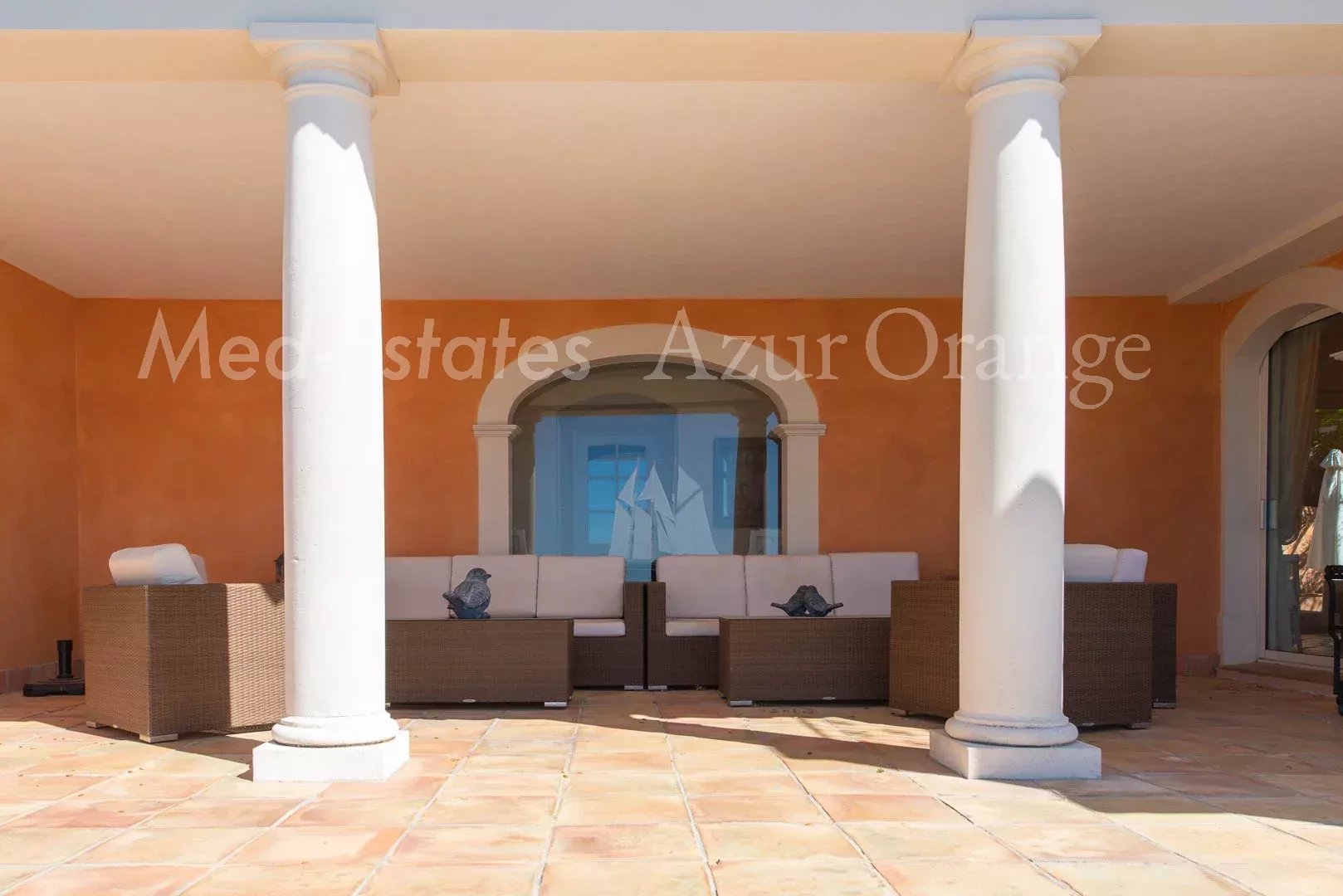 SAINTE-MAXIME | VILLA DE PRESTIGE DANS UN DOMAINE SECURISE AVEC SUPERBE VUE MERVilla de prestige avec une surface habitable de plus de 350 m² et 6 chambres, sur un terrain de +/- 2000 m² avec piscine chauffée à débordement. La villa (construite en 1993) est très bien entretenue et offre des espaces agréables avec tout le confort (a.o. alarme intérieure et extérieure, volets et portails électriques, climatisation réversible dans chaque chambre, chauffage au gaz, etc.) La villa est située dans un élégant domaine privé et sécurisé, sur le golf de Sainte-Maxime - vous y bénéficierez d'une tranquillité totale et de vues panoramiques sur la mer et la baie de Saint-Tropez. LA VILLA Entrée ; grand séjour de plus de 45 m² donnant sur les terrasses couvertes ; salle à manger avec cheminée ; belle cuisine ouverte avec vue sur la mer avec cellier. WC invités. Première chambre côté piscine avec vue sur la mer ; salle de bain, salle de douche, WC.A l'étage : suite parentale avec salon, salle de bains/douche, WC et grande terrasse avec vue sur la mer et tout le golfe de Saint-Tropez. Au rez-de-chaussée : 3 chambres en suite avec terrasses privées surplombant la mer ; un home cinéma central de plus de 30 m², un SPA (salle de hammam-balnéothérapie) ; une buanderie, une cave à vin, de nombreux espaces de rangement. 6ème chambre en suite pour le personnel. L'ESPACE EXTERIEUR Une piscine à débordement chauffée (au sel) de 8 m x 7 m ; un local technique. Garage et plusieurs places de parking ; un jardin paysagé et sécurisé avec arrosage automatique et arbres typiques (oliviers centenaires, palmiers).Belle et spacieuse villa dans un domaine privé sécurisé avec vue panoramique sur la mer !