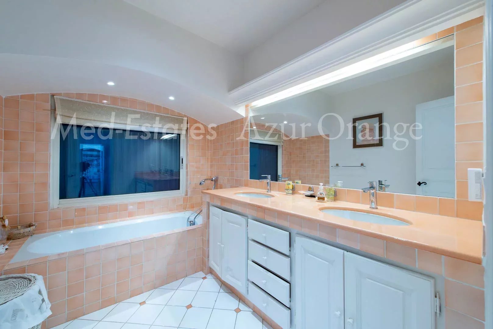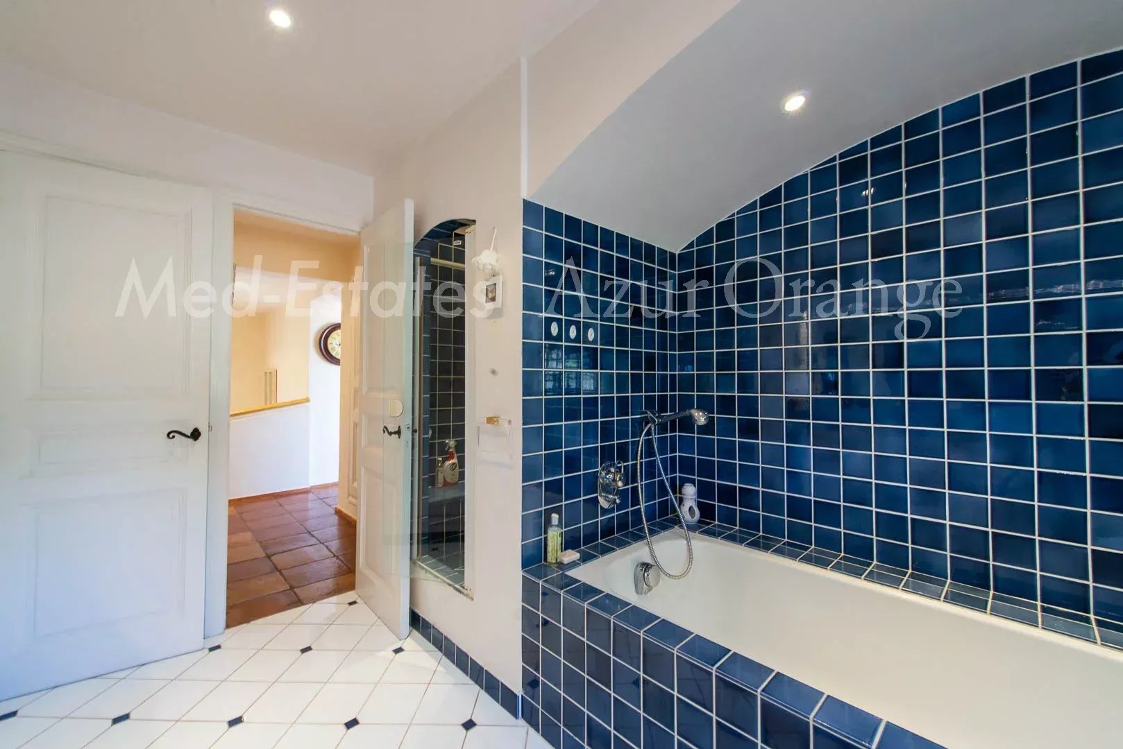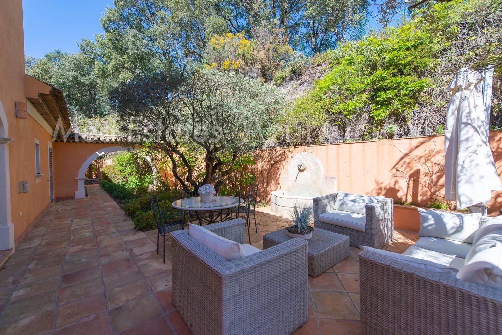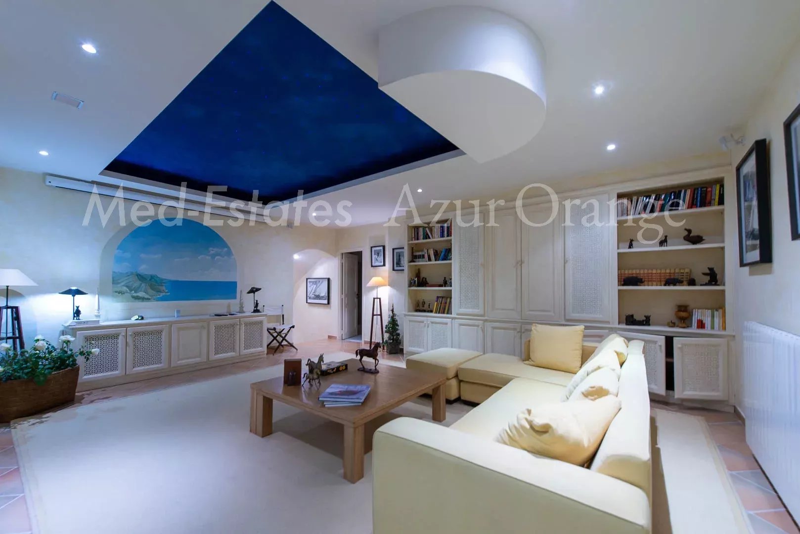 SAINTE-MAXIME | VILLA DE PRESTIGE DANS UN DOMAINE SECURISE AVEC SUPERBE VUE MERVilla de prestige avec une surface habitable de plus de 350 m² et 6 chambres, sur un terrain de +/- 2000 m² avec piscine chauffée à débordement. La villa (construite en 1993) est très bien entretenue et offre des espaces agréables avec tout le confort (a.o. alarme intérieure et extérieure, volets et portails électriques, climatisation réversible dans chaque chambre, chauffage au gaz, etc.) La villa est située dans un élégant domaine privé et sécurisé, sur le golf de Sainte-Maxime - vous y bénéficierez d'une tranquillité totale et de vues panoramiques sur la mer et la baie de Saint-Tropez. LA VILLA Entrée ; grand séjour de plus de 45 m² donnant sur les terrasses couvertes ; salle à manger avec cheminée ; belle cuisine ouverte avec vue sur la mer avec cellier. WC invités. Première chambre côté piscine avec vue sur la mer ; salle de bain, salle de douche, WC.A l'étage : suite parentale avec salon, salle de bains/douche, WC et grande terrasse avec vue sur la mer et tout le golfe de Saint-Tropez. Au rez-de-chaussée : 3 chambres en suite avec terrasses privées surplombant la mer ; un home cinéma central de plus de 30 m², un SPA (salle de hammam-balnéothérapie) ; une buanderie, une cave à vin, de nombreux espaces de rangement. 6ème chambre en suite pour le personnel. L'ESPACE EXTERIEUR Une piscine à débordement chauffée (au sel) de 8 m x 7 m ; un local technique. Garage et plusieurs places de parking ; un jardin paysagé et sécurisé avec arrosage automatique et arbres typiques (oliviers centenaires, palmiers).Belle et spacieuse villa dans un domaine privé sécurisé avec vue panoramique sur la mer !