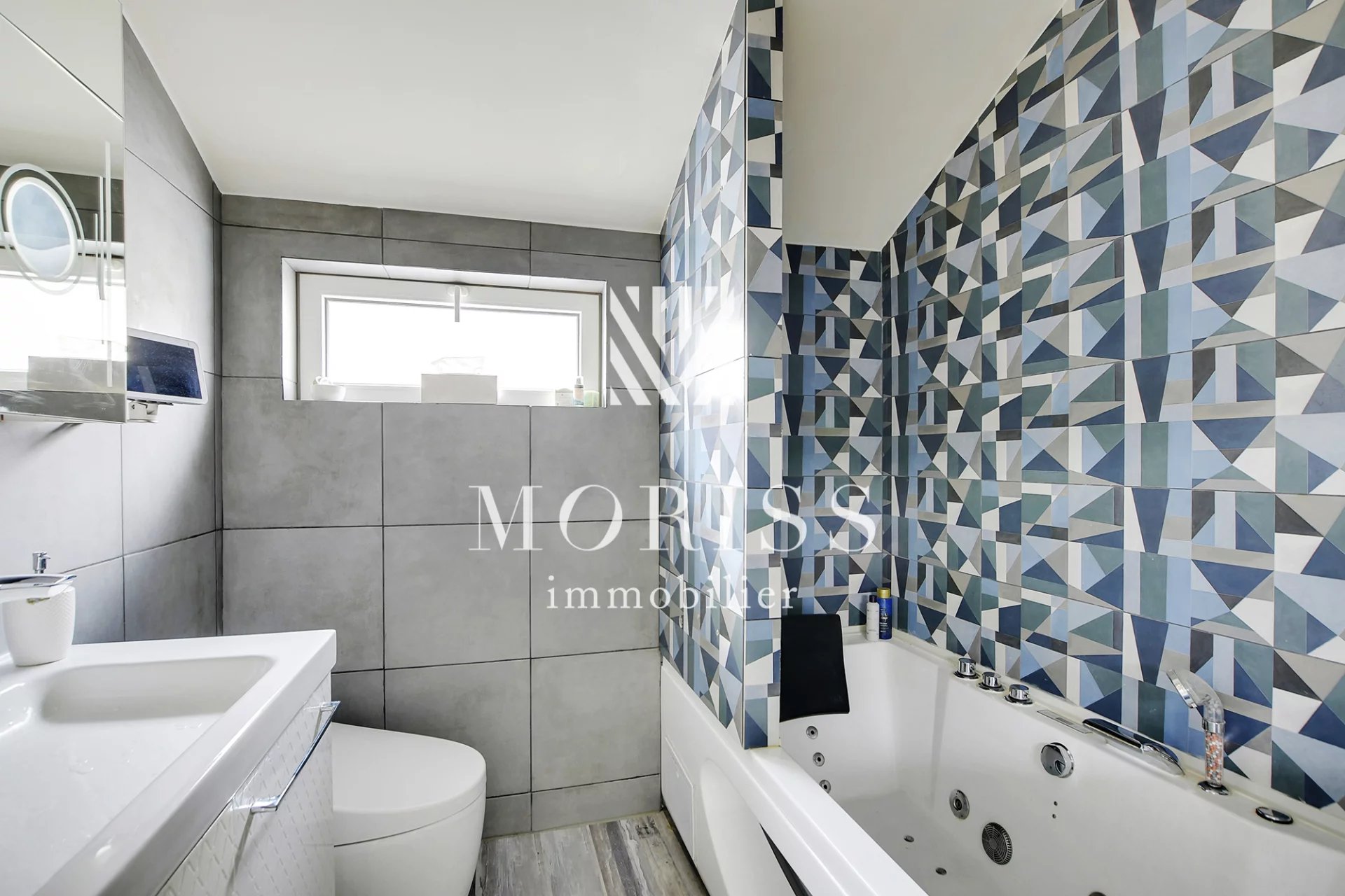 Elle se compose d’une entrée, d’un espace salon avec cuisine ouverte, d’un séjour sous verrière, de trois chambres, dont l’une est actuellement aménagée en dressing, ainsi que d’un grenier aménagé pouvant faire office de bureau ou de chambre d’appoint. Deux salles d’eau avec WC complètent l’espace principal.