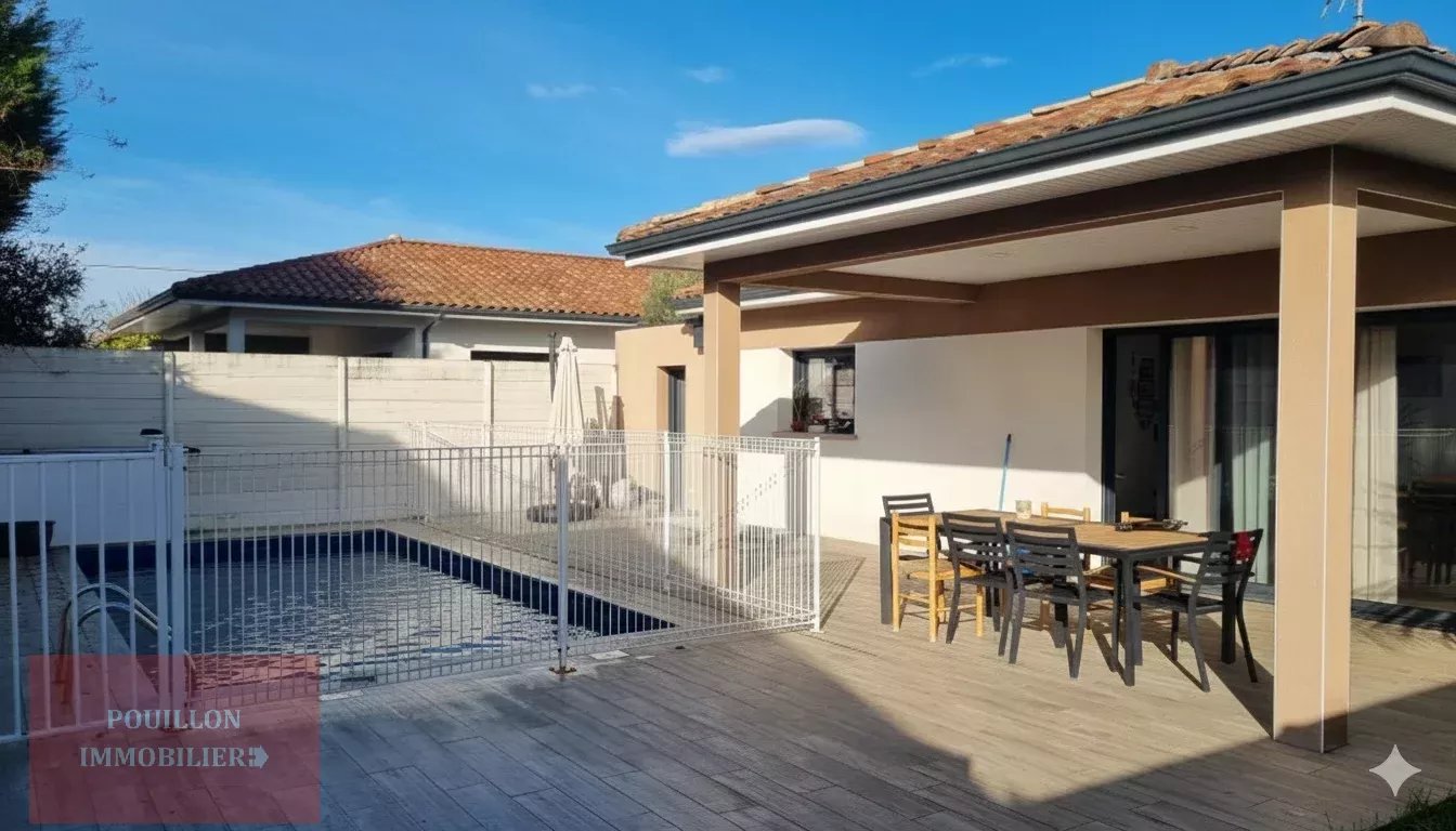 Maison neuve de plain-pied de 98m² - Entrée, pièce de vie de 50m² avec cuisine équipée accès terrasse vers piscine, salle d'eau, toilettes et 3 chambres. Garage sur le côté, petit terrain compact à l'abri des regards dans un quartier très calme.
