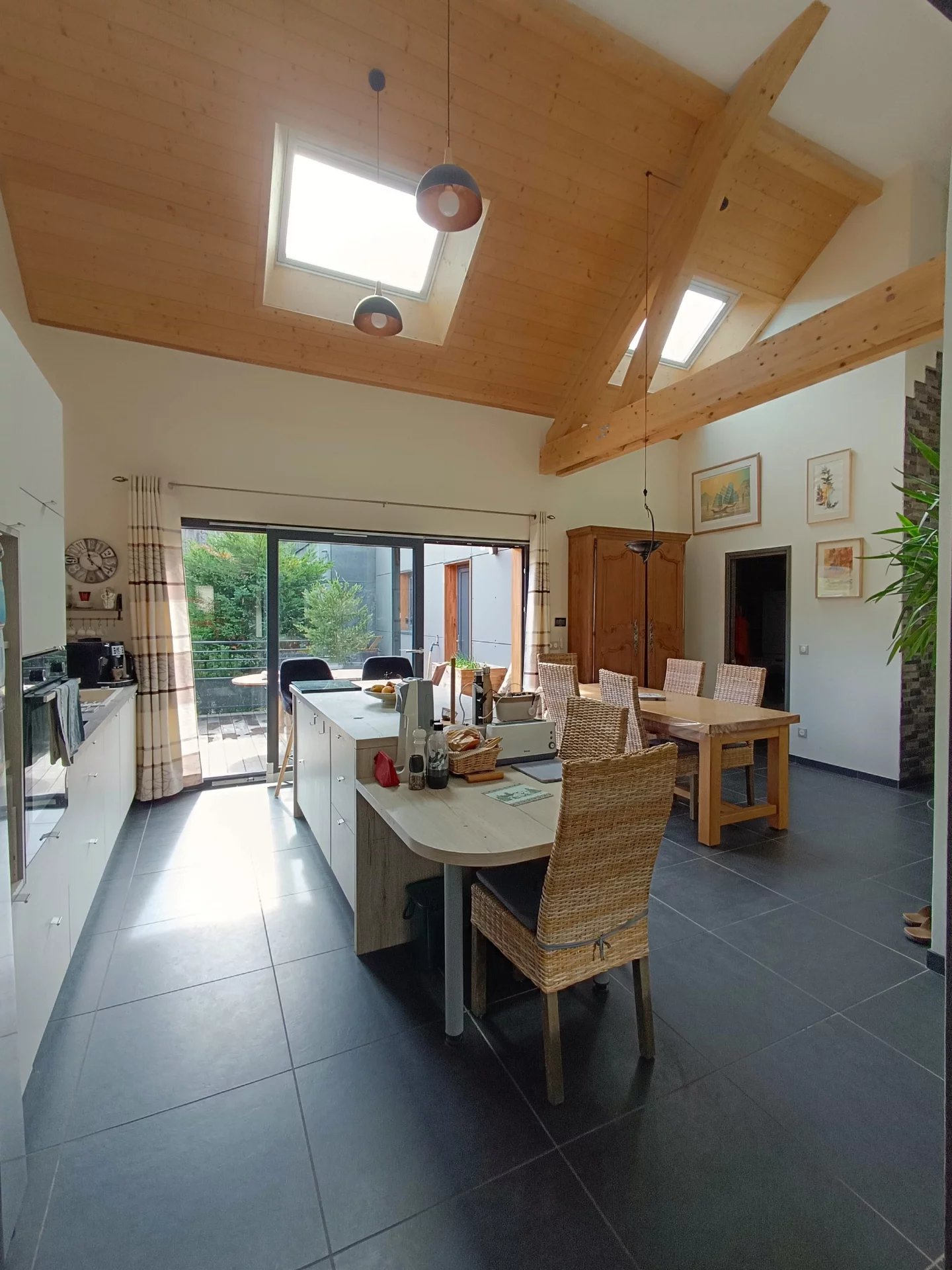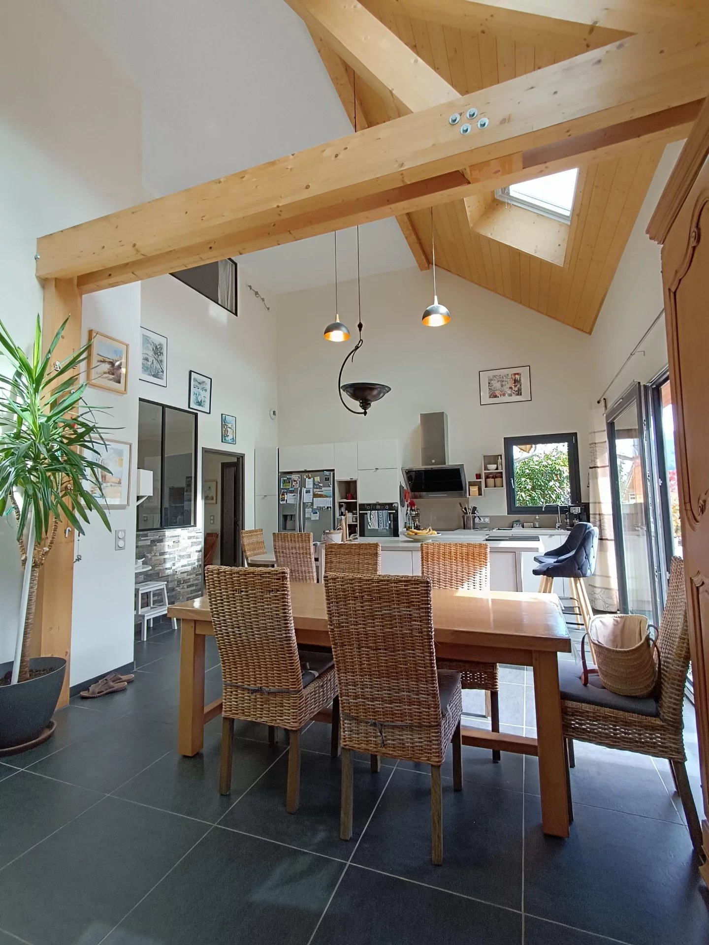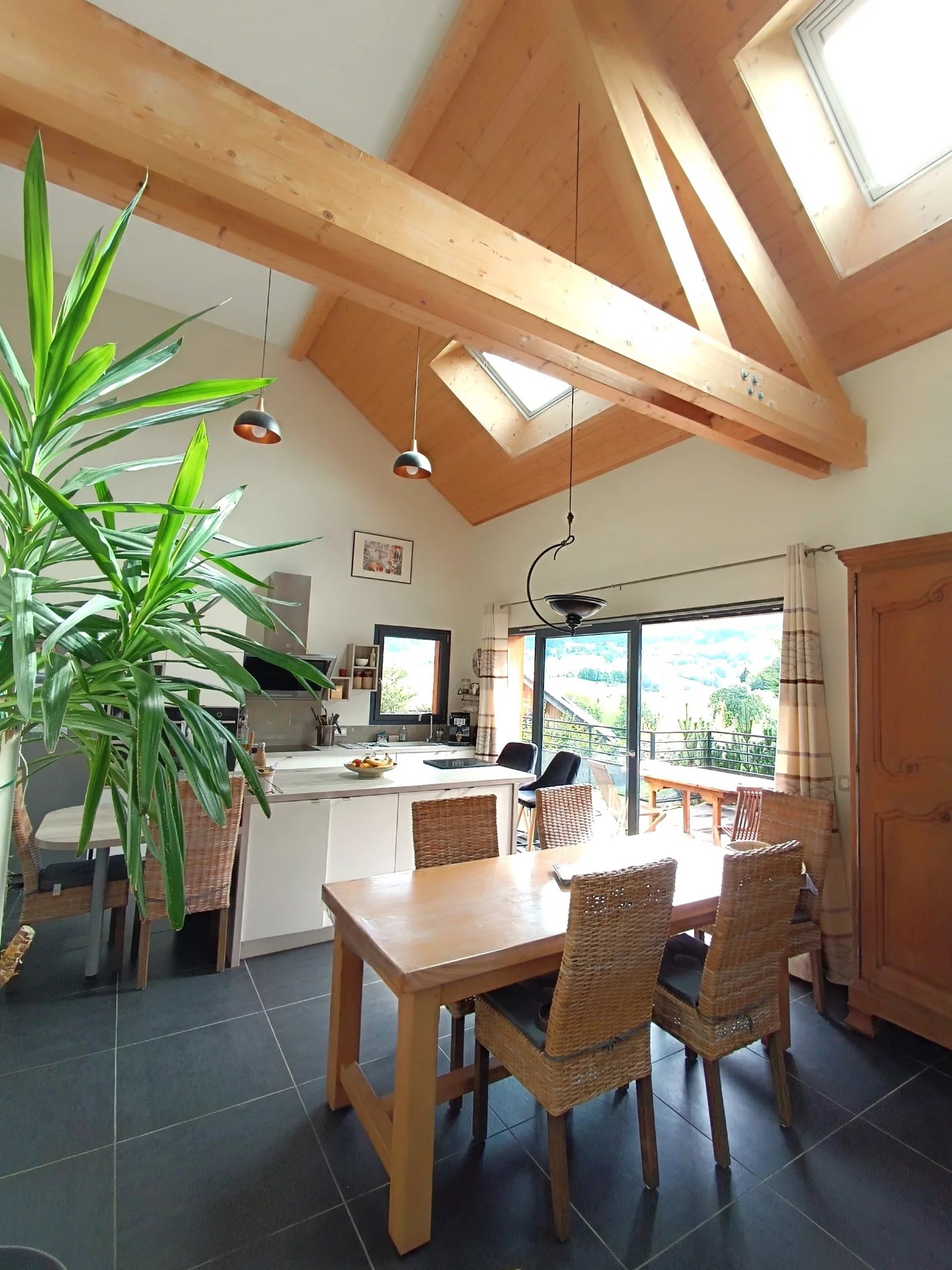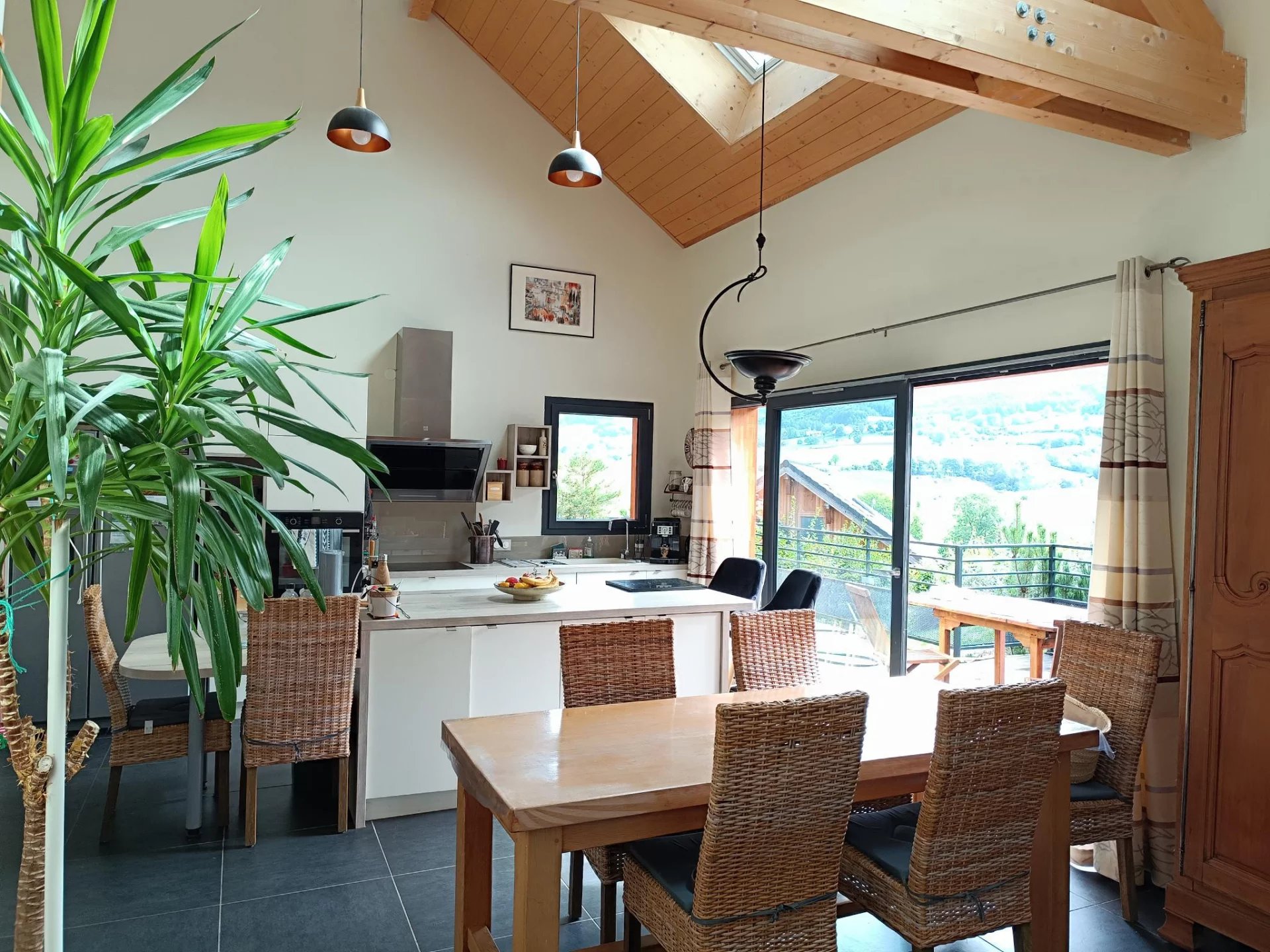 Vous serez séduit par les beaux volumes de la pièce de vie et son plafond cathédrale . Cette pièce lumineuse ,avec une VUE MAGNIFIQUE sur les montagnes dispose d'une grande baie vitrée permettant d'accéder à la terrasse de 29m2 ( Voile d'ombrage motorisé) et au jardin .
