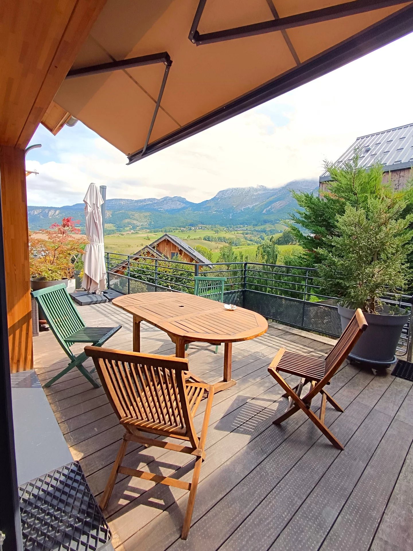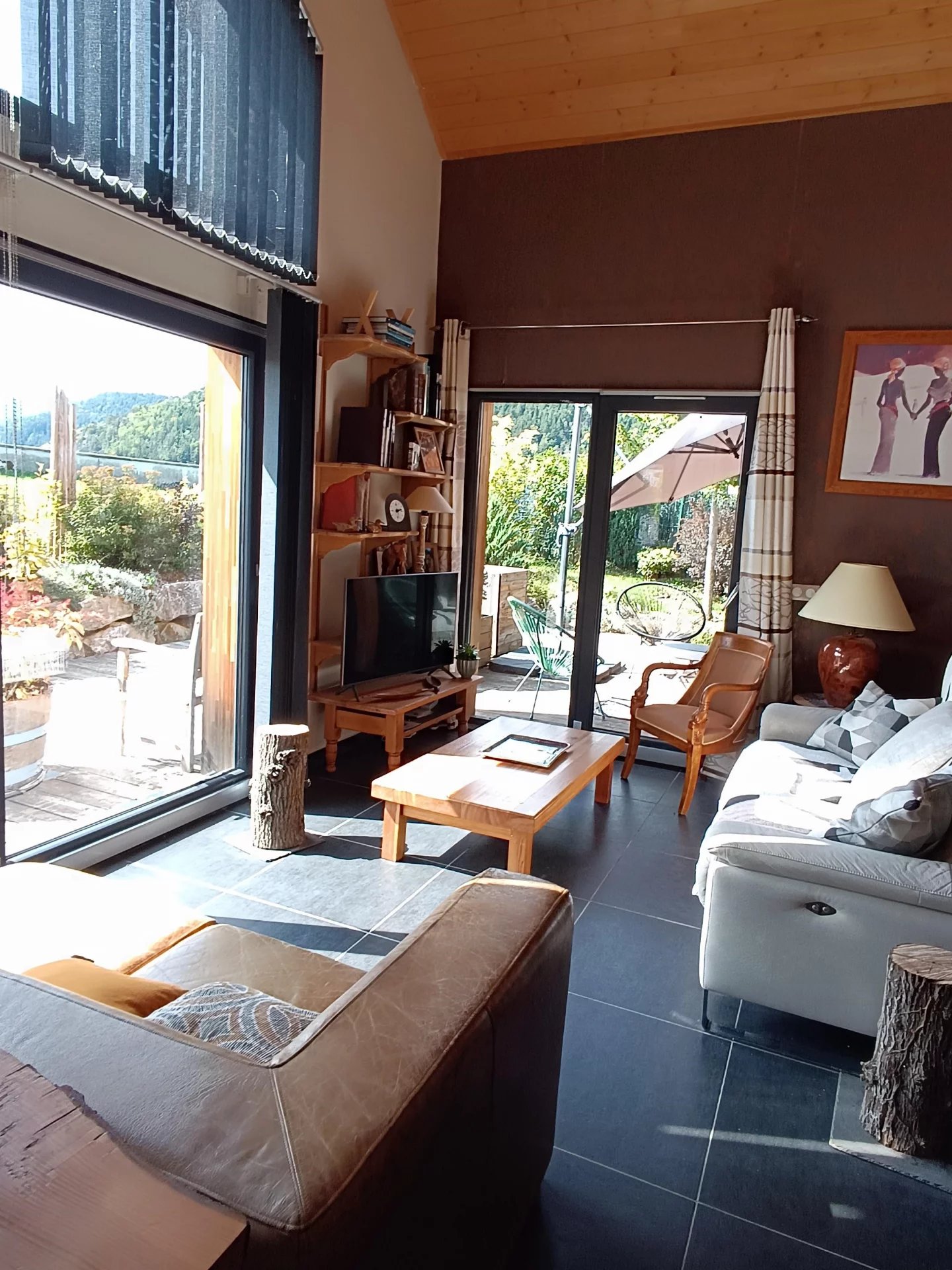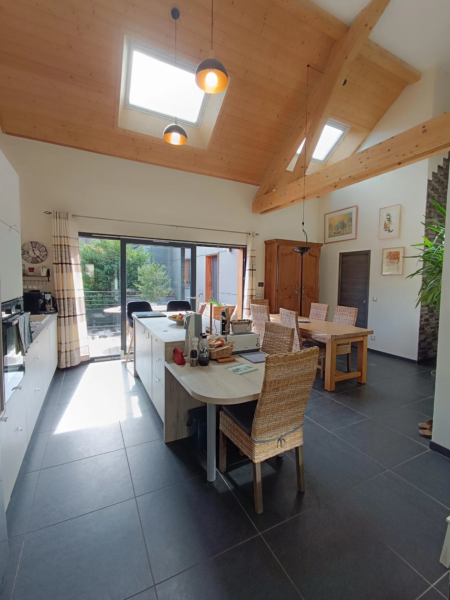 Vous serez séduit par les beaux volumes de la pièce de vie et son plafond cathédrale . Cette pièce lumineuse ,avec une VUE MAGNIFIQUE sur les montagnes dispose d'une grande baie vitrée permettant d'accéder à la terrasse de 29m2 ( Voile d'ombrage motorisé) et au jardin .