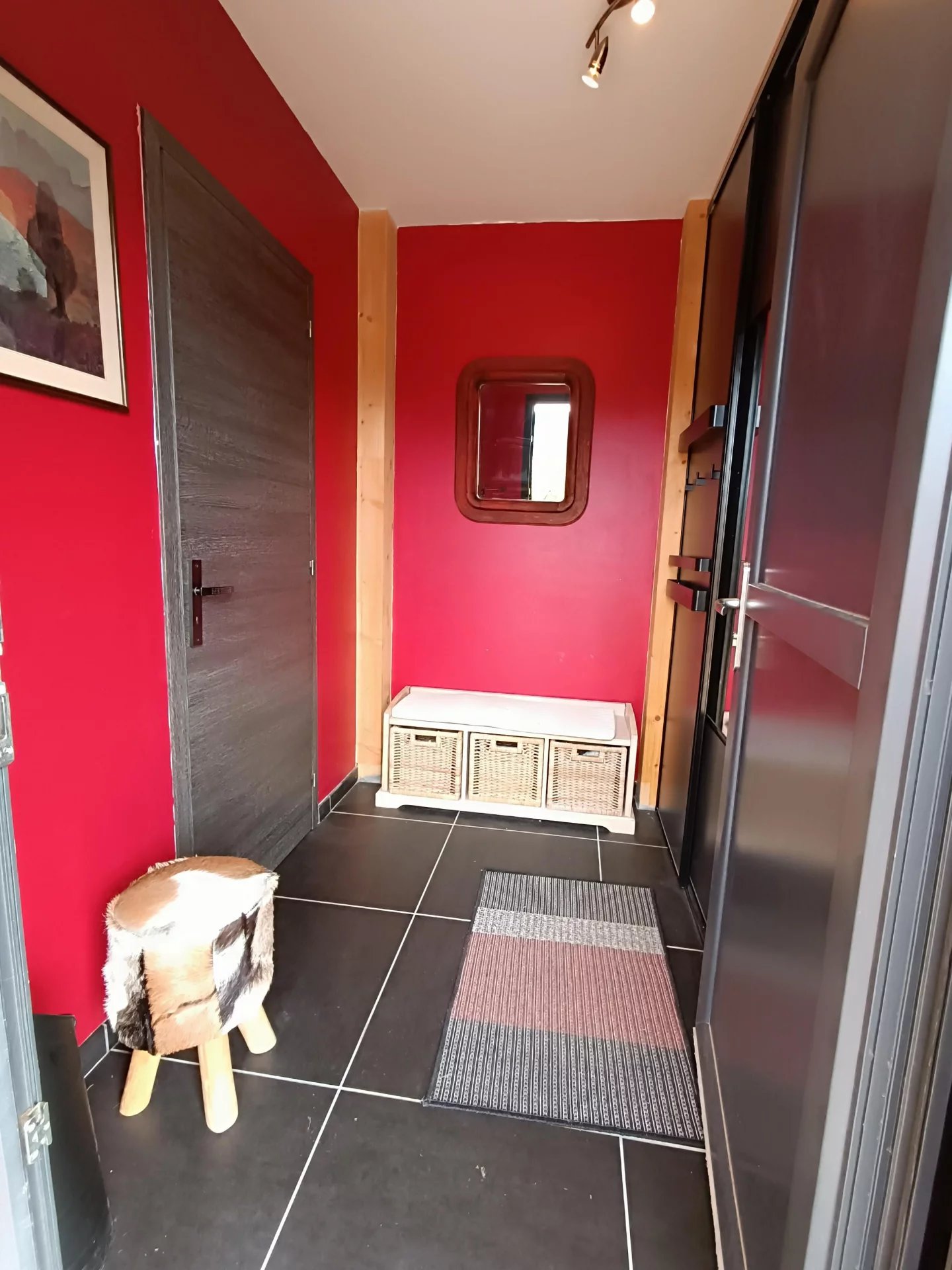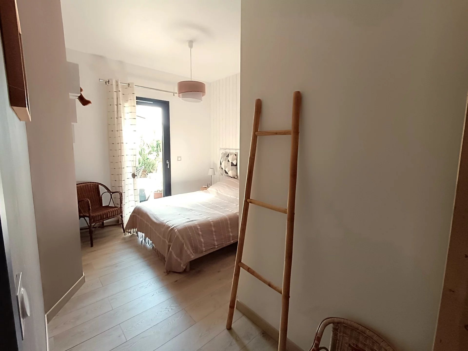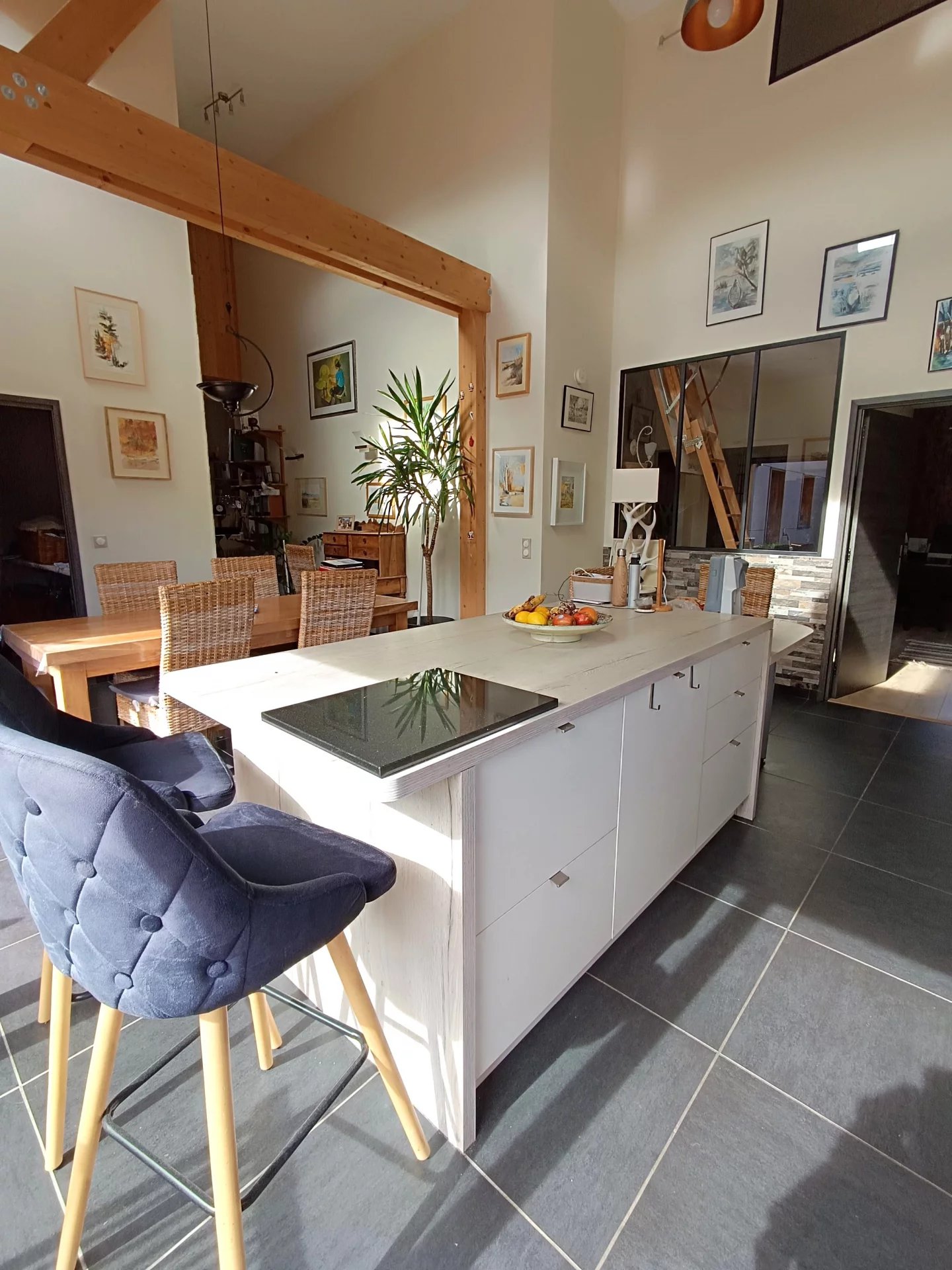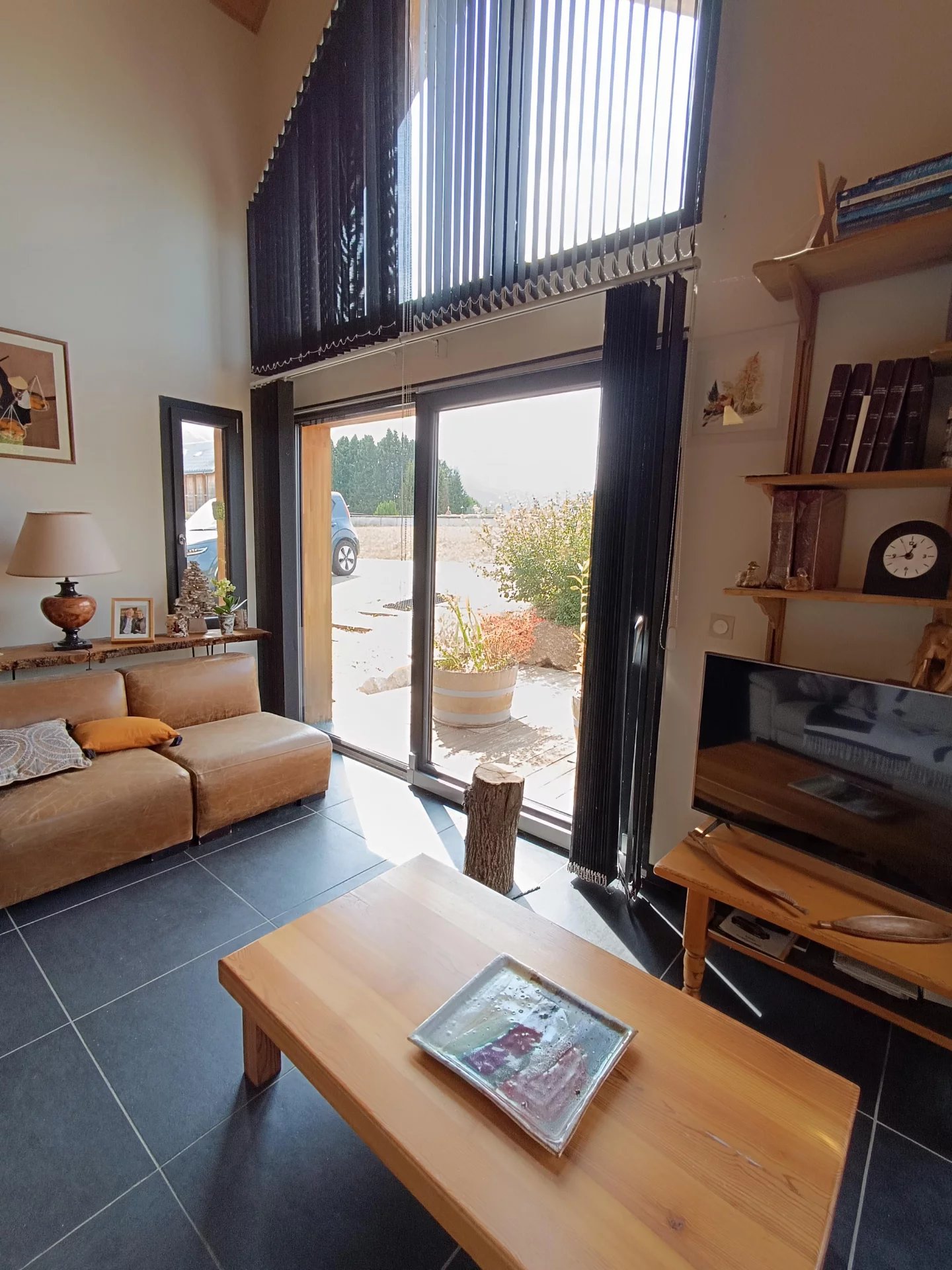Vous serez séduit par les beaux volumes de la pièce de vie et son plafond cathédrale . Cette pièce lumineuse ,avec une VUE MAGNIFIQUE sur les montagnes dispose d'une grande baie vitrée permettant d'accéder à la terrasse de 29m2 ( Voile d'ombrage motorisé) et au jardin .