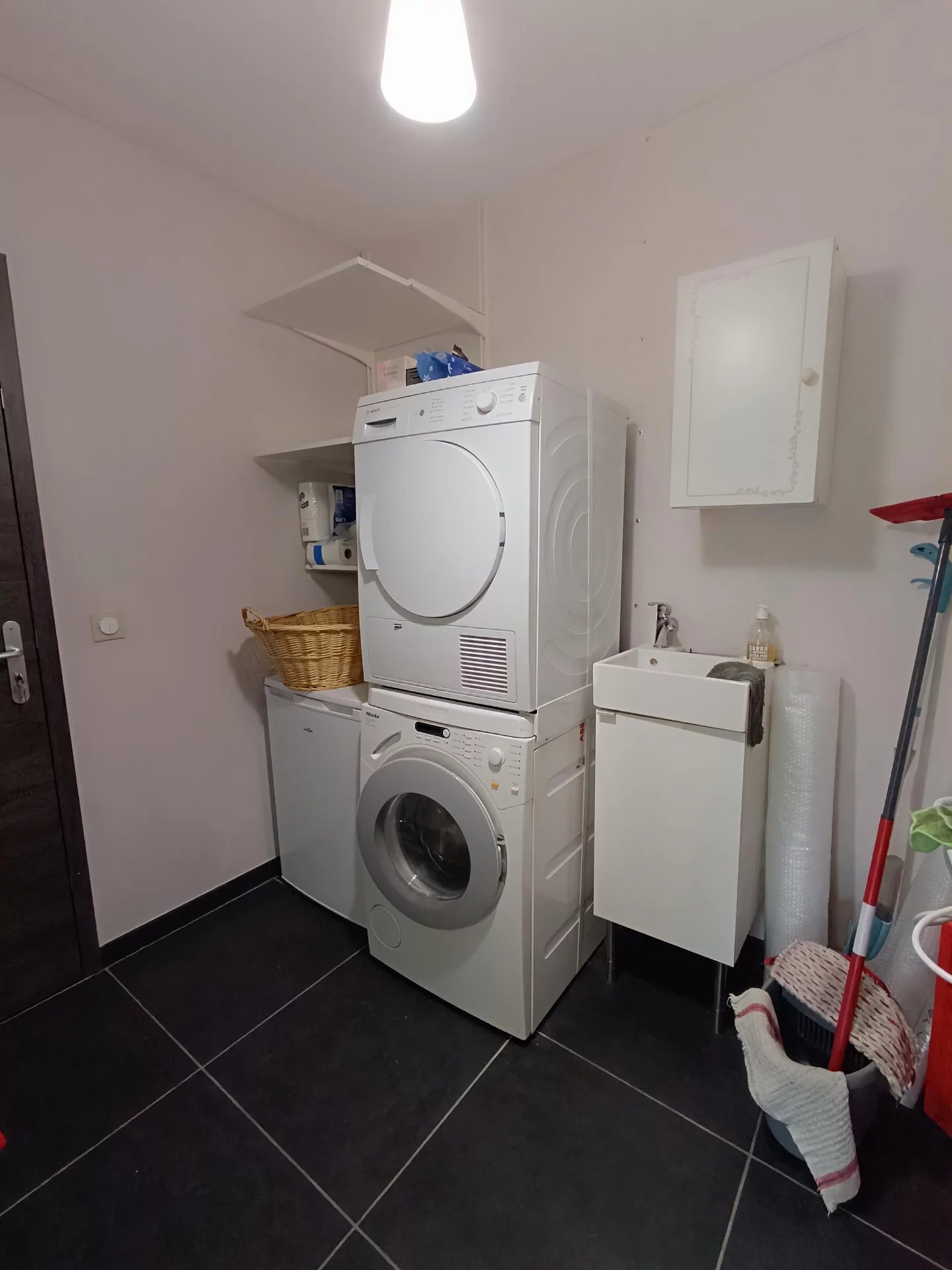 La cuisine aux nombreux rangements est entièrement équipée avec électro ménager de marque .