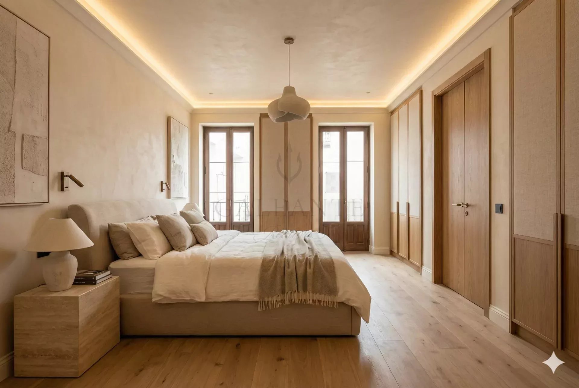 Galeante Realtors presents a residence of extraordinary proportions on the third floor of a distinguished 1910 classic building on Calle Larra, in the heart of the exclusive Justicia district. Spanning an impressive 296 m², this exterior property offers a scale and volume rarely found in Madrid's city center, characterized by soaring 3.30-meter ceilings and the timeless elegance of its architectural heritage. The building, which features a recently restored interior courtyard, provides the perfect setting for a comprehensive luxury refurbishment project that will transform this space into a masterpiece of contemporary design. The renovation will involve a complete overhaul of all installations—including brand-new electrical, plumbing, and air conditioning systems—to ensure state-of-the-art comfort. The envisioned layout features a spectacular open-plan social area with a designer kitchen fully equipped with Gaggenau appliances, perfectly blending functionality with high-end aesthetics. The private quarters are designed to include four or more spacious bedrooms, all with en-suite bathrooms, alongside a guest toilet and independent laundry room. This is a unique opportunity to acquire a brand-new, nearly 300 m² home that harmonizes the grandeur of a 1910 estate with the finest modern luxury specifications.