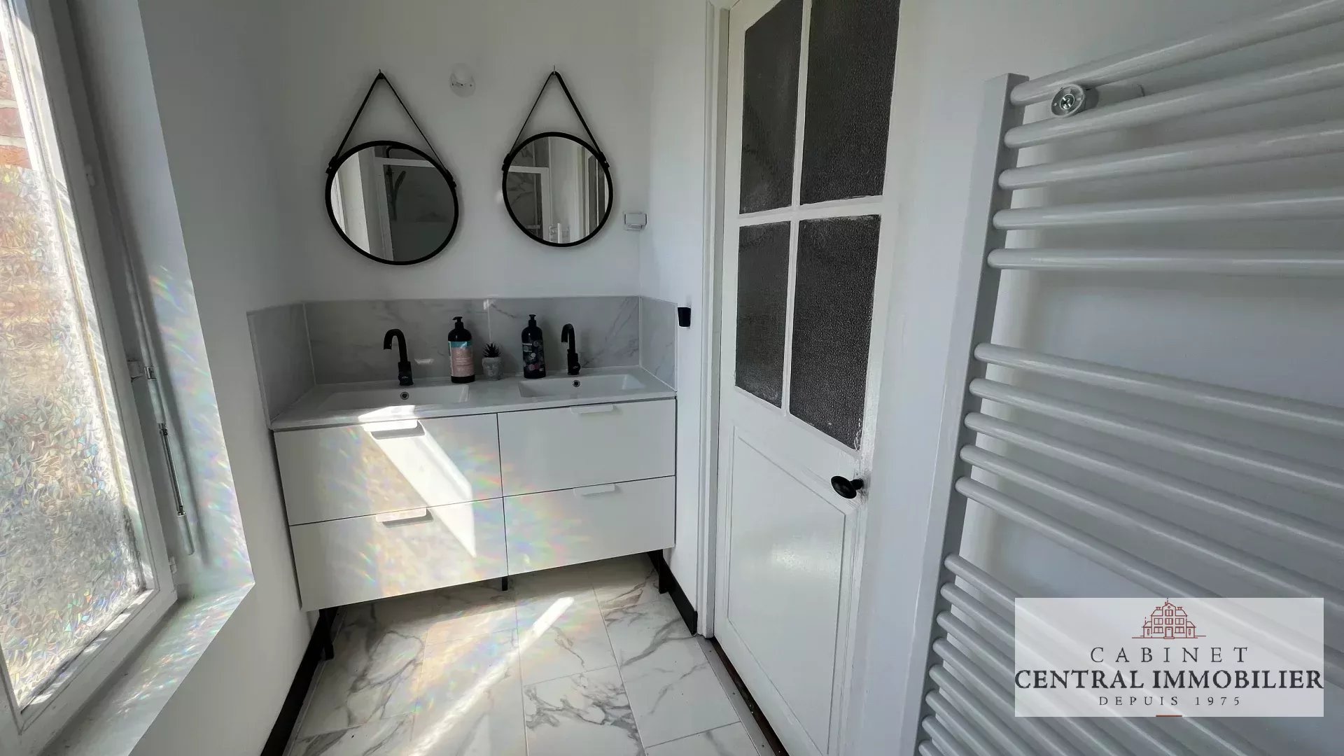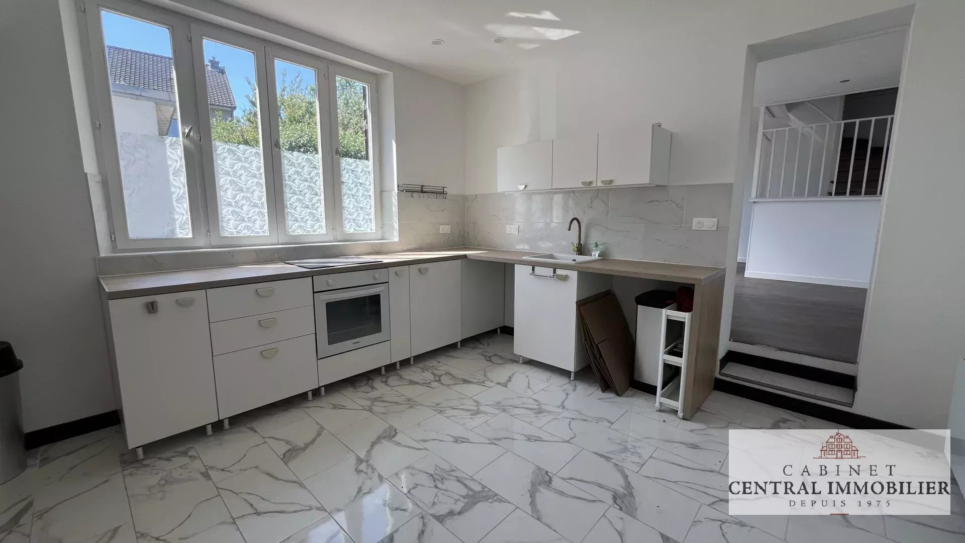 Maison de ville remise au goût du jour comprenant une entrée sur salon de 18.60m², une cuisine lumineuse carrelée de 15.20m² aménagée et équipée avec possibilité de coin repas, un séjour parquet flottant de 16.75m ; 1er étage : un palier parqueté desservant deux belles chambres parquetées de 13.15m² et 15.85 m² dont une avec placard, une salle d'eau carrelée de 4.20 m² avec double vasque, une douche avec pluie tropicale et WC ; 2ème étage : une très grande chambre parquetée de 22 m² avec poutres apparentes (possibilité d'aménager des placards); Double vitrage, chauffage électrique (radiateurs récents) Cave et terrasse exposée plein sud sur le devant de la maison pour un petit déjeuner ensoleillé! 2 places de stationnement privatives. Tout à l'égout.