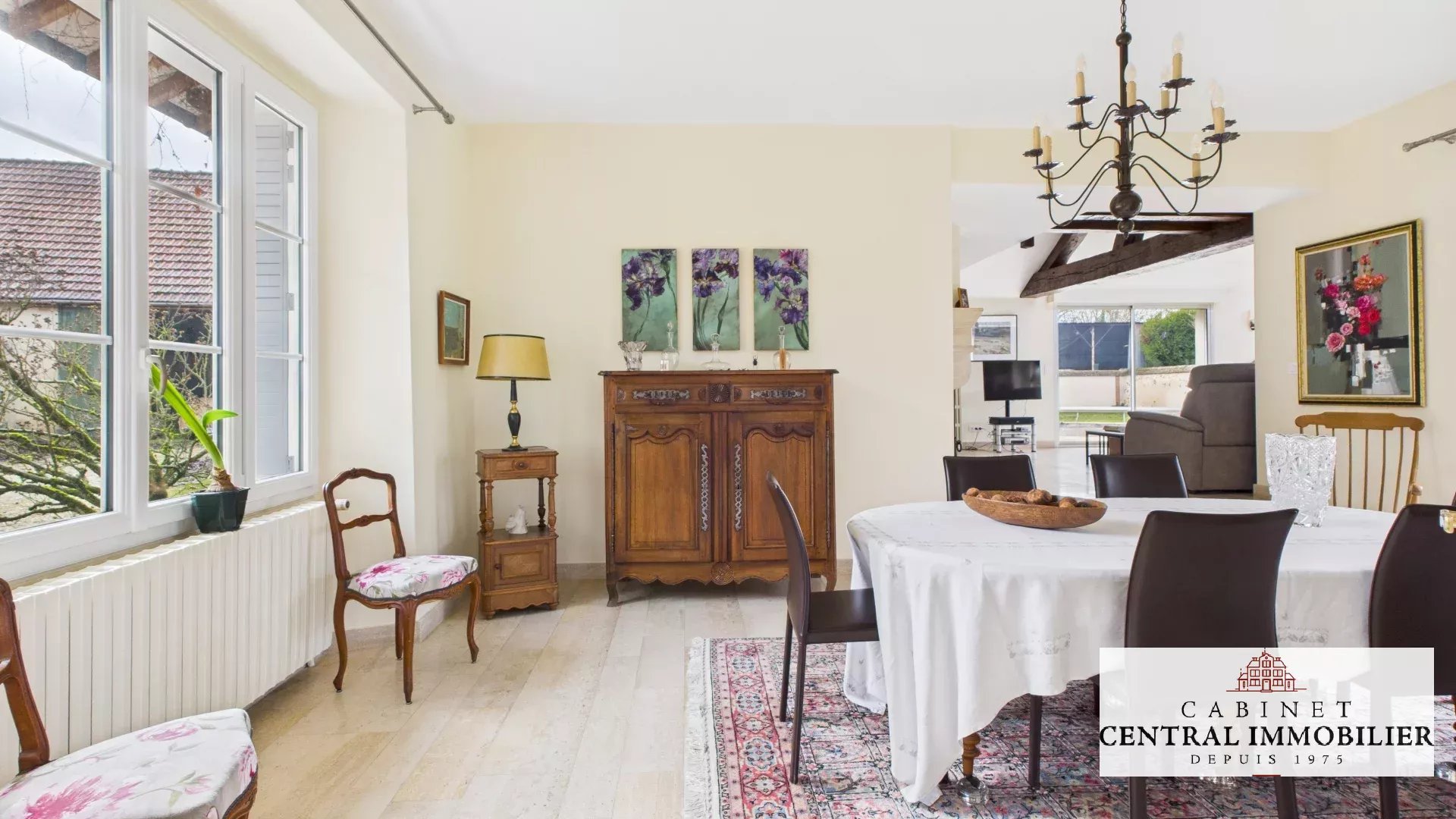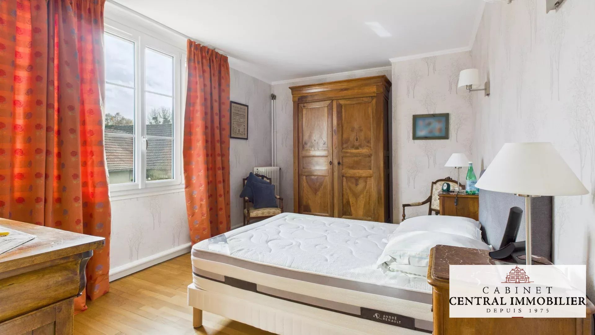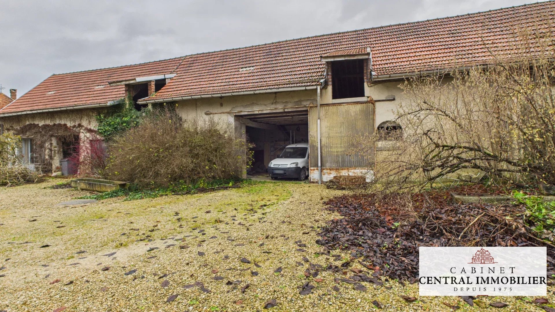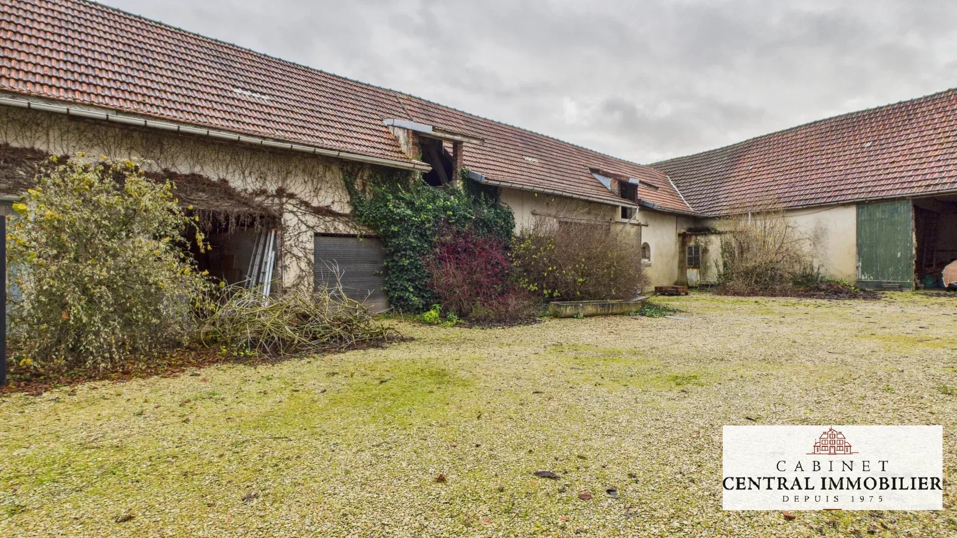 Maison comprenant : entrée de 12m² sol pierres de bourgogne avec placard et penderie, cuisine dinatoire de 20.80m² carrelée aménagée équipée accès véranda à usage d'arrière cuisine et buanderie, beau séjour salon de 75m² sol pierres de bourgogne avec baies vitrées et cheminée foyer ouvert, bureau de 4.70m² sol pierres de bourgogne, wc, salle d'eau (douche à l'italienne) sol pierres de bourgogne. À l'étage : palier parqueté, 3 chambres de 12.85m²/16m² et 16.20m² parquetées dont une avec 3 placards, chambre parentale de 13.50m² avec salle d'eau de 7m², wc. Mezzanine et une pièce grenier avec fenêtre. Chauffage central par PAC eau/eau. Double vitrage. Volets roulants électriques sur baies vitrées. Terrasse sol pierres avec préau et remise. Piscine enterrée et chauffée de 4x8. Chaufferie. Cave. Grange de 400m² environ avec 2 garages. Bureau indépendant. Portail motorisé. Agréable terrain clos de 1877m².