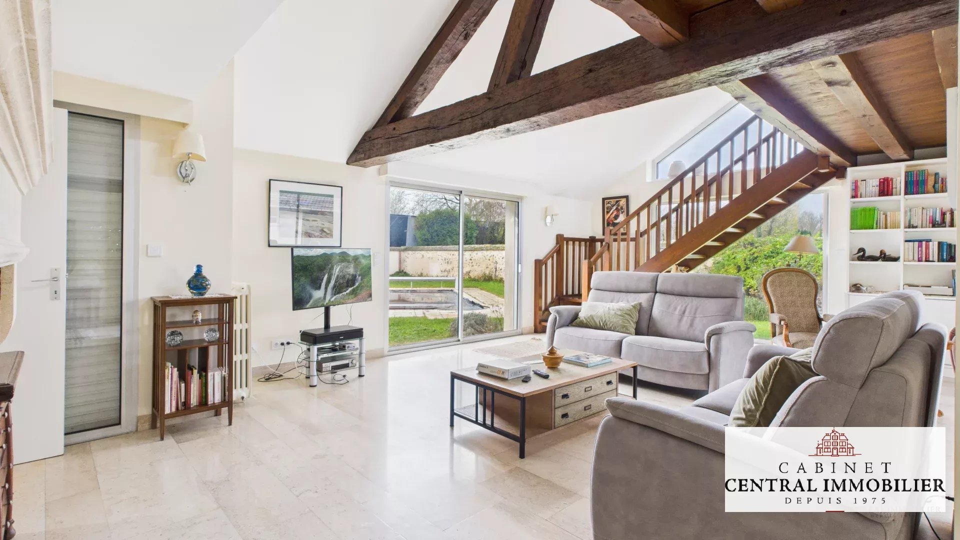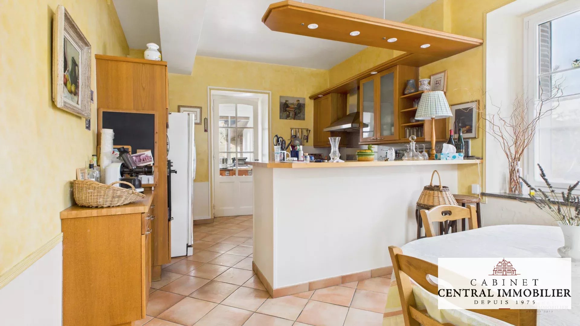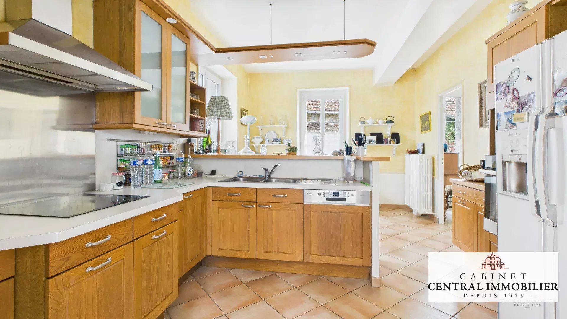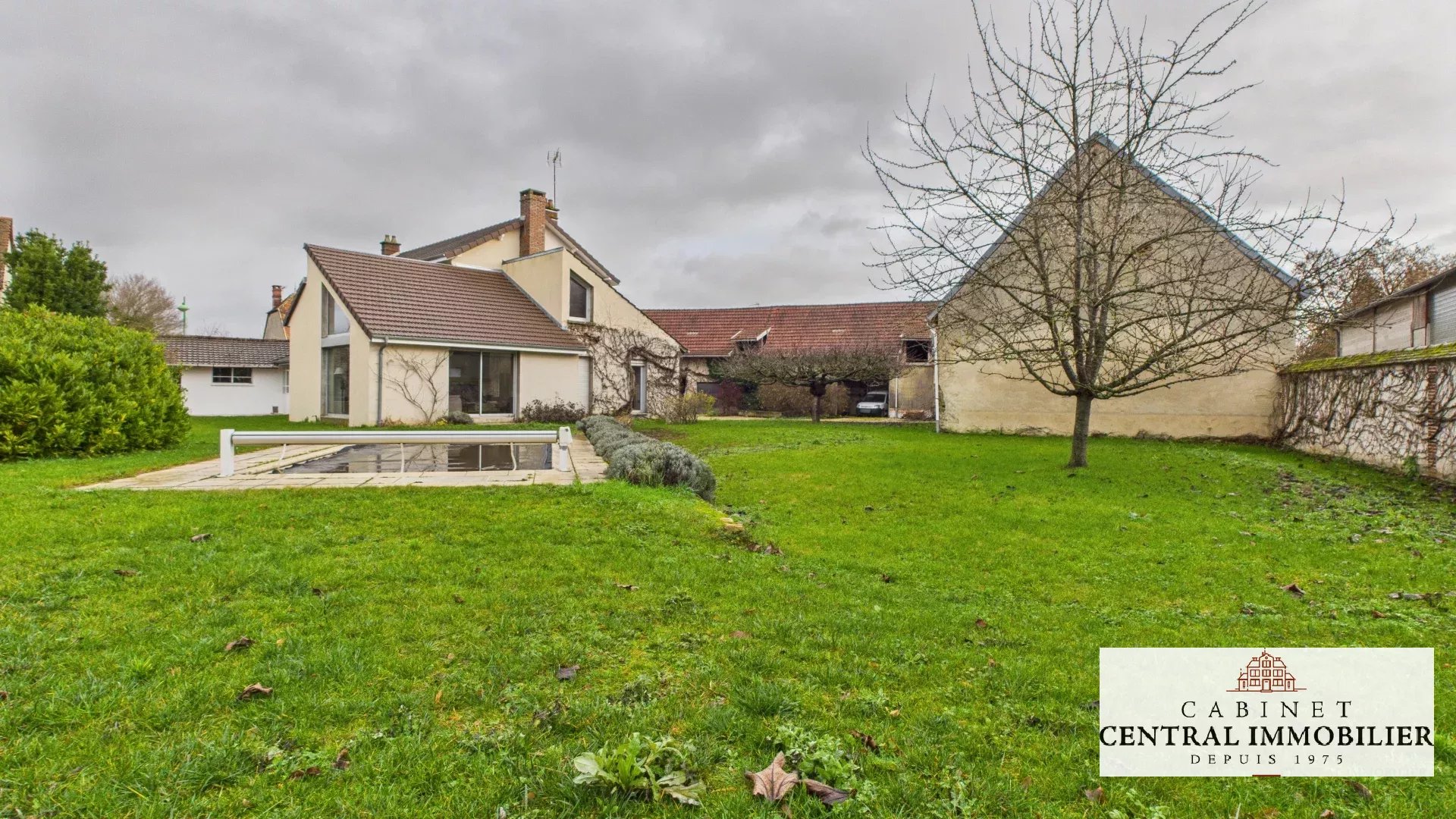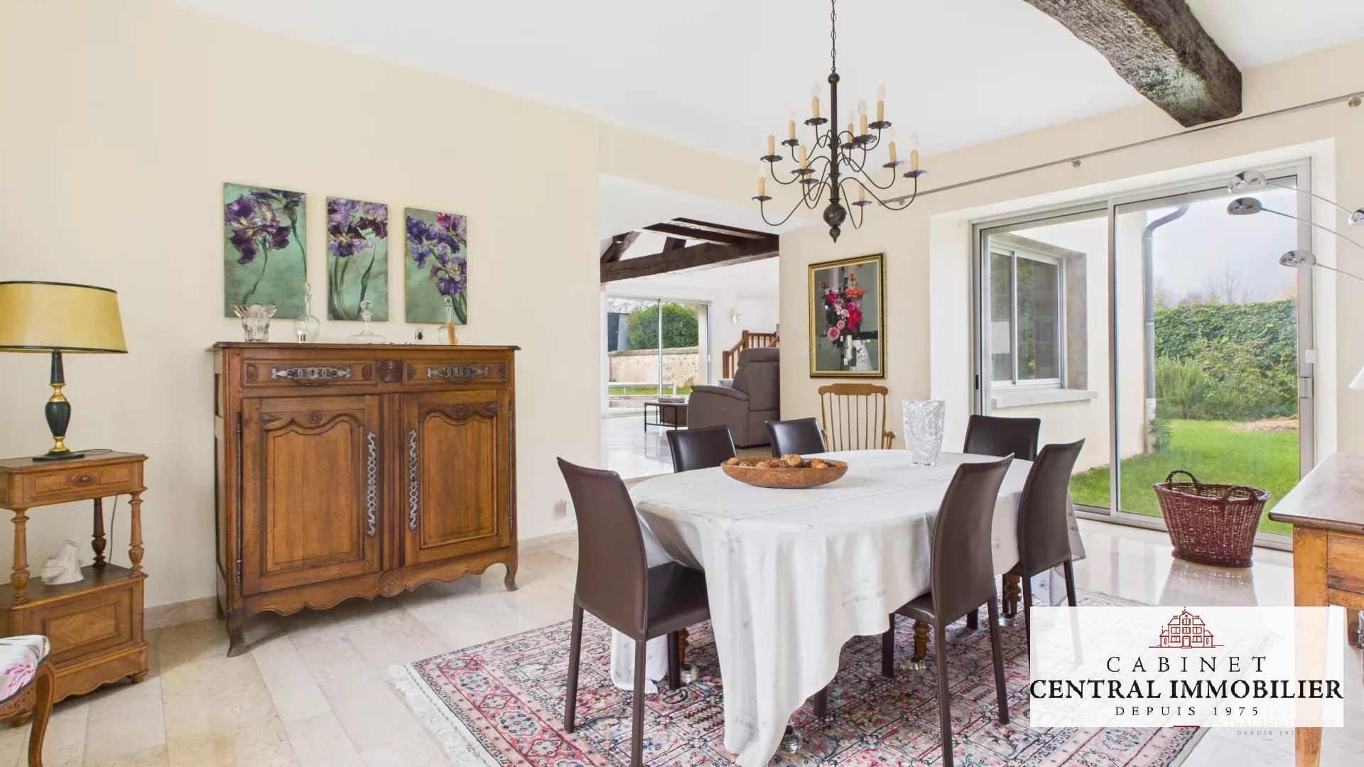 Maison comprenant : entrée de 12m² sol pierres de bourgogne avec placard et penderie, cuisine dinatoire de 20.80m² carrelée aménagée équipée accès véranda à usage d'arrière cuisine et buanderie, beau séjour salon de 75m² sol pierres de bourgogne avec baies vitrées et cheminée foyer ouvert, bureau de 4.70m² sol pierres de bourgogne, wc, salle d'eau (douche à l'italienne) sol pierres de bourgogne. À l'étage : palier parqueté, 3 chambres de 12.85m²/16m² et 16.20m² parquetées dont une avec 3 placards, chambre parentale de 13.50m² avec salle d'eau de 7m², wc. Mezzanine et une pièce grenier avec fenêtre. Chauffage central par PAC eau/eau. Double vitrage. Volets roulants électriques sur baies vitrées. Terrasse sol pierres avec préau et remise. Piscine enterrée et chauffée de 4x8. Chaufferie. Cave. Grange de 400m² environ avec 2 garages. Bureau indépendant. Portail motorisé. Agréable terrain clos de 1877m².