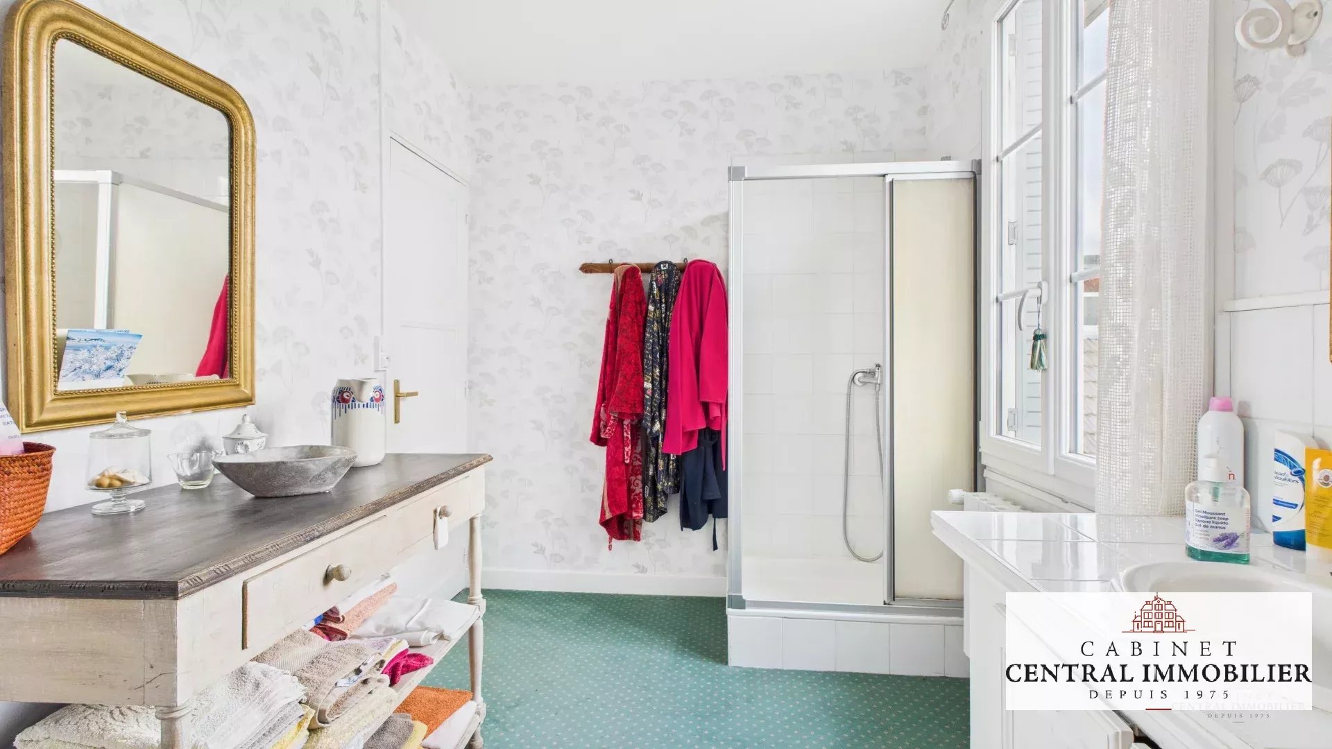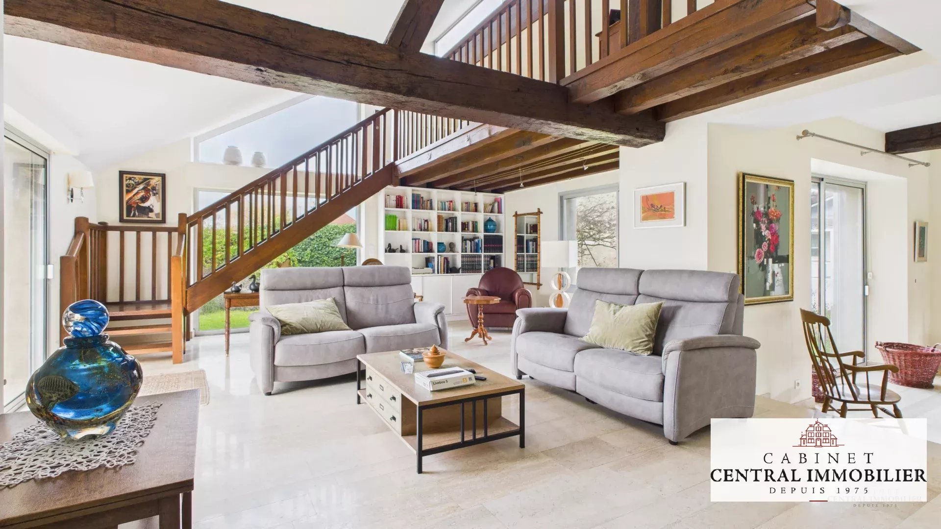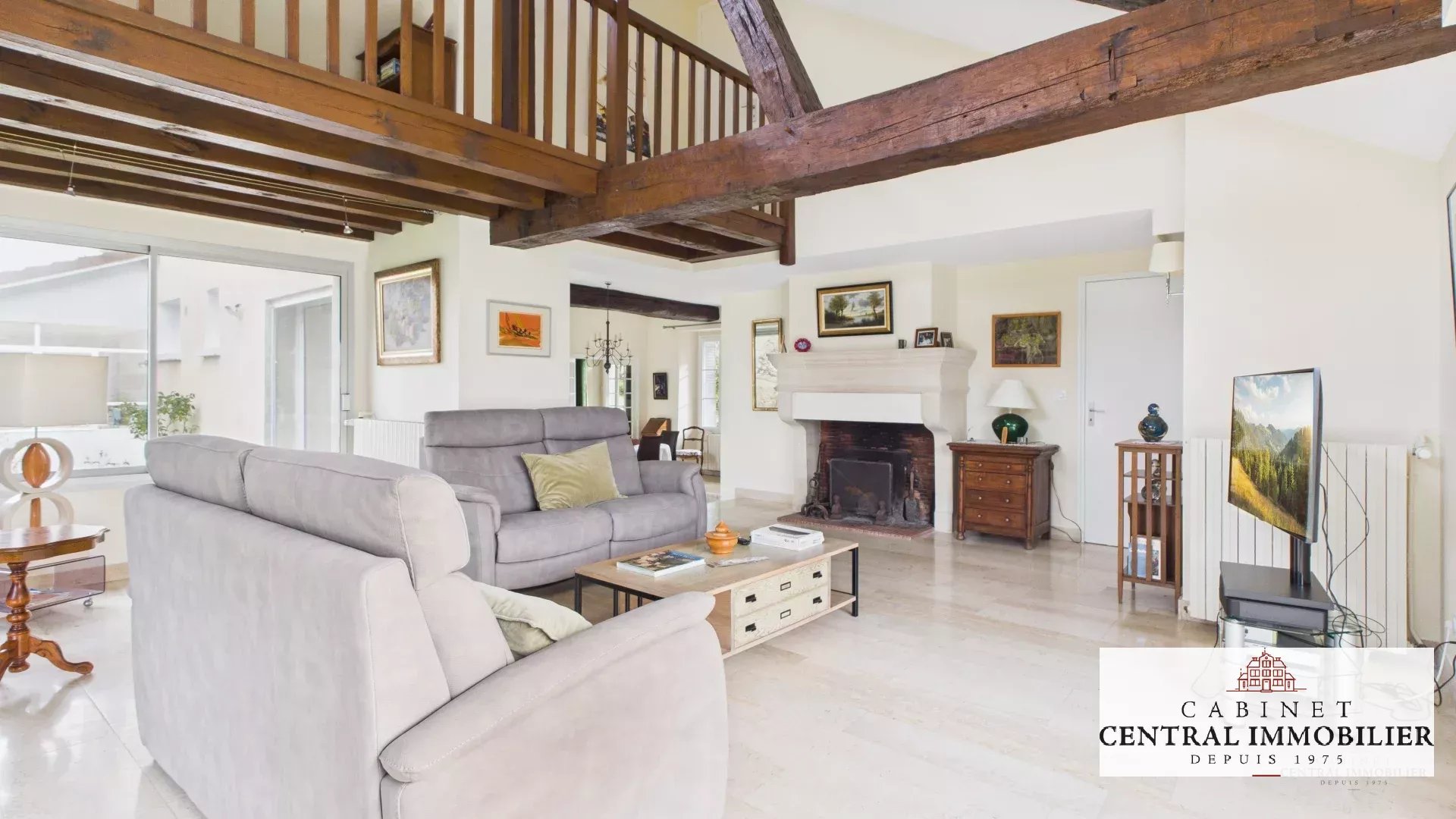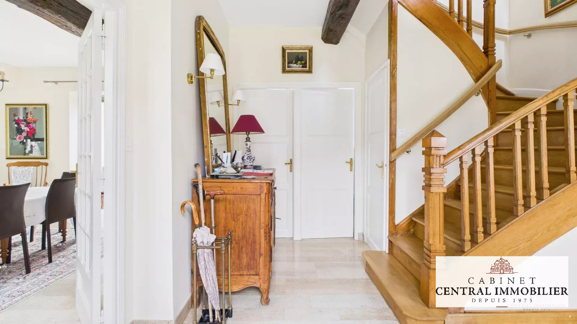 Maison comprenant : entrée de 12m² sol pierres de bourgogne avec placard et penderie, cuisine dinatoire de 20.80m² carrelée aménagée équipée accès véranda à usage d'arrière cuisine et buanderie, beau séjour salon de 75m² sol pierres de bourgogne avec baies vitrées et cheminée foyer ouvert, bureau de 4.70m² sol pierres de bourgogne, wc, salle d'eau (douche à l'italienne) sol pierres de bourgogne. À l'étage : palier parqueté, 3 chambres de 12.85m²/16m² et 16.20m² parquetées dont une avec 3 placards, chambre parentale de 13.50m² avec salle d'eau de 7m², wc. Mezzanine et une pièce grenier avec fenêtre. Chauffage central par PAC eau/eau. Double vitrage. Volets roulants électriques sur baies vitrées. Terrasse sol pierres avec préau et remise. Piscine enterrée et chauffée de 4x8. Chaufferie. Cave. Grange de 400m² environ avec 2 garages. Bureau indépendant. Portail motorisé. Agréable terrain clos de 1877m².