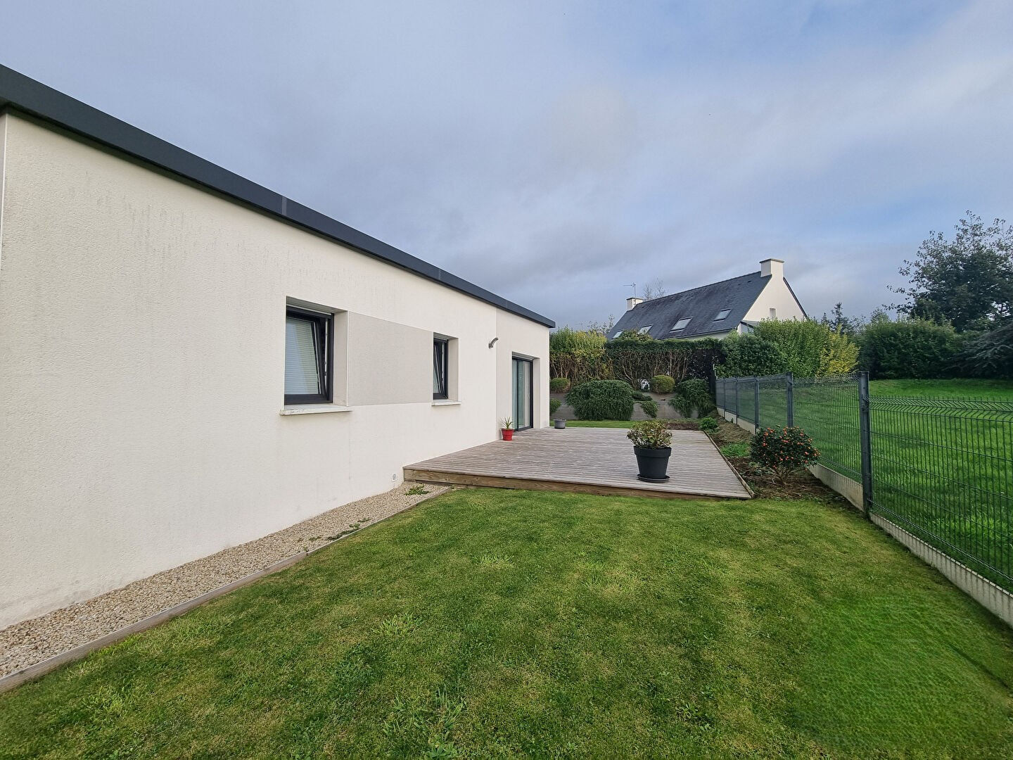 CONCARNEAU. RIVE DROITE. VENEZ VITE DECOUVRIR CE VERITABLE PLAIN PIED DE 2016 SITUE DANS UN LOTISSMENT CALME A QUELQUES MINUTES DES COMMERCES. Il comprend entrée avec placard, cuisine aménagée et équipée ouverte sur salon séjour avec accès belle terrasse bois, 3 chambres, salle de douche et wc. Garage attenant. Locataires en place, au plus tard jusqu'en février 2027, le préavis pour vendre a été donné. (5.35 % honoraires TTC à la charge de l'acquéreur.)