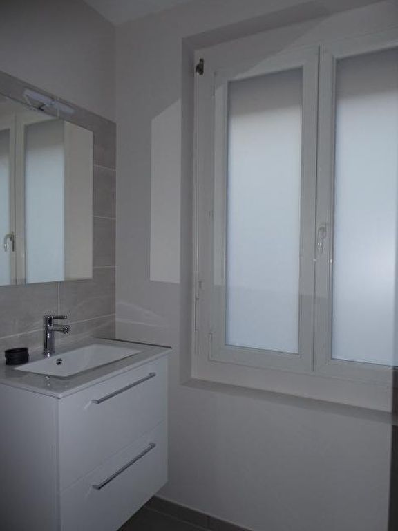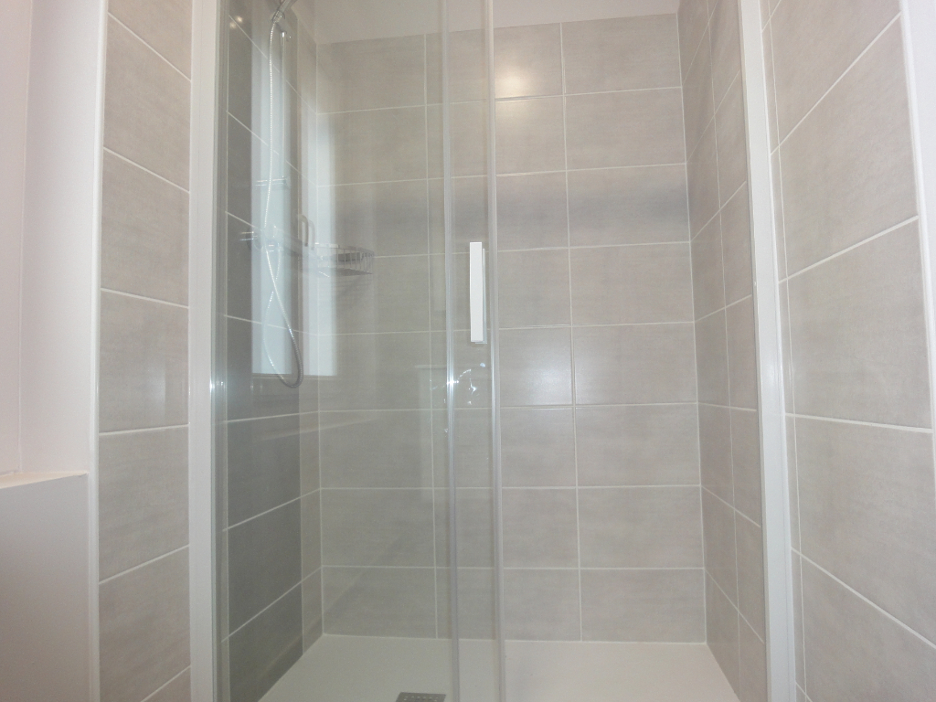 RODEZ : T1 Bis duplex, déco contemporaine comprenant au : RC : une cuisine équipée (placards hauts et bas, hotte aspirante, four à pyrolyse, plaque de cuisson vitrocéramique, frigidaire) ouverte sur le séjour exposé Ouest, salle d'eau aménagée (douche à l'italienne, meuble vasque), WC indépendant, dégagement avec un placard, Étage : une chambre avec un placard, un bureau Chauffage individuel électrique