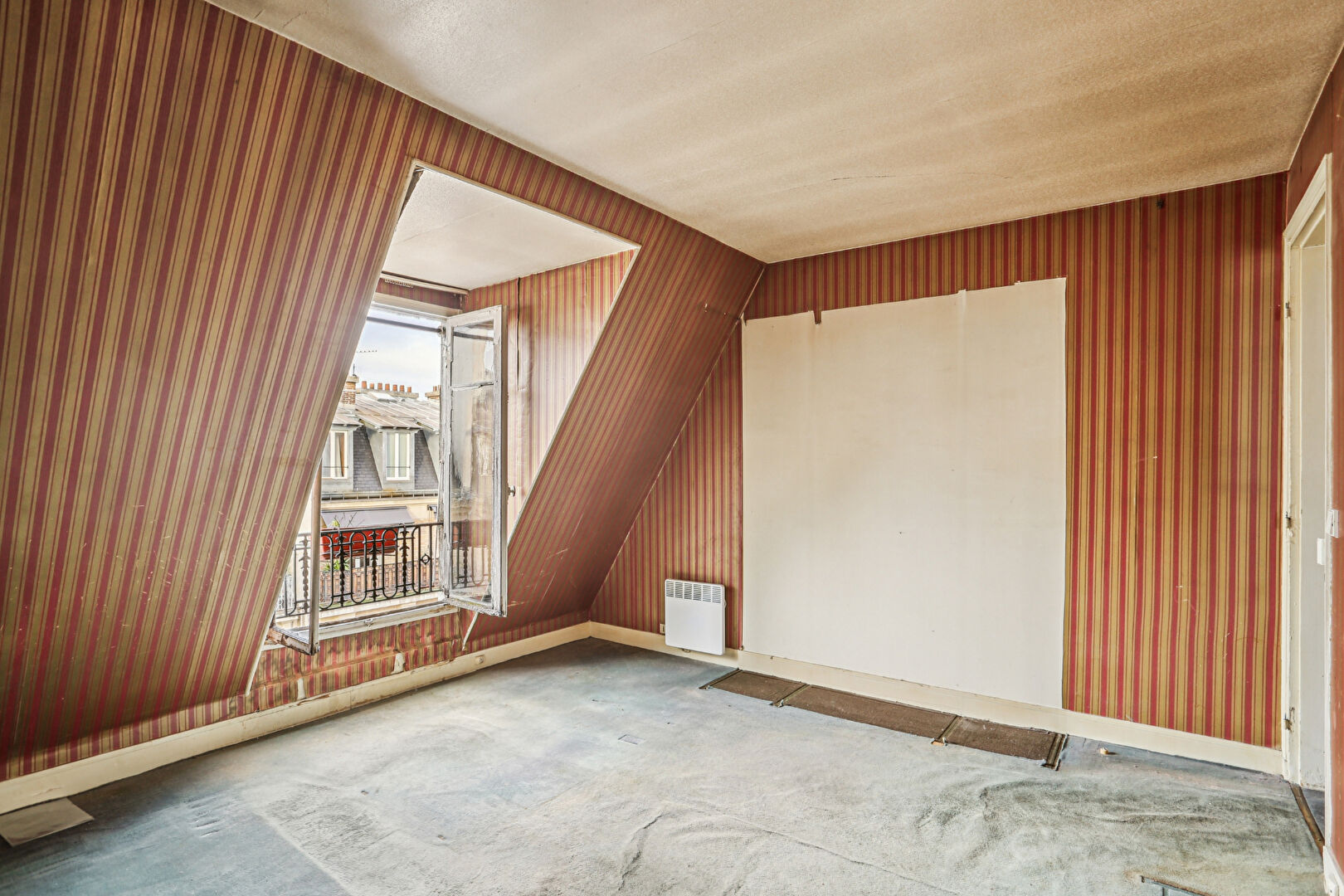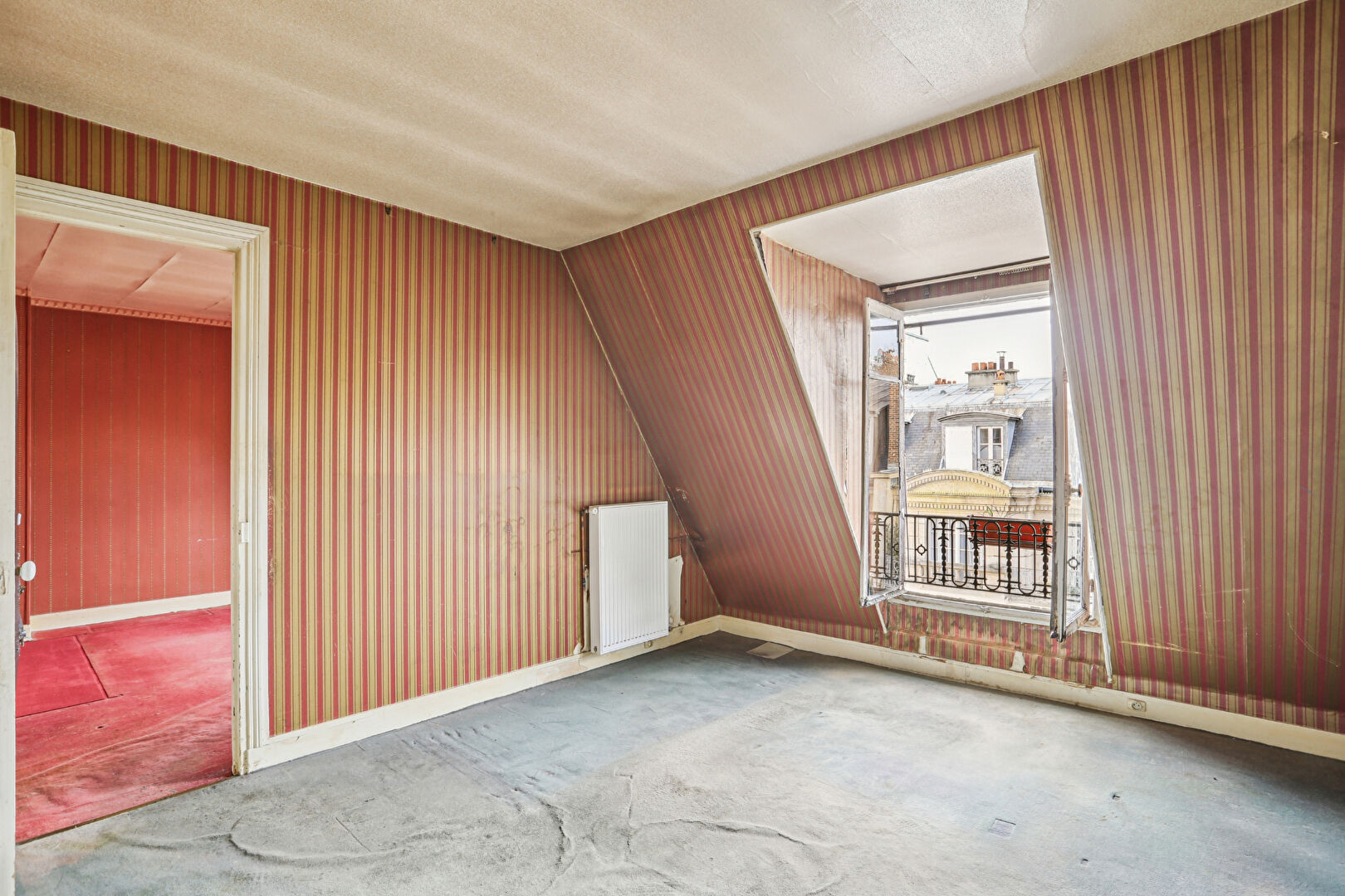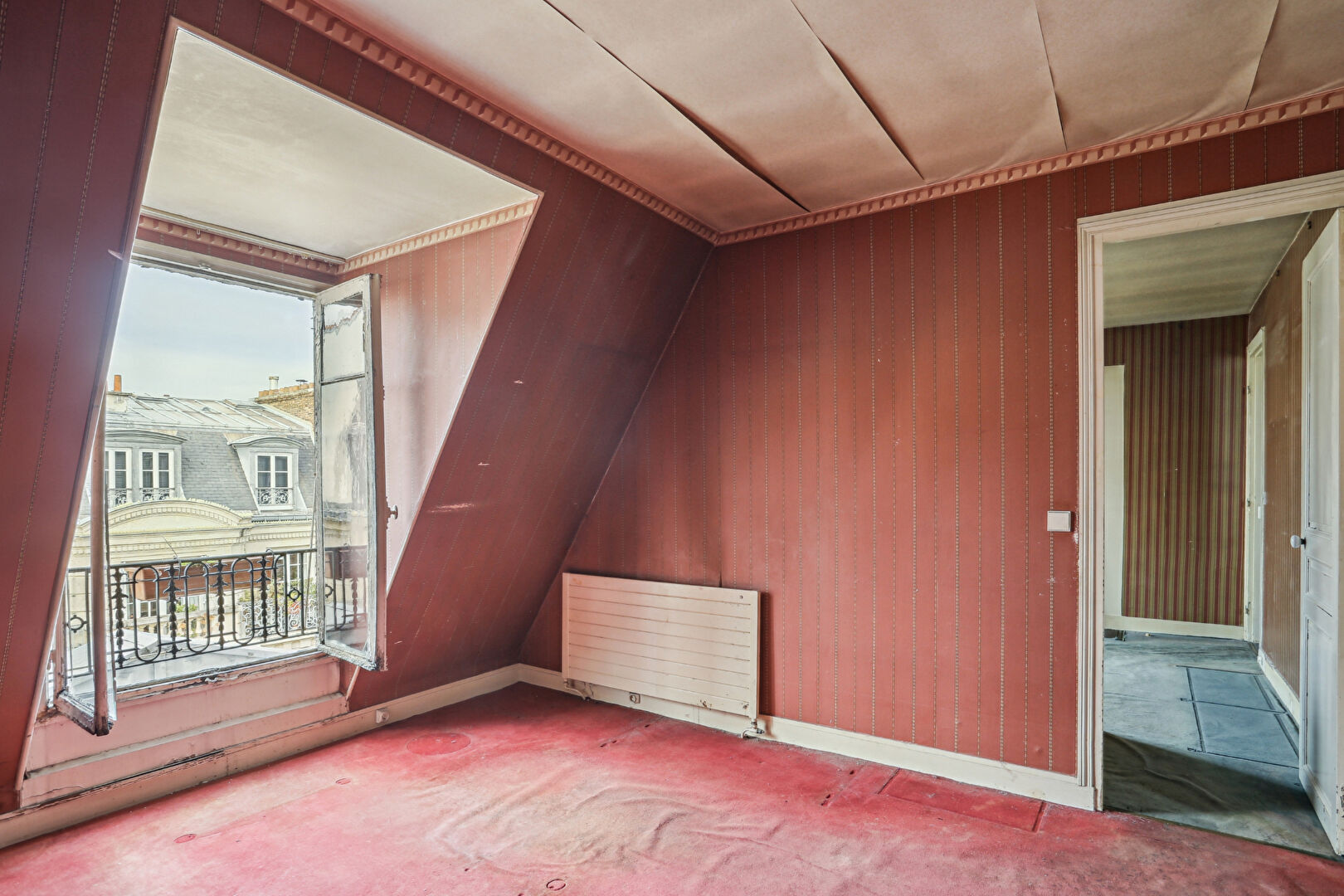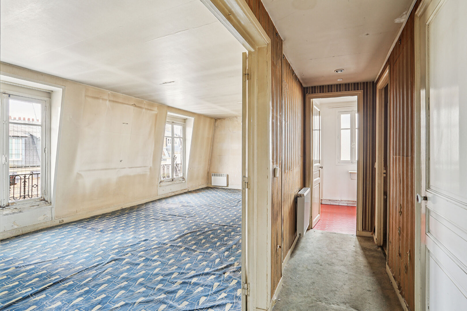 Au 7ème et dernier étage d'un bel immeuble de style haussmannien, accessible par ascenseur jusqu'au 6ème étage puis par un ultime palier à pied, découvrez cet appartement offrant un magnifique potentiel de rénovation. L'entrée distribue un vaste séjour baigné de lumière de 30m2, agrémenté de deux fenêtres exposées sud-ouest, une cuisine indépendante, trois chambres, une salle de bains avec WC, ainsi qu'un placard avec lavabo pouvant être aménagé en second WC. Un dressing agrémente l'entrée. Une cave vient compléter ce bien. Un bien rare à réinventer au coeur d'une adresse recherchée. (4.44 % honoraires TTC à la charge de l'acquéreur.)