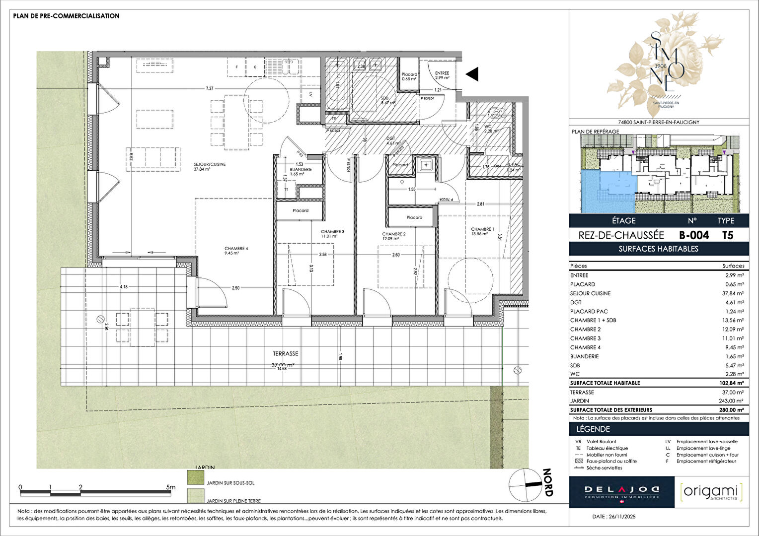 Nouveau Programme Delajod Promotion à St Pierre en Faucigny - Le Simone 1908 T5 de 103m² en rez-de-jardin avec une magnifique terrasse de 37m² et un jardin de 243m2- Triple exposition Est-sud-ouest. Le Simone 1908, nouveau programme signé DELAJOD Promotion Immobilière, est un joyau architectural résolument contemporain qui se distingue par sa personnalité où l'on retrouve uniquement 21 appartements allant du T2 au T5 réunis sur 3 étages. Cette résidence intimiste dévoile un cadre de vie hors du temps avec ses terrasses exceptionnellement grandes et ses jardins arborés. Amoureux de l'excellence artisanale et la performance de l'invisible, Delajod Promotion a placé dans ce programme l'ensemble de ses prestations habituelles que l'on retrouve uniquement chez eux : - Structure en béton banché - Larges baies vitrées coulissantes de marque VEKA France - Cloisons intérieures double peau de 100mm pour un confort acoustique optimal et une résistance accrue - Isolation extérieure avec également un doublage intérieur pour une isolation thermique inégalable - Terrasses 100% étanchées pour assurer la pérennité des façades et éviter tout risque d'infiltration - Utilisation de matières nobles : pierres véritables, verre trempé pour les gardes corps des terrasses, trespa - Portes intérieures cadre faux cadre - Charpente traditionnelle avec chenaux encastrés et rives habillées - PAC individuelle - logements 100% individualisés Deux nouveautés voient le jour dans cette résidence: le rafraichissement au sol et une salle de sport pour les résidents Garages doubles commandés + places extérieures privatives. Le stationnement est plus que généreux et offre un véritable confort au quotidien Le Simone 1908 est situé dans un environnement calme, entièrement scellé, et toutes les commandités sont accessibles à pied à moins de 500m : Collège, Ecole, Salon de thé, centre village, Gare Ceva. Genève et Annecy sont situés à 25 min Copropriété de 004 lots (Pas de procédure en cours). Charges annuelles : 350 euros. Sandrine DELAJOD (EI) Agent Commercial - Numéro RSAC : - .