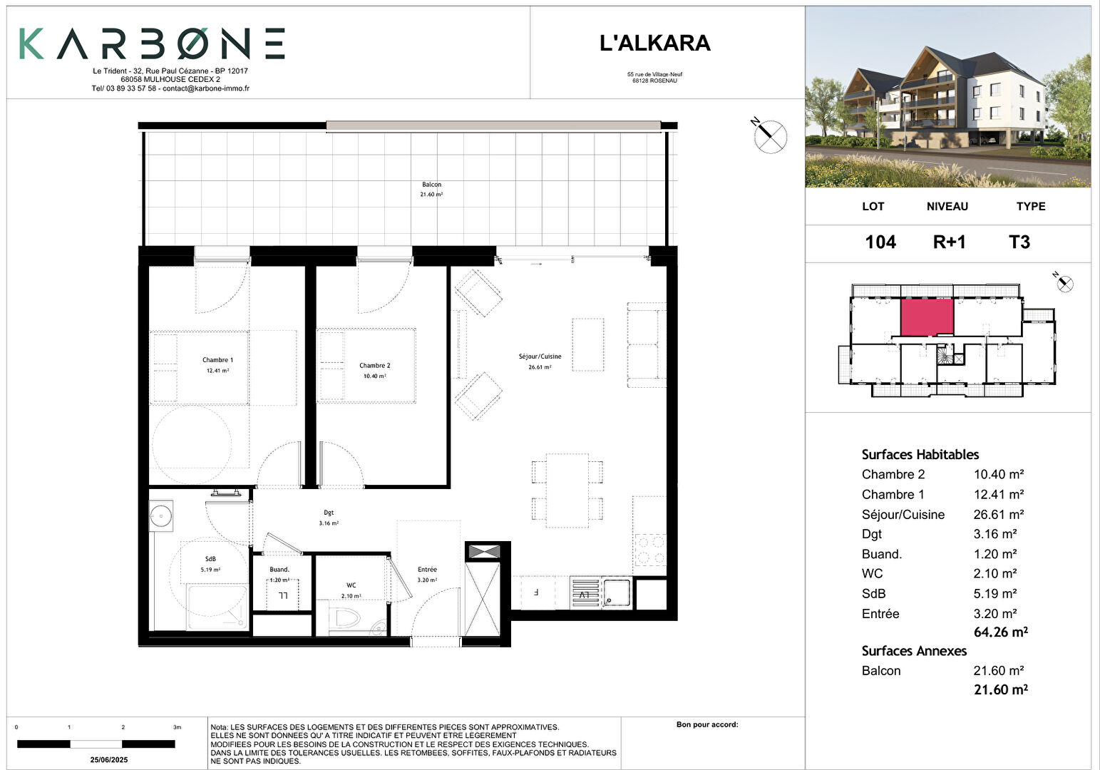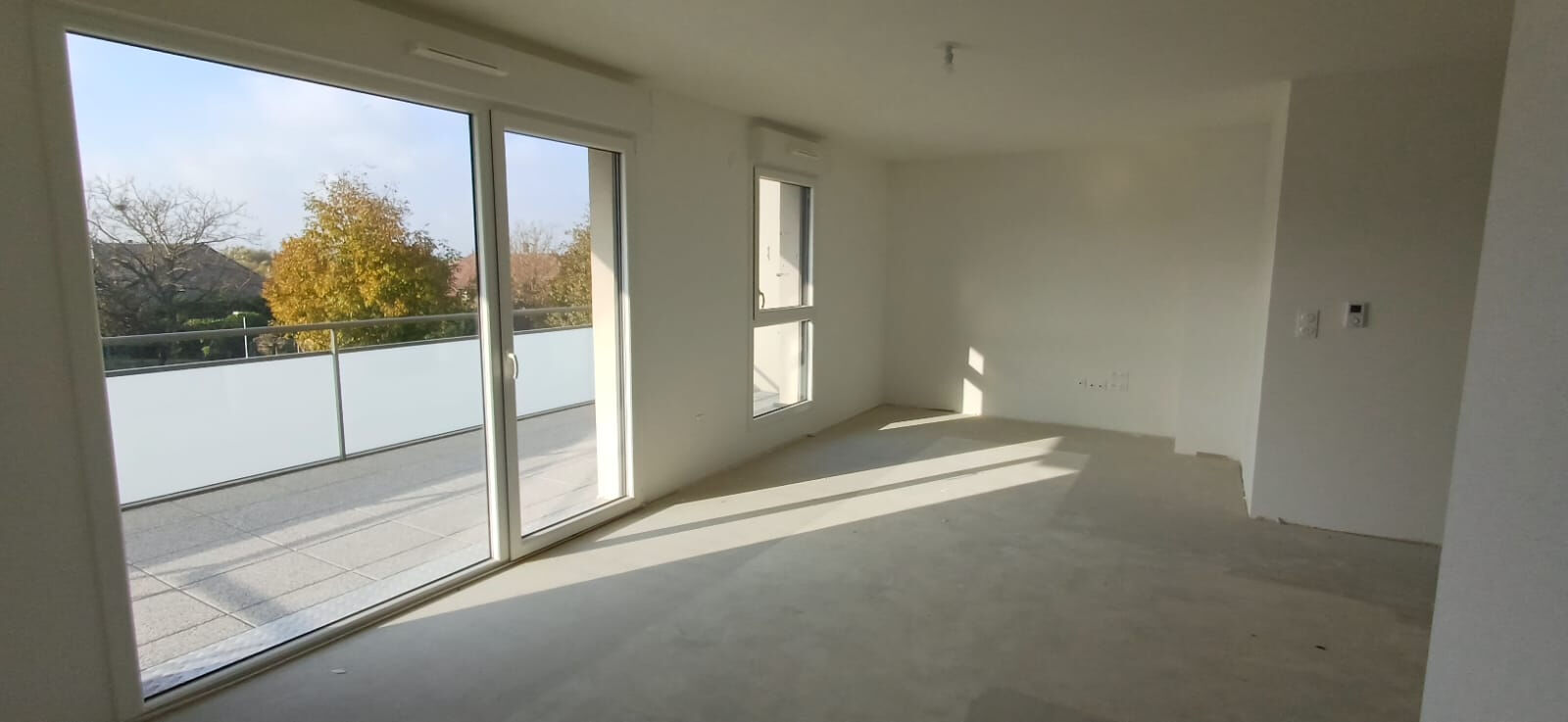 A Rosenau, rue de Village-Neuf, découvrez ce T3 de 64,26 m², situé au 1er étage d'une résidence de standing récente. Un appartement lumineux, moderne et très bien agencé, idéal pour une famille, un couple ou un investisseur recherchant un bien de qualité. Description du bien : Séjour/cuisine lumineux de 26,61 m² Deux chambres : 12,41 m² et 10,40 m² Salle de bains carrelée toute hauteur WC séparé Buanderie Entrée avec rangement Balcon généreux de 21,60 m² Garage double + parking privatif inclus Prestations : Chauffage par pompe à chaleur Plancher chauffant/rafraîchissant Construction RE2020 (seuil 2025) ? Classe énergétique A Grandes baies vitrées coulissantes Brise-soleil orientables Ascenseur, caves, parc à vélos Prestations haut de gamme adaptées aux séniors Offre exceptionnelle (réservée aux 5 premiers clients) : Cuisine équipée OFFERTE + Frais de notaire OFFERTS Plusieurs appartements disponibles du T2 au T4 dans la résidence L'Alkara. Terrasses, jardins, garages et parkings selon les lots. Offres exceptionnelles pour les 5 premiers réservataires. Contactez nous pour plus d'informations ou pour programmer une visite !