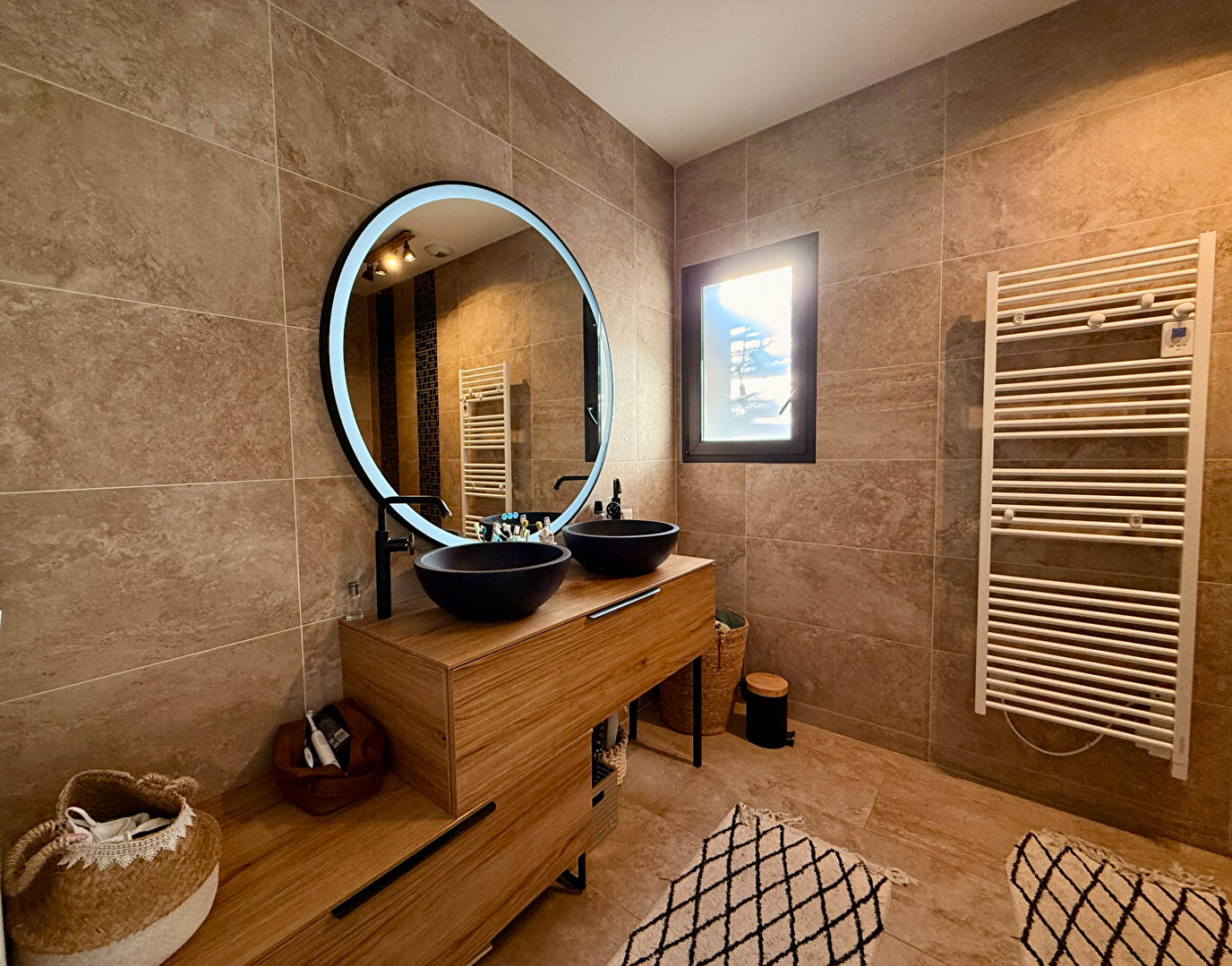 Découvrez cette maison de plain pied à Plan d'Aups Sainte Baume. D'une surface de 126,42 m² (loi carrez). Elle se compose de 5 pièces, dont 4 chambres spacieuses, idéale pour une famille. Le séjour lumineux de 37.49 m² est parfait pour vos moments de convivialité. La cuisine est aménagée et équipée, et vous profiterez d'un confort optimal grâce à la climatisation réversible et au poêle à bois. La maison dispose d'une salle d'eau et d'un WC séparé. Coté extérieur, un terrain de 1000 m² et sa piscine pour profiter des journées ensoleillées. Construite en 2021, un garage attenant de 24.59 m² et 4 places de parking sont également inclus. Située dans un quartier calme, cette maison est proche des commodités. Les informations sur les risques auxquels ce bien est exposé sont disponibles sur le site Géorisques : www.georisques.gouv.fr. Bien proposé par Natalia RAJCHERT 0664309698, agent commercial EI immatriculé au RSAC Draguignan sous le n° 980785760. Agence ABC IMMO située 58 rue Jules Ferry 83170 Brignoles, SIREN 803693795. CPI 83012016000004033 délivrée par la CCI du Var.
