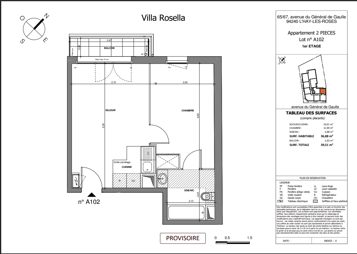 NOUVEAU A L'HA?-LES-ROSES ? Résidence Villa Rosella ! Découvrez ce charmant appartement 2 pièces idéalement situé au 1er étage de la résidence contemporaine Villa Rosella, au coeur d'un environnement calme et recherché. Avec une surface habitable de 36,88 m², ce logement a été pensé pour offrir un maximum de confort et un agencement parfaitement optimisé. L'espace de vie se compose d'un Séjour/Cuisine de 19,01 m², lumineux grâce à ses ouvertures et conçu pour répondre aux besoins du quotidien. Il s'ouvre sur un balcon privatif de 2,63 m², un véritable plus pour profiter d'un extérieur agréable aux beaux jours. La Chambre de 12,99 m² constitue un espace nuit confortable, idéal pour garantir calme et sérénité. La Salle d'eau avec WC de 4,88 m² complète ce bien fonctionnel, aménagée avec des prestations modernes. Avec une surface totale de 39,51 m², cet appartement offre un cadre de vie pratique au sein d'une résidence sécurisée, à proximité immédiate des commerces, écoles, transports et des principaux axes routiers, permettant un quotidien fluide et agréable. Un logement idéal pour un premier achat, un investissement ou pour profiter d'un cadre de vie paisible tout en restant proche des commodités. Nos conseillers sont à votre disposition pour toute information complémentaire.