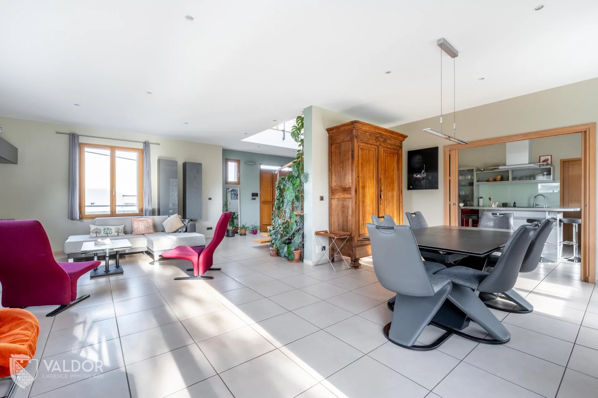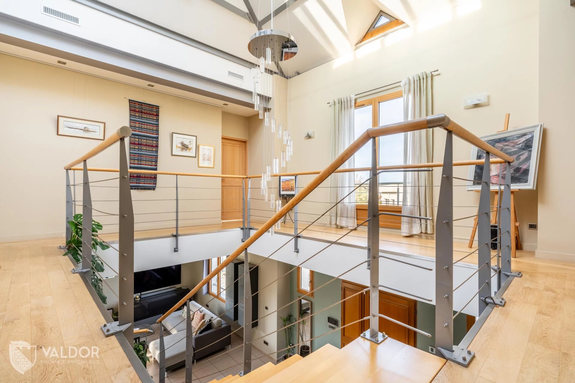Le hall d'entrée s'ouvre sur un espace de 80 m² de pièces de vie et cuisine semi ouverte, tout en vous projetant à l'étage jusqu'au 9 m du dôme de verre sommital, qui domine la coursive desservant 3 chambres et une vaste salle de bain. Un bureau et une salle d'eau de plain-pied, ainsi qu'un sous-sol de 180 m² avec garage et cave à vin complètent ce bien parfaitement optimisé.