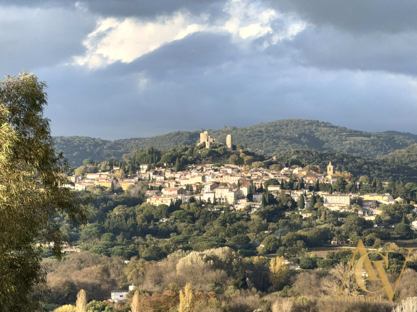 L'entrée mène vers un beau séjour/cuisine baigné de lumière, ouvert sur une spacieuse terrasse de 32 m² avec une vue dégagée sur Grimaud, véritable atout charme du bien.