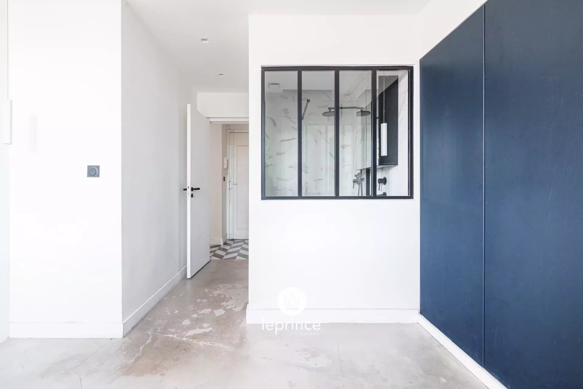 Chambre en suite avec salle d’eau séparée par une verrière atelier, W.-C. indépendants, grand placard de rangements intégrés avec lave-linge.