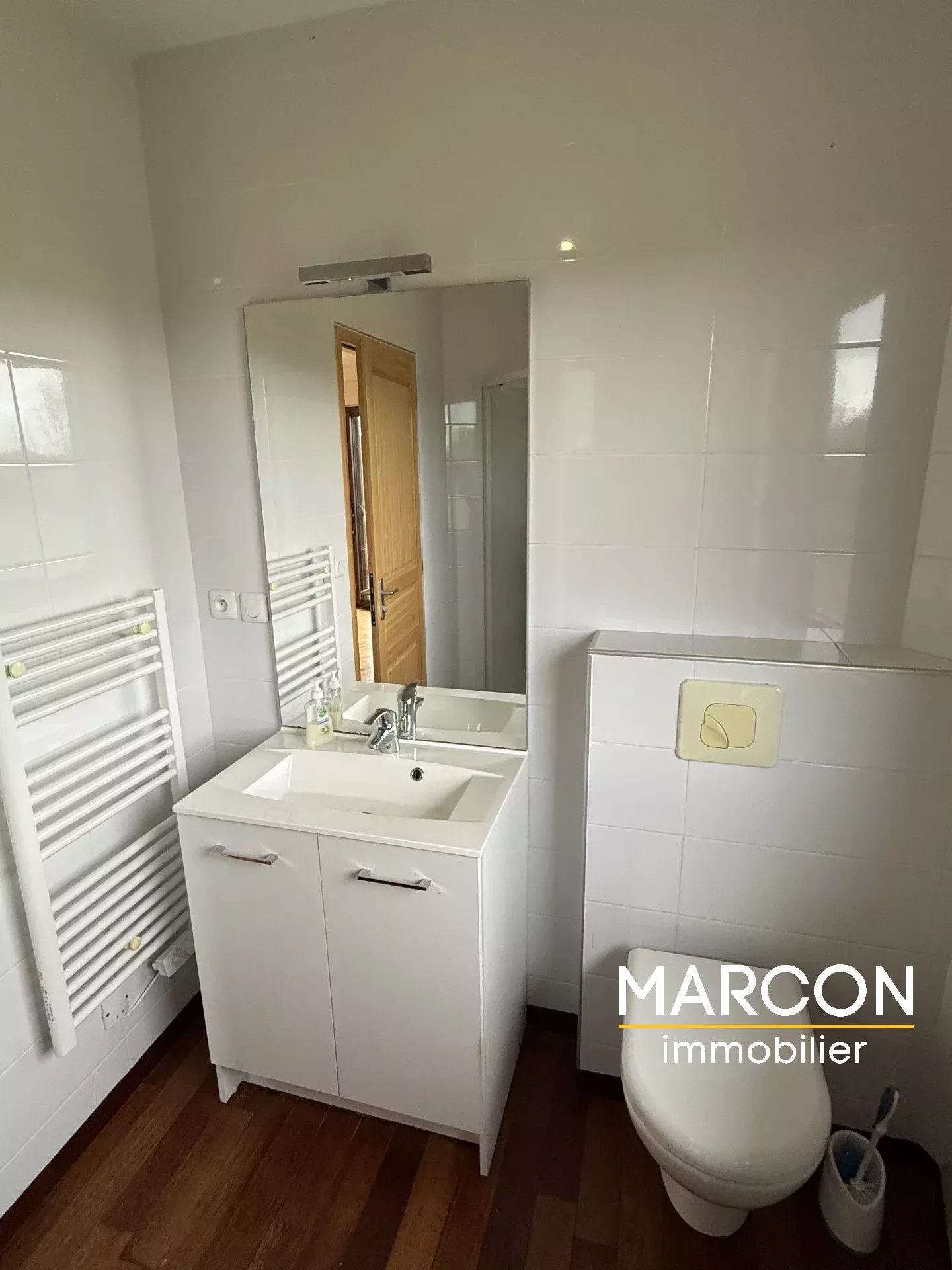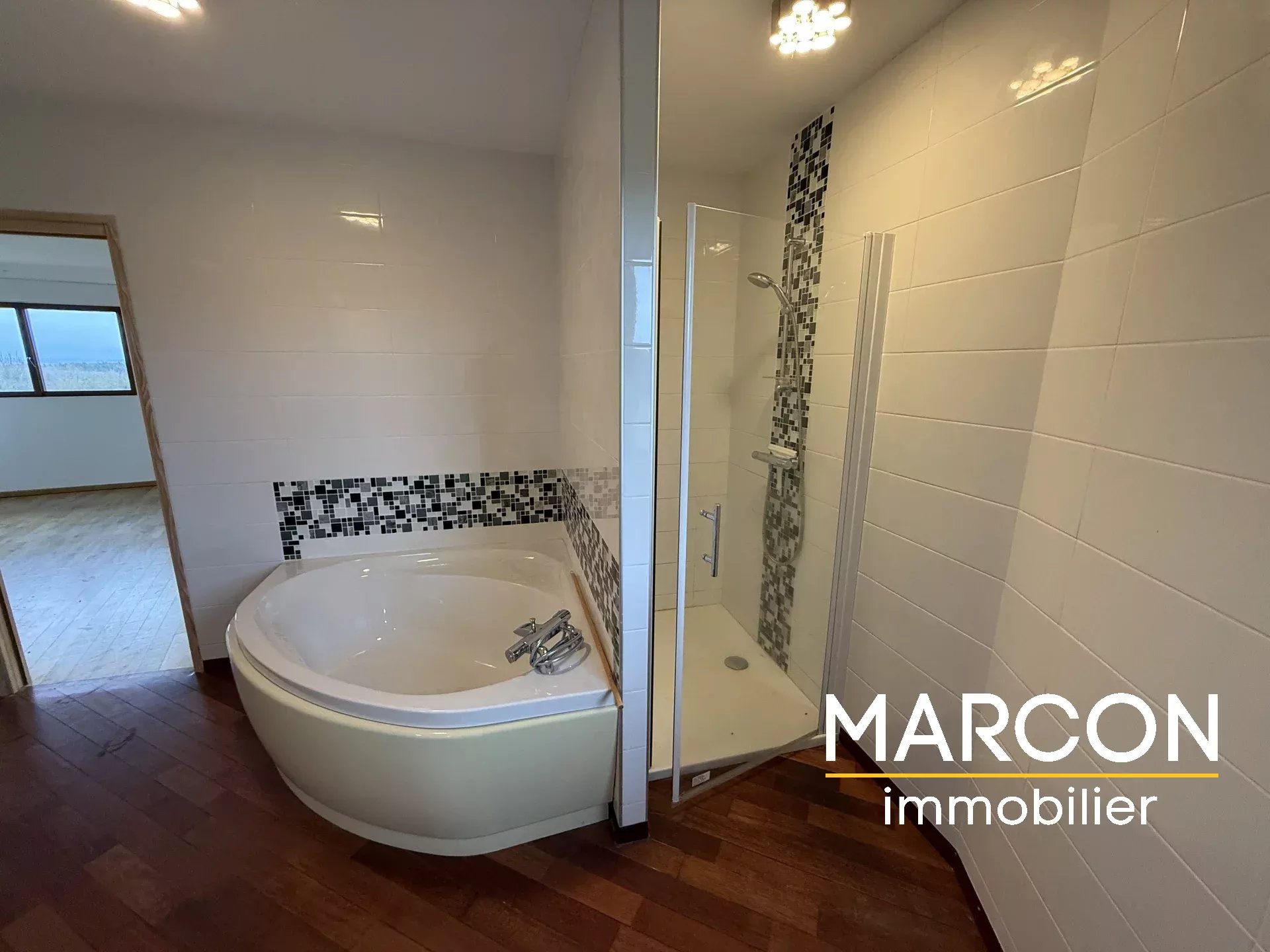 À l’étage, un palier dessert deux chambres, l'une avec balcon et une salle d'eau privative avec douche et W.C., l'autre de 24 m² possède un accès direct sur la salle bains de l'étage avec baignoire, douche et W.C.