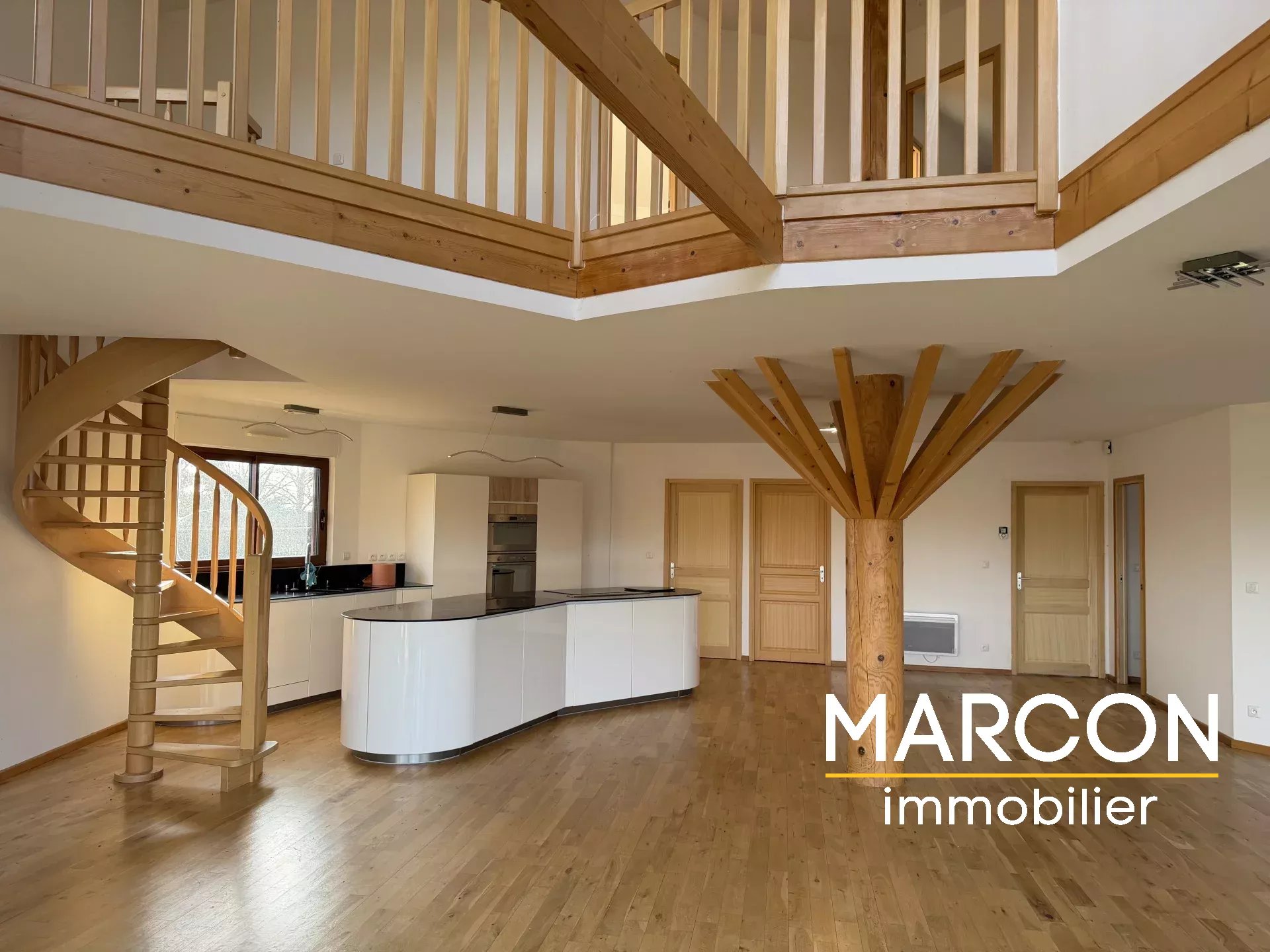 Le rez-de-chaussée comprend un séjour lumineux de 72 m² avec cuisine équipée et accès direct à une terrasse, un coin bureau, deux entrées, une buanderie et un garage.