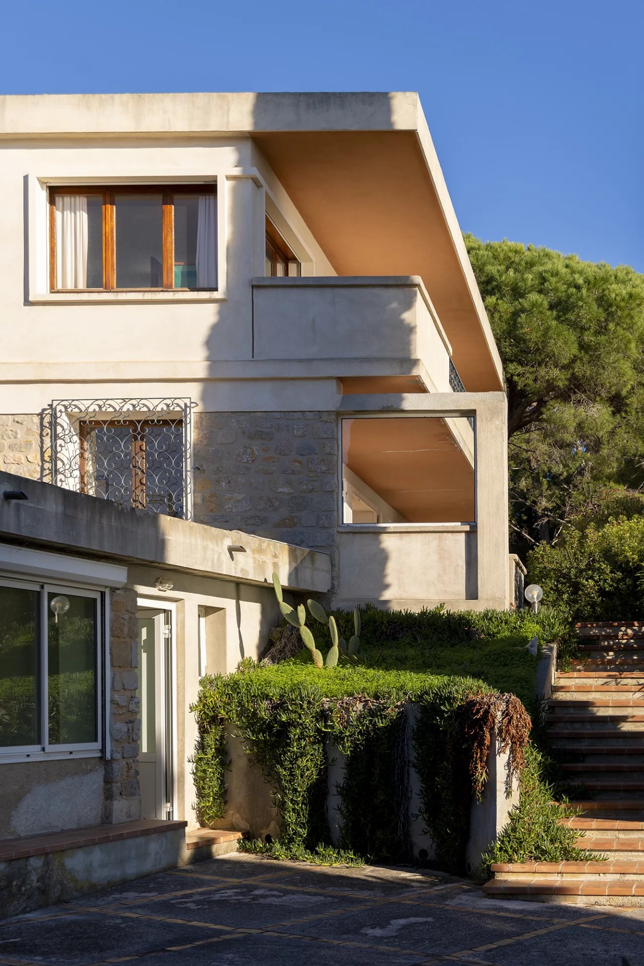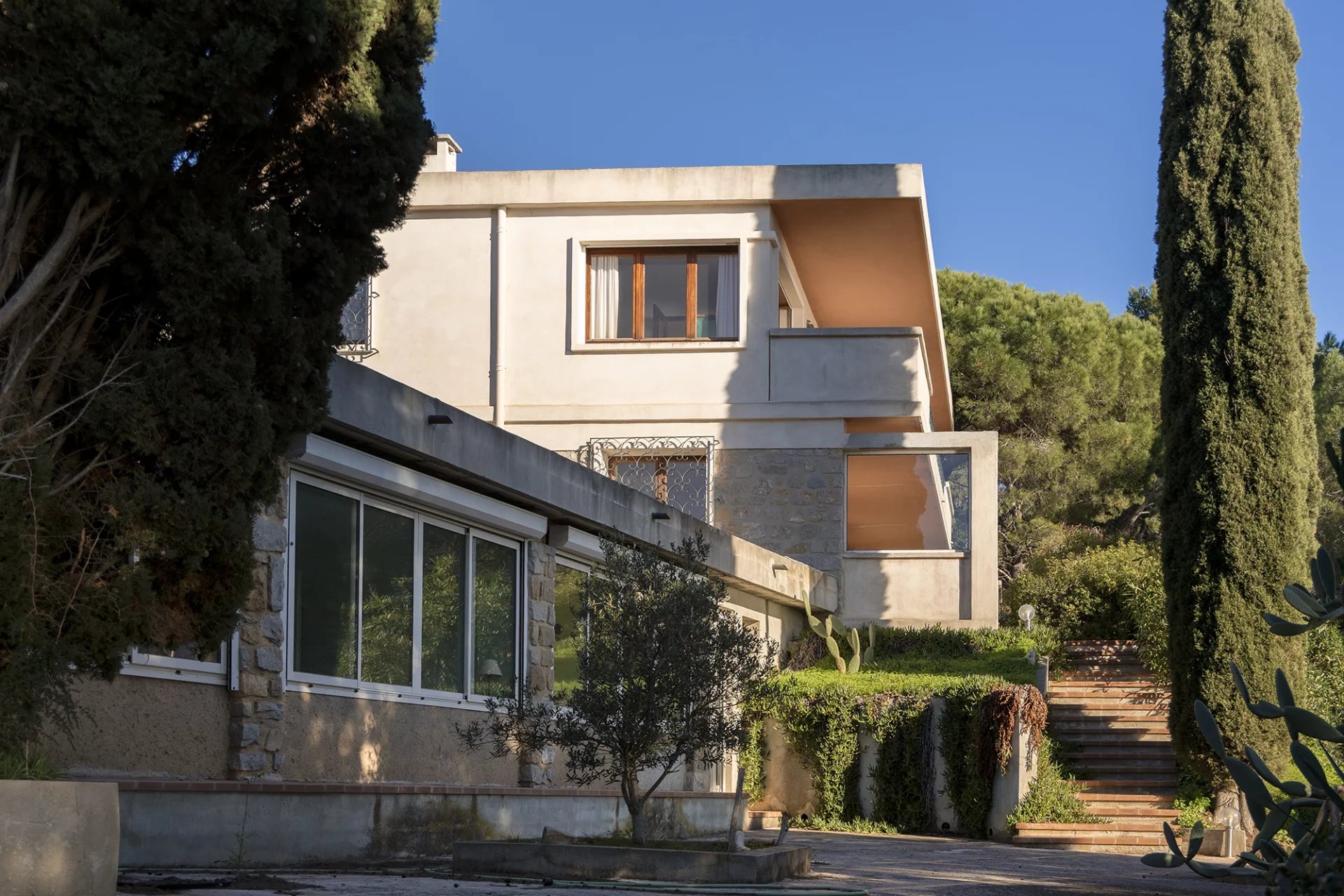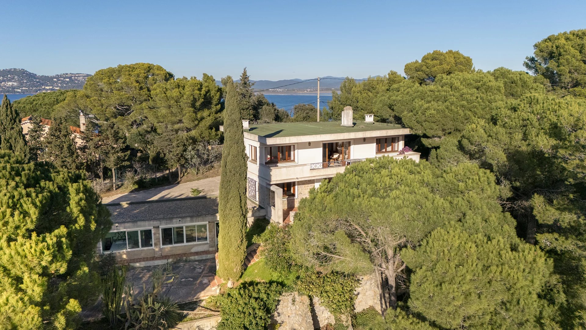 Une villa moderniste en surplomb de la Pointe d’Escampobariou et de la Plage de la Darboussières, réalisée dans les années 1960. Elle profite d’une exposition Sud, d’une vue panoramique sur la mer et la pointe Ouest de la presqu’île de Giens.