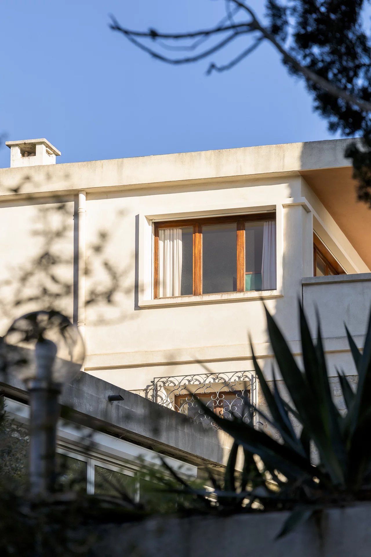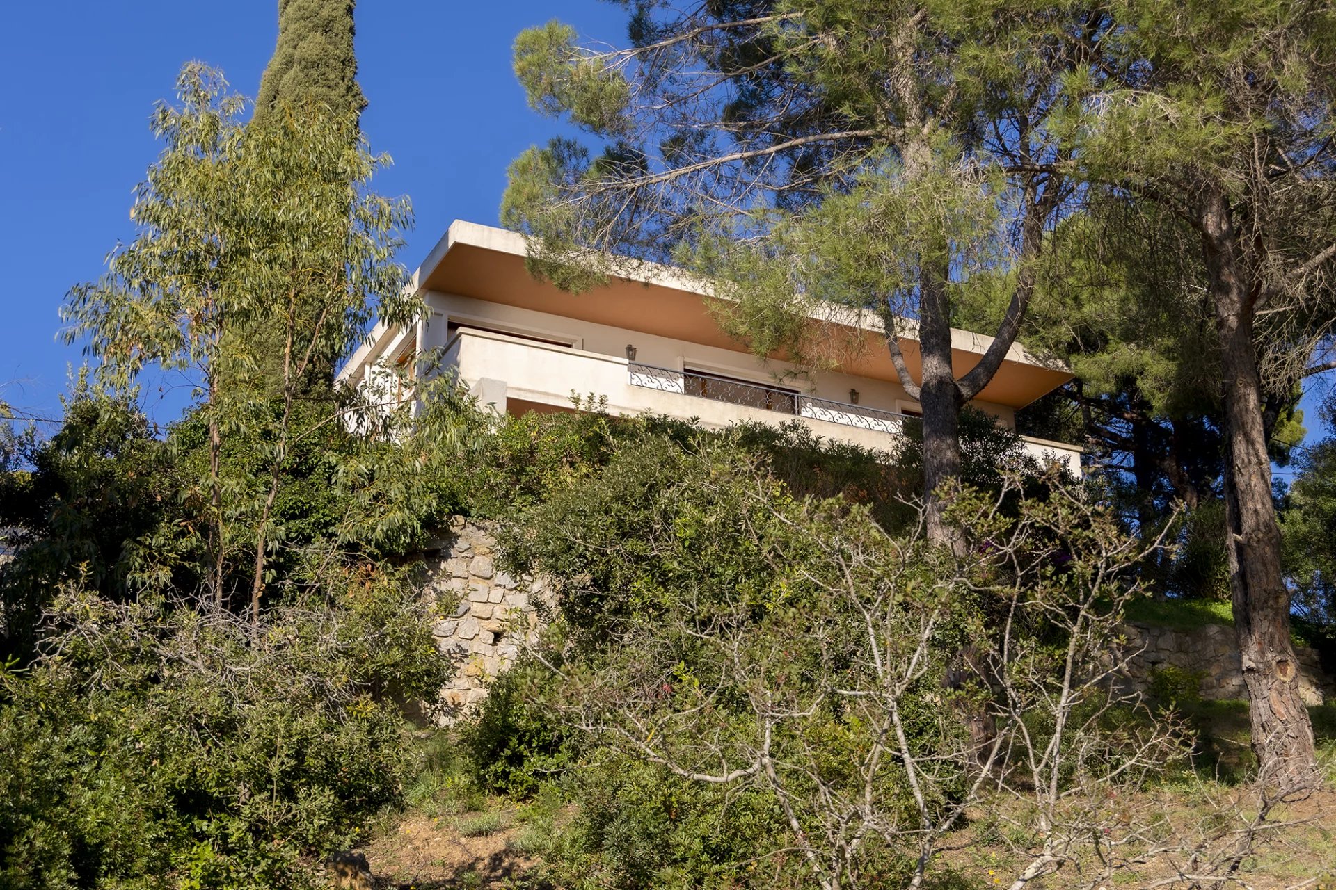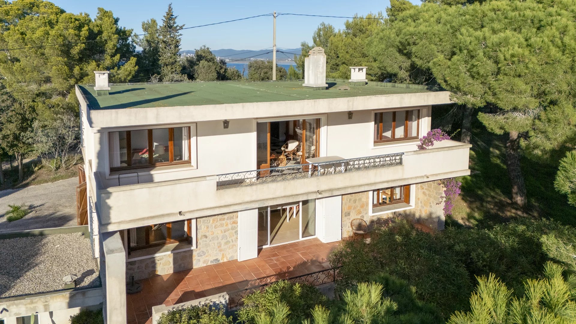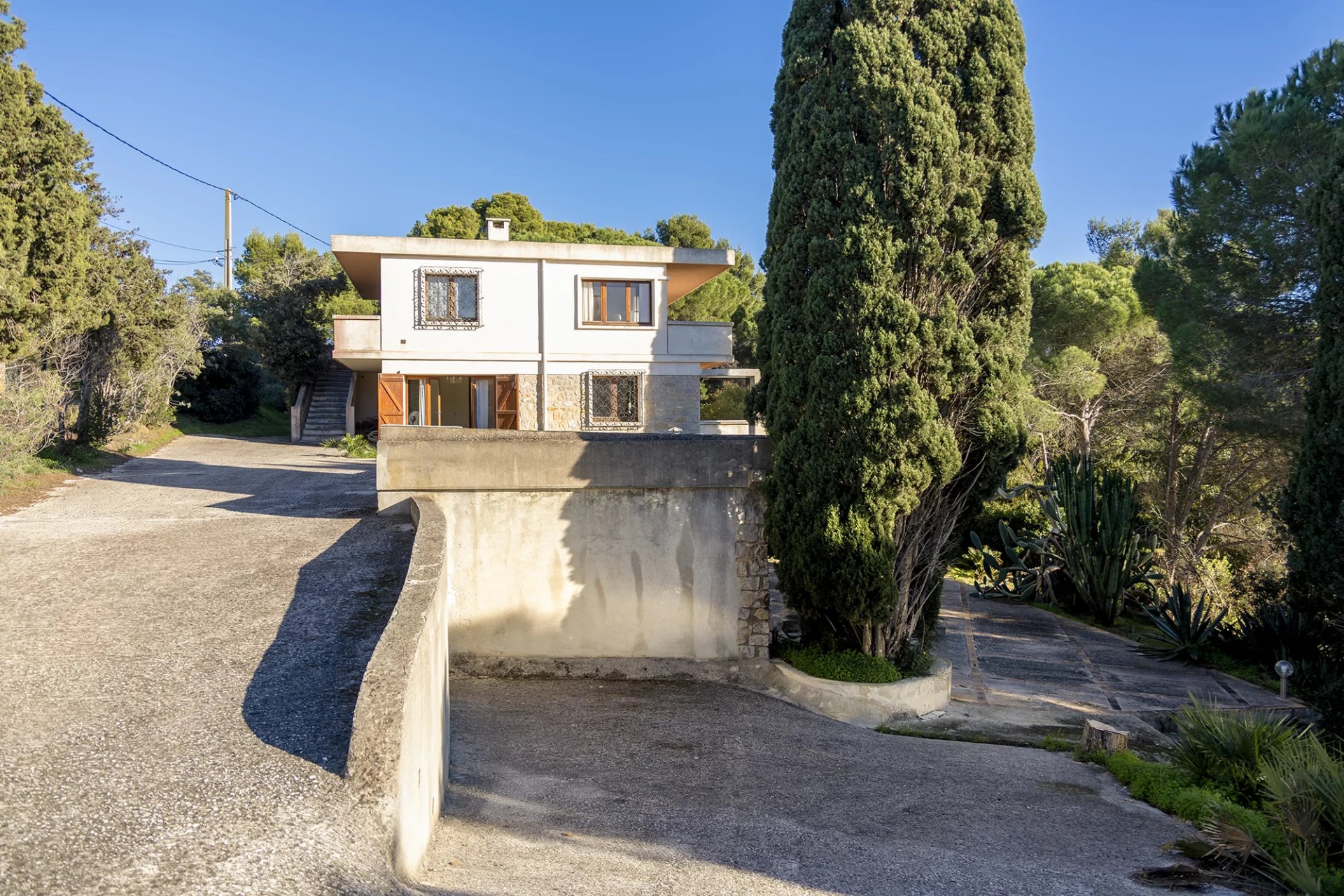 Une villa moderniste en surplomb de la Pointe d’Escampobariou et de la Plage de la Darboussières, réalisée dans les années 1960. Elle profite d’une exposition Sud, d’une vue panoramique sur la mer et la pointe Ouest de la presqu’île de Giens.