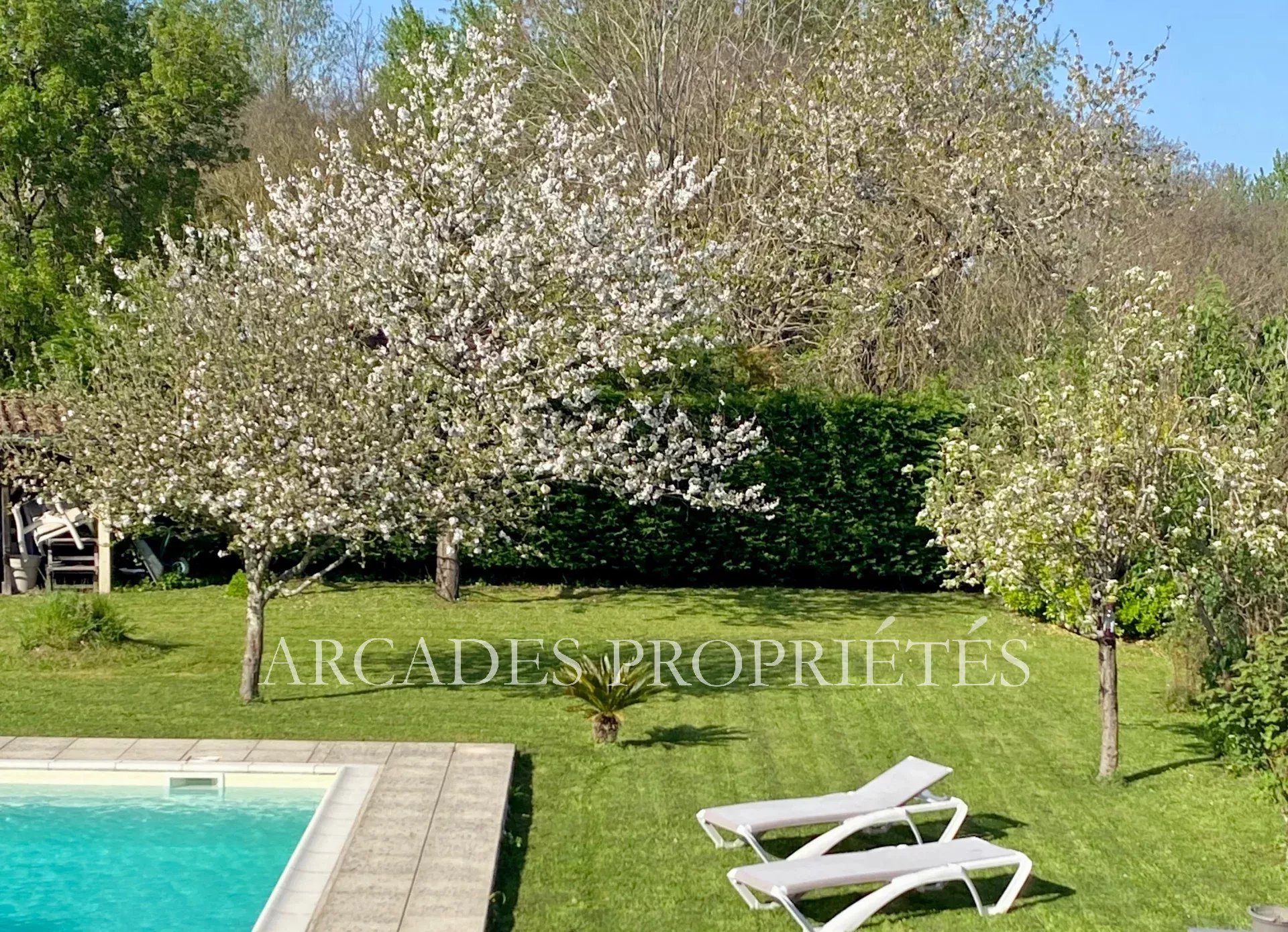 MAISON DE CHARME de type GIRONDINE idéalement localisée sur la commune de Arveyres. La maison très lumineuse comprend en rez de chaussée, une belle pièce de vie avec salle à manger et salon avec cheminée avec insert et ouvrant sur la terrasse du jardin, une cuisine aménagée semi ouverte, avec cellier et une chambre avec douche privative. A l'étage, un grand palier dessert quatre grandes chambres et un bureau et salle de bains spacieuse avec baignoire et douche. La maison dispose également d'un garage attenant. Surface utile de 230m² dont 205m² habitables. Très agréable jardin paysagé avec dépendances et grandes terrasse amenant sur la piscine parfaitement intégré à l'espace extérieur. Propriété aux portes de Libourne. Environnement privilégié, proche des commerces, écoles, collèges et accès routiers. A seulement 30kms de Bordeaux et 15kms de St Emilion. Exclusivité ARCADES PROPRIETES