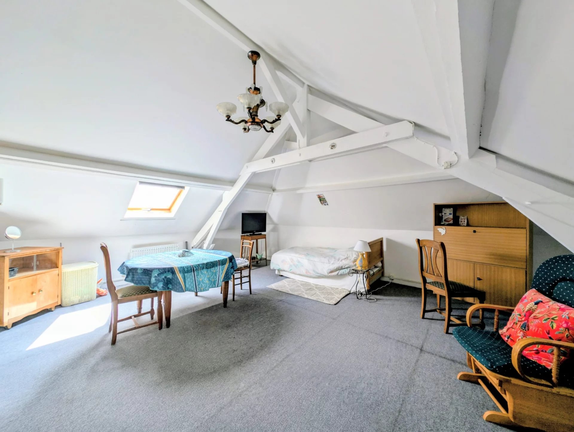 Au dernier niveau : les combles ont été intelligemment transformés en une grande chambre mansardée.