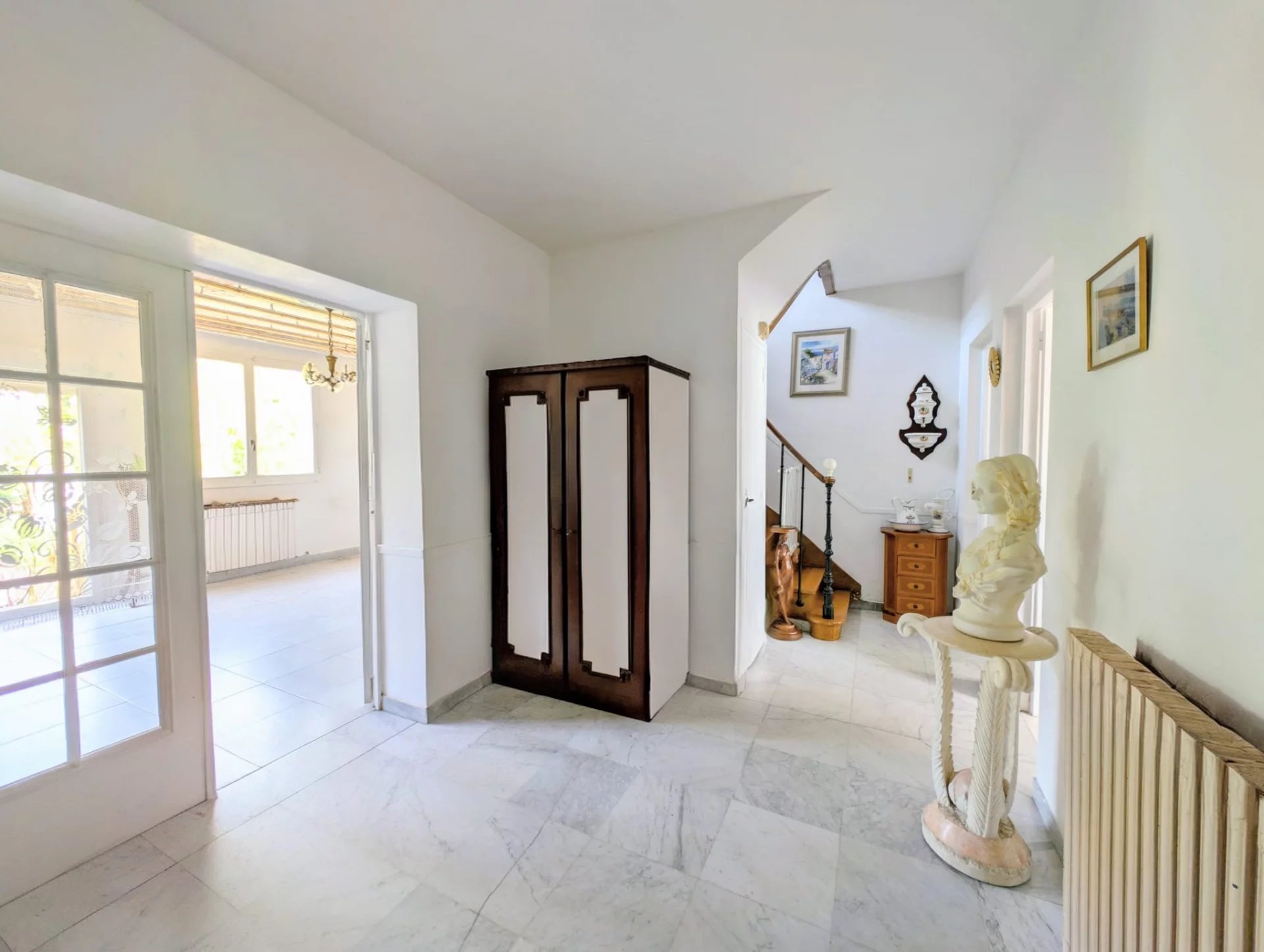 En rez-de-chaussée : un vaste vestibule d’entrée desservant un séjour lumineux, une cuisine indépendante, une salle de bain et des WC séparés.