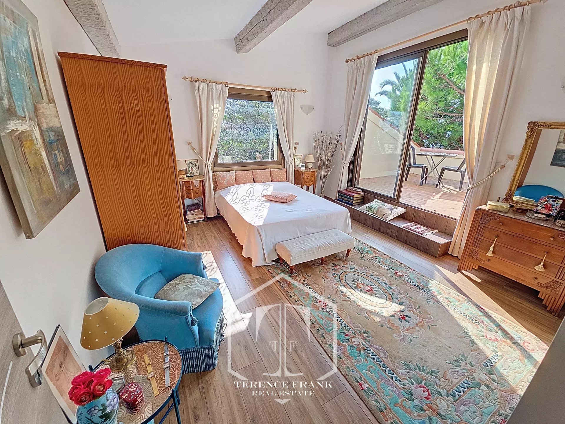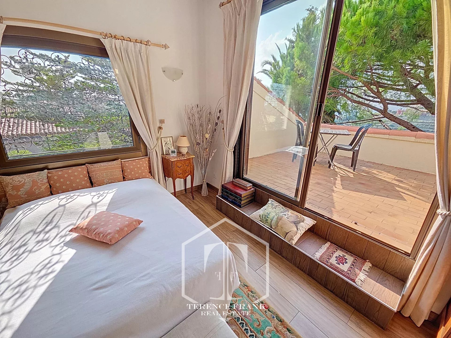 Une magnifique suite parentale (Master Bed-room) avec ses grands placards intégrés et un accès direct à une terrasse tropézienne offrant une vue dégagée sur les collines et le château du Crémat.