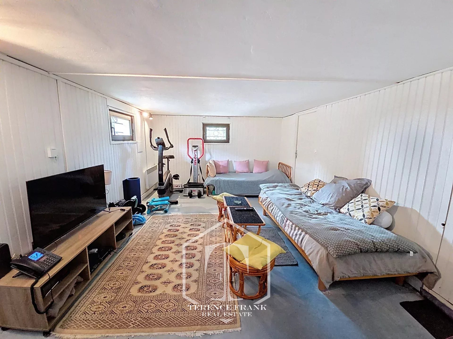 En entresol, une belle pièce de vie de 18 m² actuellement aménagée en salle de jeux s’accompagne d’un coin buanderie, d’une salle de douche avec WC et d’une spacieuse cave de plus de 18 m², vous aurez la possibilité de le créer en un adorable coquet grand studio indépendant.