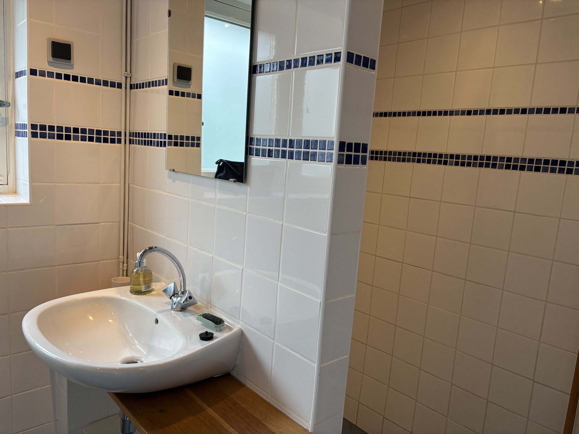 Au rez-de-chaussée, attenant à la cuisine, une porte mène à un couloir desservant une troisième chambre spacieuse et une salle d'eau équipée d'une douche à l'italienne, d'un lavabo, de toilettes et d'un raccordement pour lave-linge.