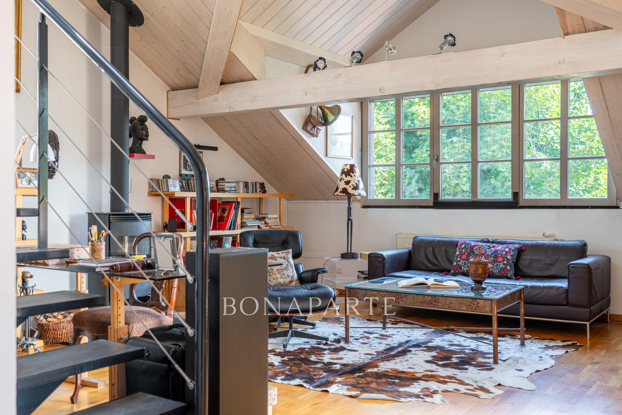 - Une mezzanine accueillant un second grand salon intimiste (pouvant aussi faire office de chambre)