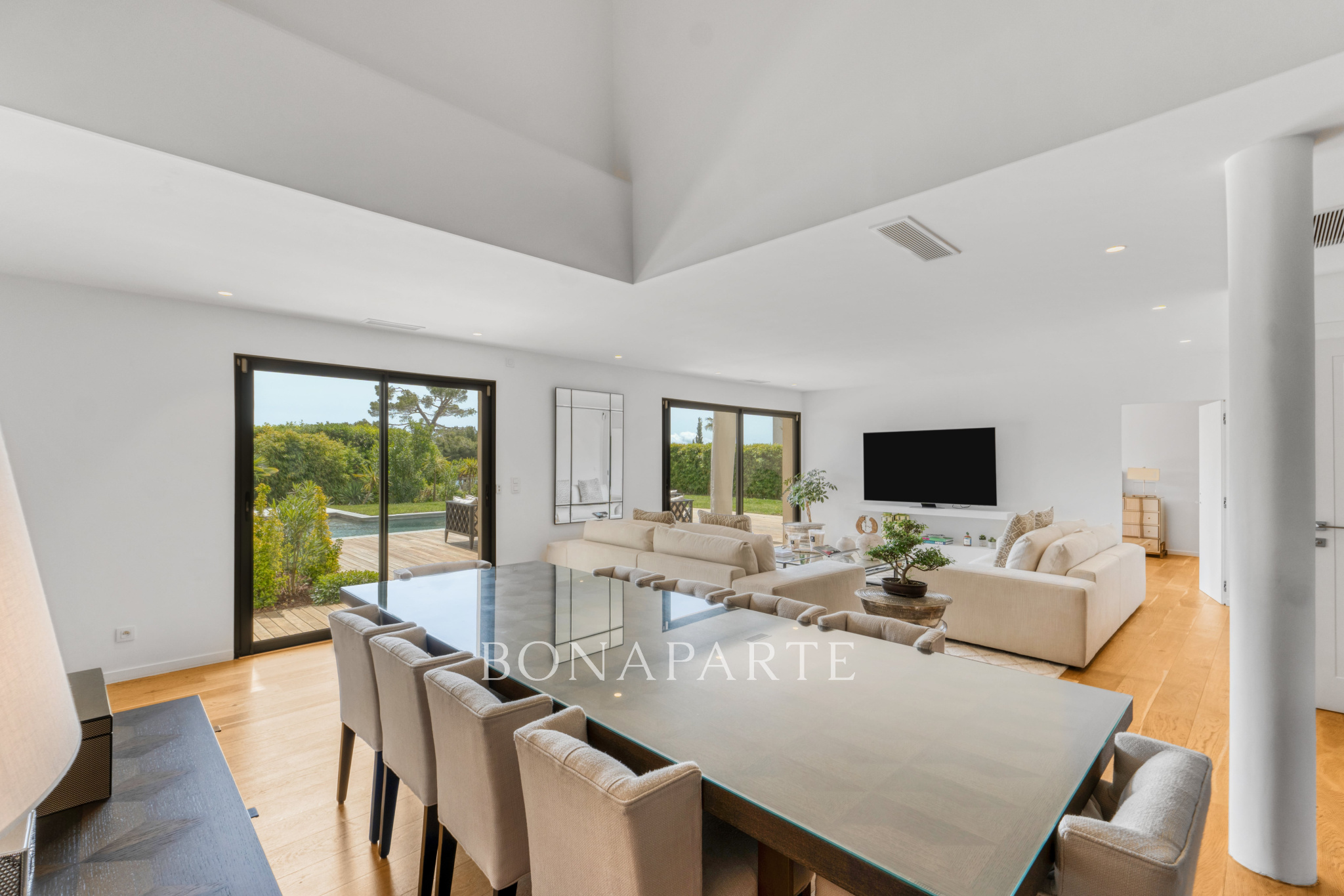 Une vaste terrasse ouvre sur la piscine et le jardin paysager, créant un espace de détente idéal.