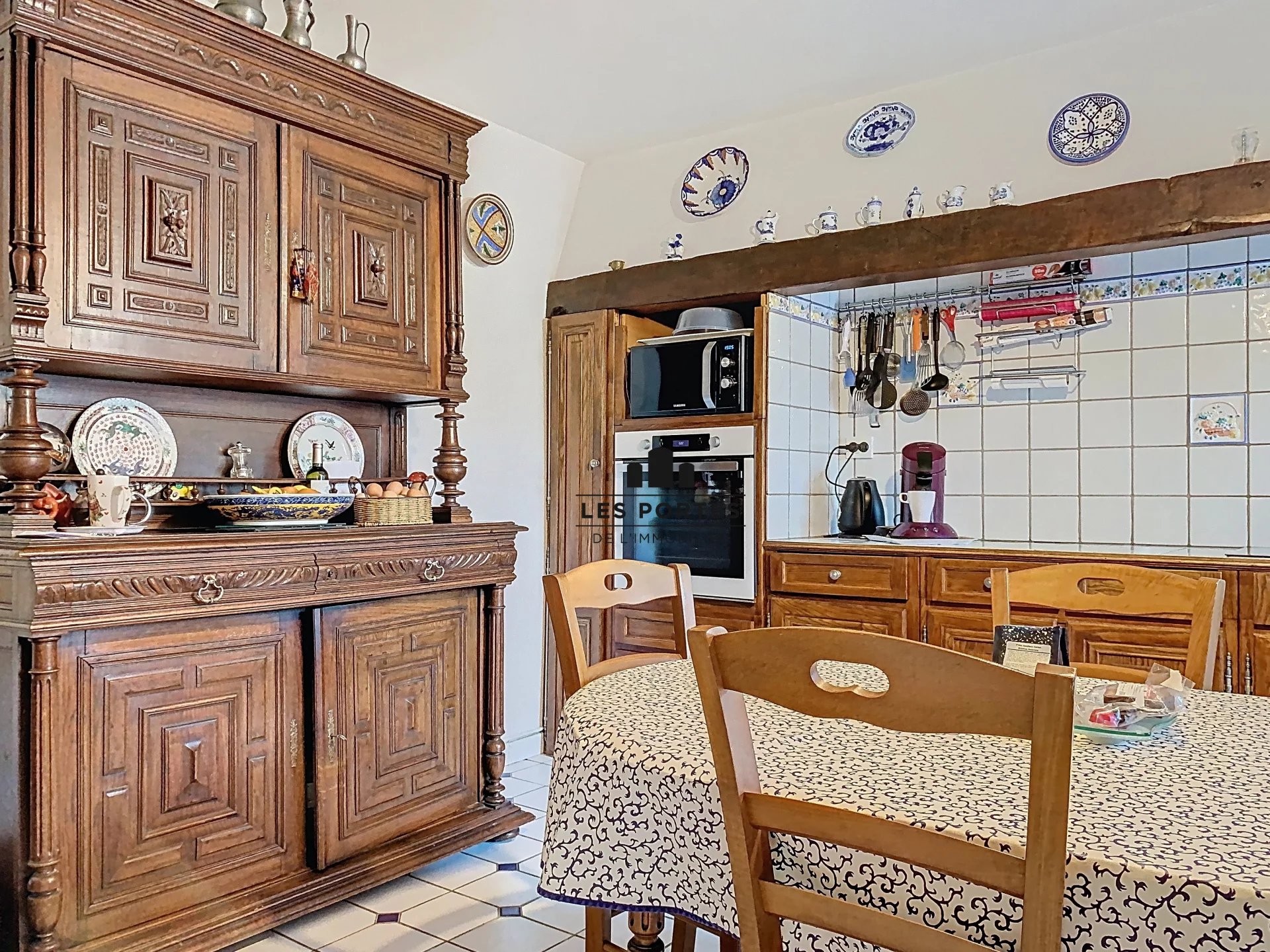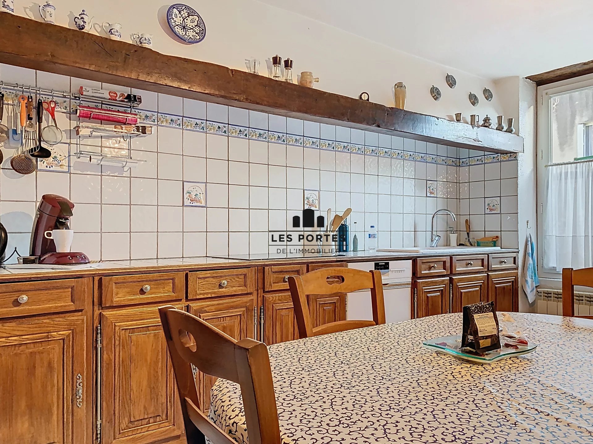 La cuisine rustique aménagée et équipée de 18 m² s’inscrit parfaitement dans l’esprit de la maison. Un WC avec lave-mains et une buanderie complètent ce niveau.