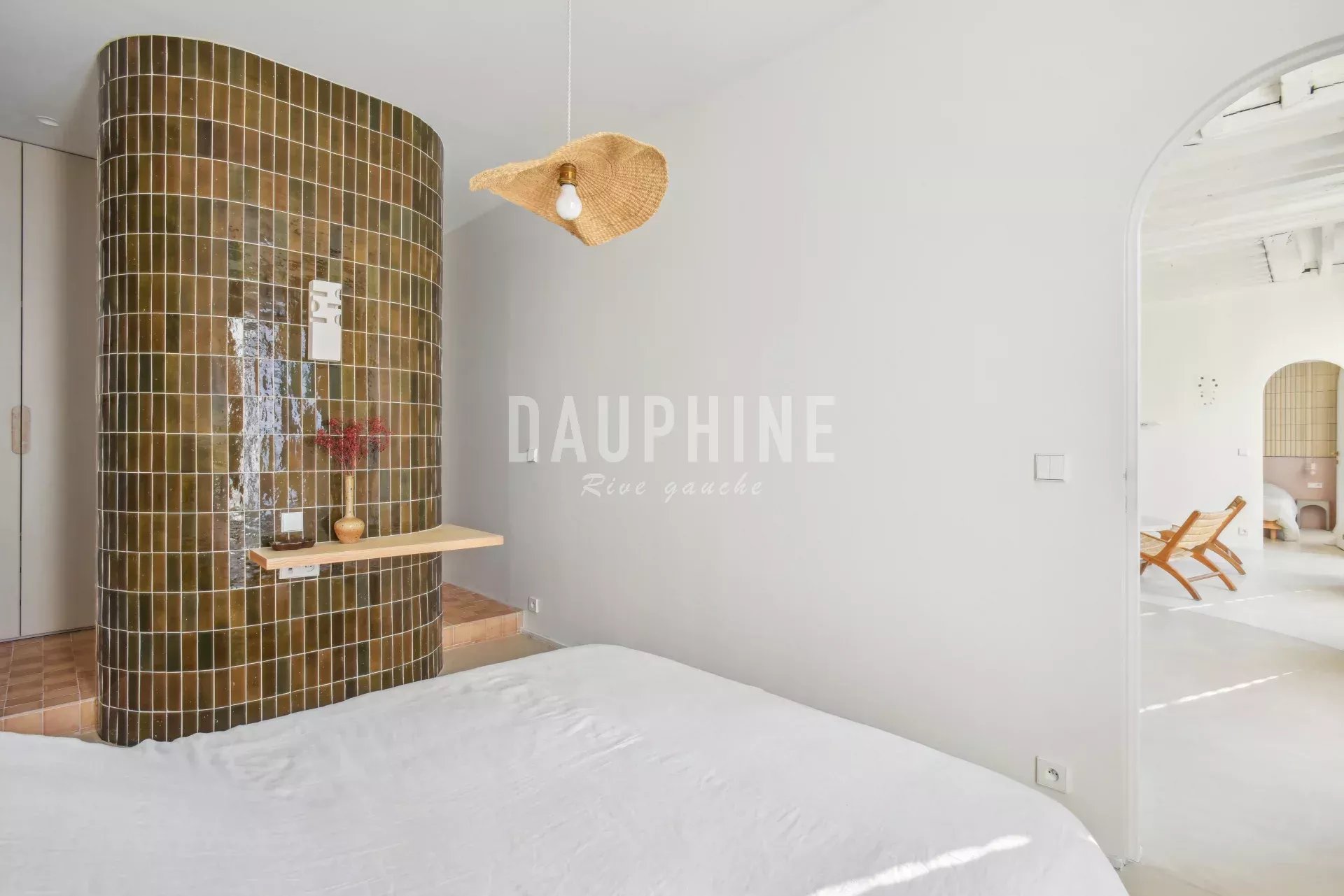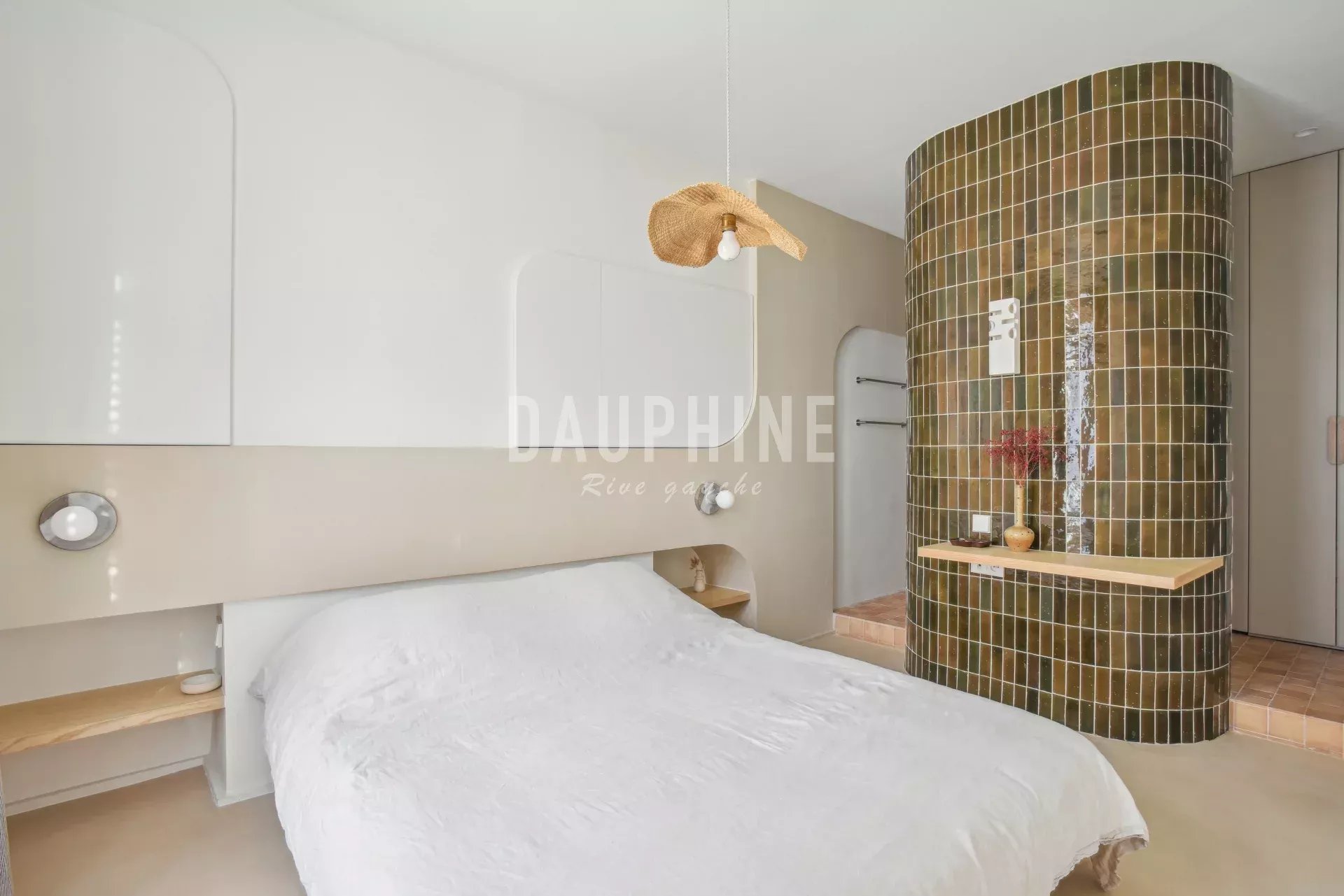 Ce bien unique se compose d’une entrée discrète ouvrant sur un vaste séjour baigné de lumière, avec de superbes volumes et une hauteur sous plafond mettant en valeur une cuisine américaine parfaitement intégrée.