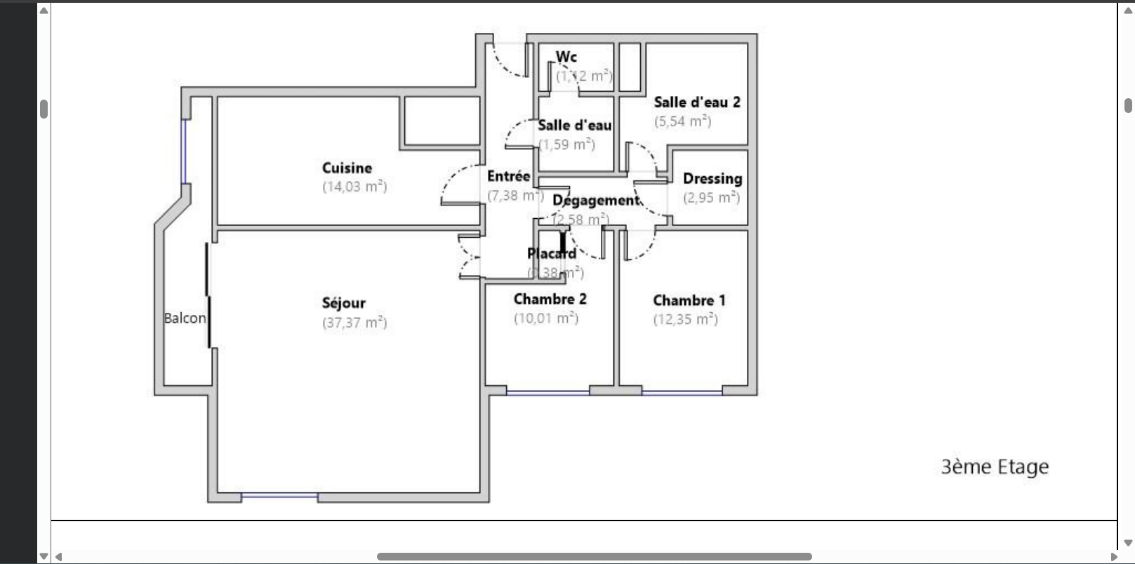 Belle entrée avec vestiaire, cuisine aménagée 14 m2, grand séjour lumineux une fenêtre + une baie coulissante pour accéder au balcon de 9 m2, exposition Sud Est, sans vis-à-vis, un espace nuit comprenant deux chambres de 12 m2 dont une avec un placard, un dressing 3 m2 , wc indépendant , une salle d'eau et une salle de douche
