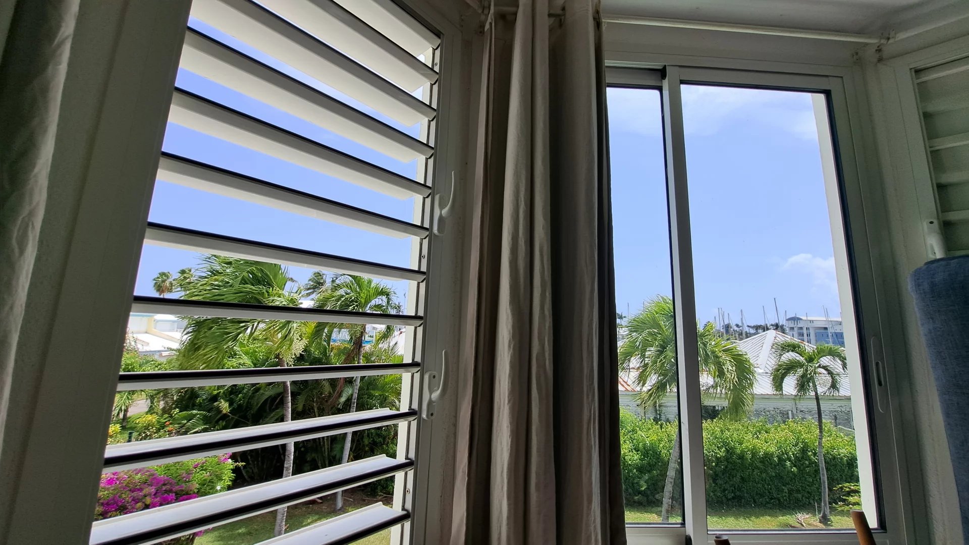 Le studio propose une cuisine moderne et fonctionnelle, ouverte sur une pièce de vie lumineuse et climatisée faisant office de salon et de chambre. Les larges fenêtres offrent une vue dégagée sur le jardin tropical et la marina, créant une atmosphère apaisante au quotidien.